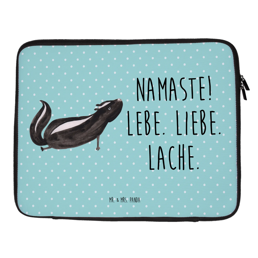 Die Notebook Tasche Stinktier Yoga von Mr. & Mrs. Panda ist die perfekte Wahl für all jene, die ihren Laptop stilvoll und sicher transportieren möchten. Sie besitzt ein zauberhaftes Motiv eines zufriedenen Stinktiers, das Yoga praktiziert - handgezeichnet im wunderschönen Aquarellstil.