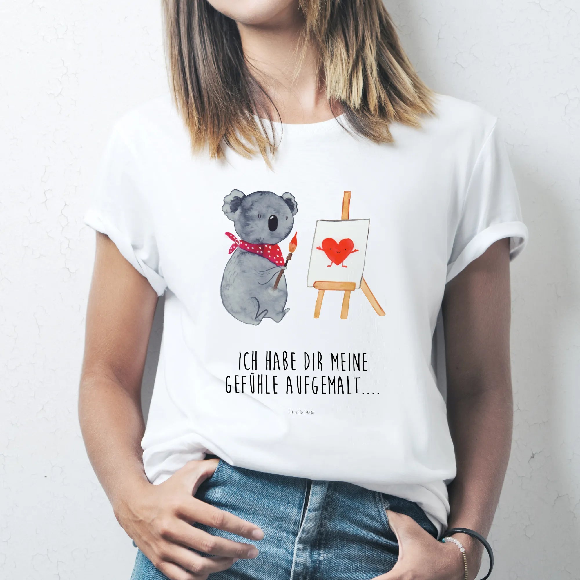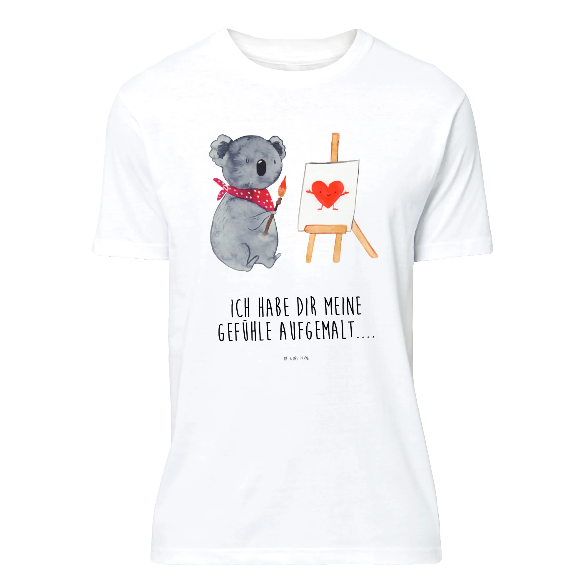 Die Koala Kollektion von Mr. & Mrs. Panda ist eine liebevolle Sammlung, die für all die Langschläfer und Koala-Fans da draußen gestaltet wurde. Hol dir ein Stück dieses australischen Flairs direkt ins Haus und bringe Freude und Liebe in jeden Tag! Du kannst das T-Shirt selbst tragen oder es als besonderes Liebesgeschenk an einen besonderen Menschen verschenken. "Ich habe dir meine Gefühle aufgemalt...." – dieser Slogan ist zwar nicht im Design enthalten, aber das Gefühl und die Botschaft dieses Stücks sind klar: Liebe und Kreativität gehören hand-in-hand!
