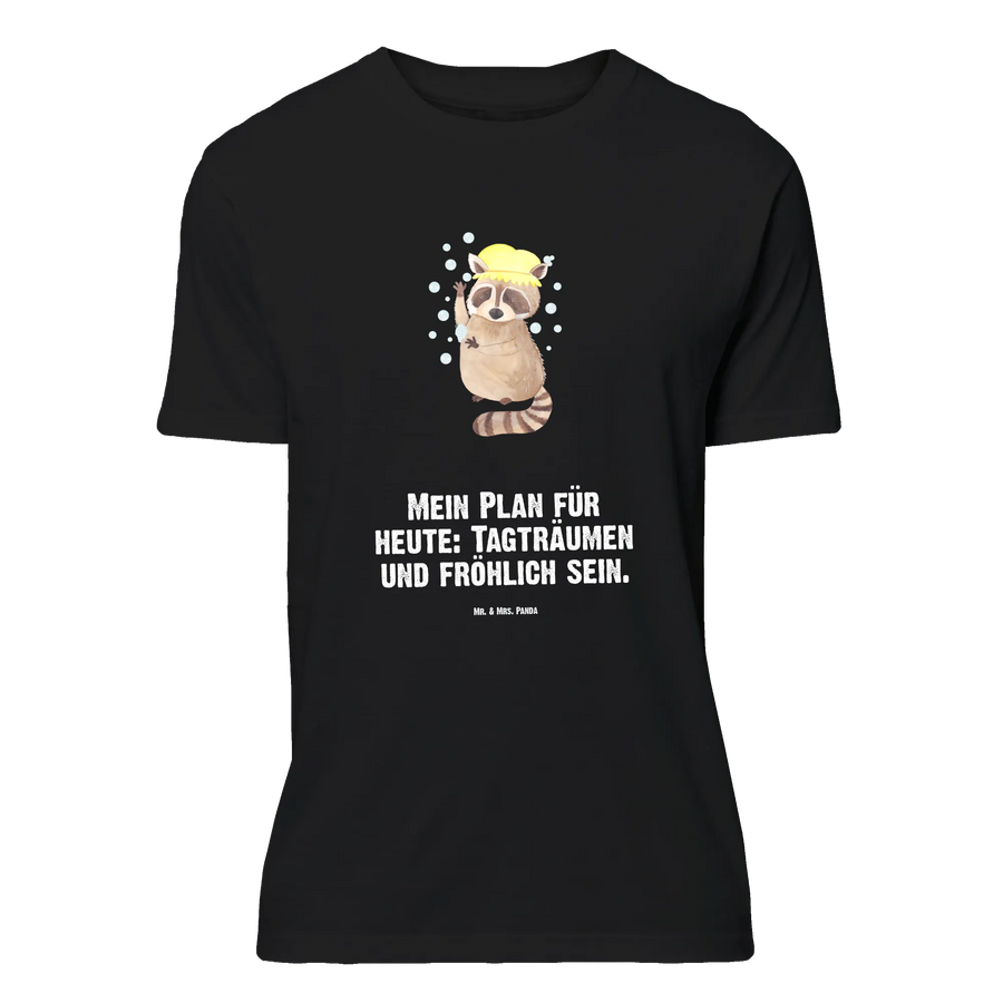 Der freche Waschbär steht vergnügt unter der Dusche, Seifenblasen tanzen um ihn herum und der Spruch „Mein Plan für heute: Tagträumen und fröhlich sein.“ macht das Motiv zur perfekten Gute-Laune-Botschaft. Dieses T-Shirt eignet sich wunderbar als Geschenk für Geburtstag, Jubiläum oder als witziges Mitbringsel beim Junggesellenabschied.