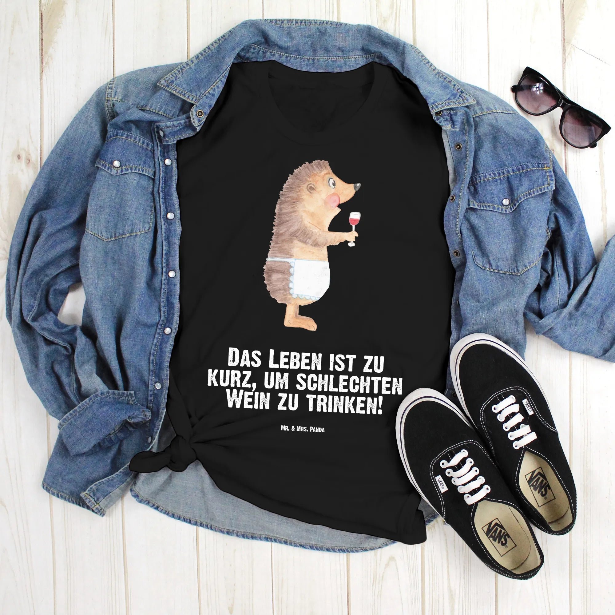Dieses schwarze T-Shirt aus der Small World Kollektion von Mr. & Mrs. Panda zeigt einen herzallerliebsten Igel, der genüsslich aus einem Rotweinglas schlürft. Der freche Spruch „Das Leben ist zu kurz, um schlechten Wein zu trinken!” rundet das Motiv perfekt ab und macht das Shirt zum ultimativen Geschenk für Weinliebhaber und Freunde humorvoller Tiermotive.