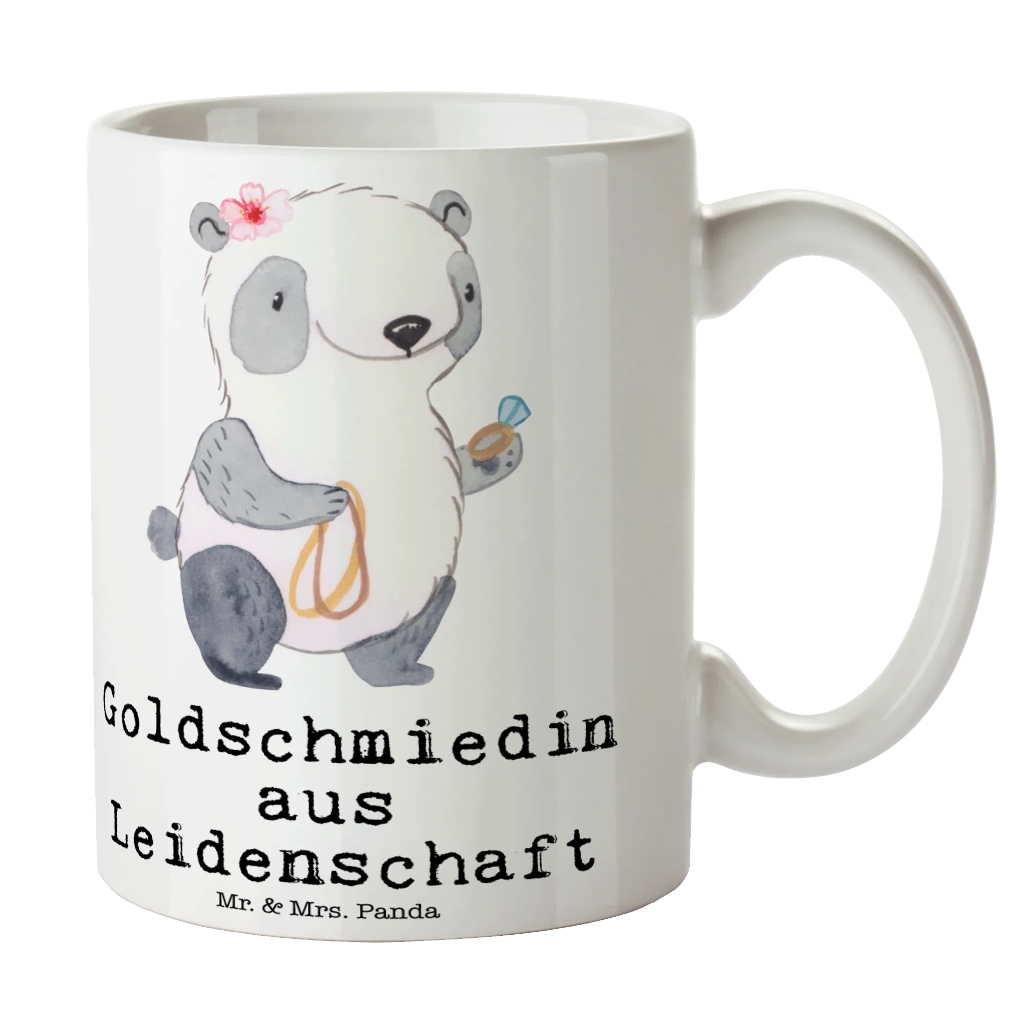 Die Tasse "Goldschmiedin aus Leidenschaft" von Mr. & Mrs. Panda ist der perfekte Begleiter für alle leidenschaftlichen Goldschmiede und Schmuckliebhaber! Diese wunderschöne Keramiktasse vereint Funktionalität mit einem charmanten Design, das das Herz jeder Juwelierin höher schlagen lässt. Das liebevoll gestaltete Motiv zeigt einen süßen Panda, der stolz seinen Goldschmuck präsentiert.