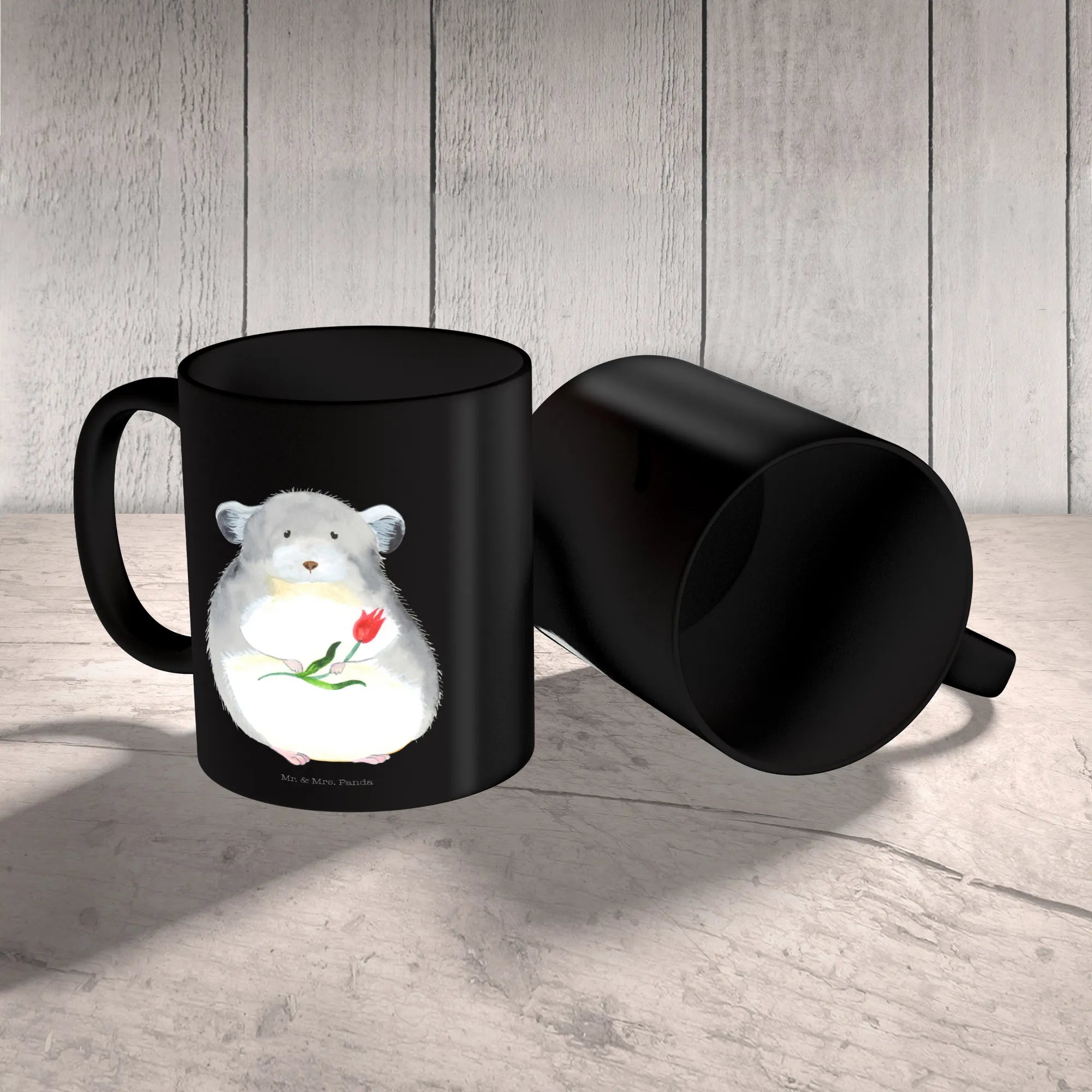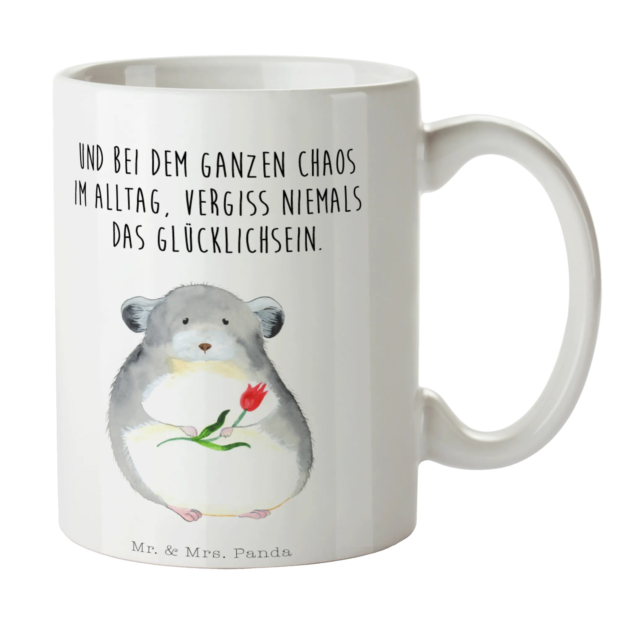 Das niedliche Chinchilla, das mit großen Augen eine Blume hält, strahlt pure Herzenswärme aus und erinnert dich daran, trotz des Chaos im Büro oder Alltag nicht das Glücklichsein zu vergessen. Mit einer Füllmenge von 325 ml ist sie ideal für deinen Lieblingskaffee oder -tee und sorgt für gute Laune bei jedem Schluck.