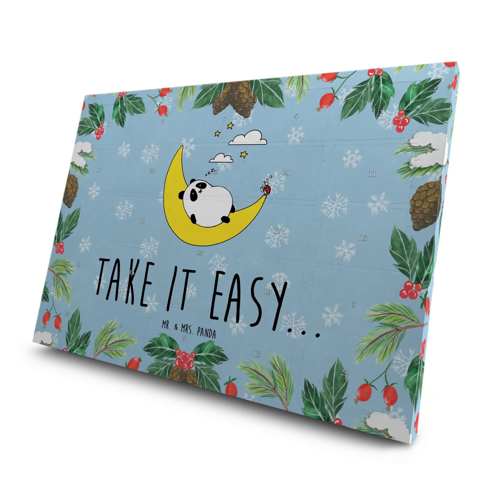 Der Tee Adventskalender "Easy & Peasy Take it Easy" von Mr. & Mrs. Panda ist der perfekte Begleiter für die besinnliche Vorweihnachtszeit. Mit seinen 24 liebevoll verpackten Teesorten im Pyramidenbeutel bringt er nicht nur Genuss, sondern auch Gemütlichkeit in dein Zuhause. Das wunderschöne, handgezeichnete Motiv zeigt einen niedlichen Panda, der zufrieden auf einer Mondsichel schläft, während ein kleiner Marienkäfer ihm Geschichten zum Einschlafen vorliest. Auf diesem attraktiven Adventskalender kannst du jeden Tag ein neues First-Class Tee-Erlebnis entdecken, während du die hektische Weihnachtsvorbereitung hinter dir lässt.