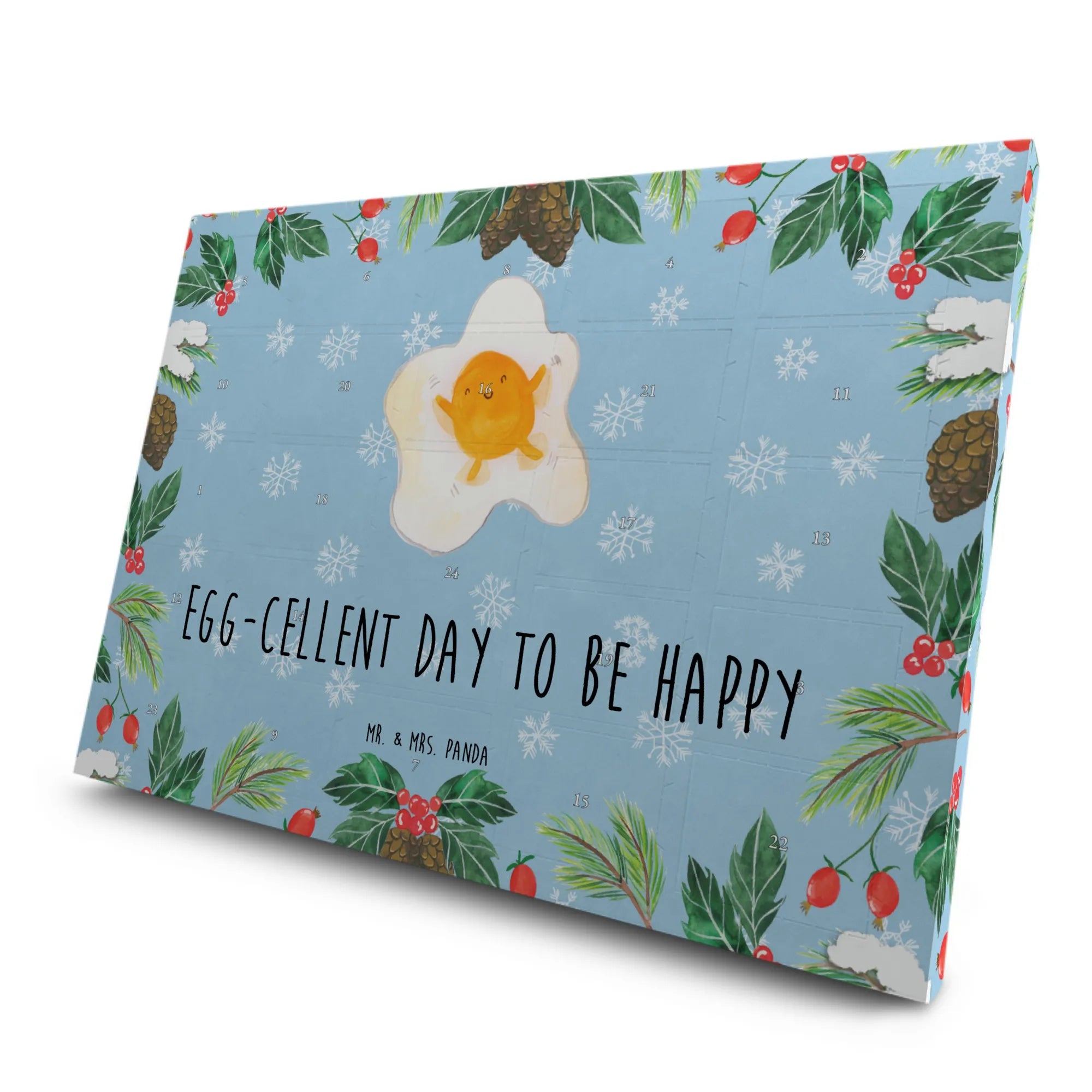 Das Spiegelei-Motiv mit dem herzlichen Slogan "Egg-cellent day to be happy" erinnert uns daran, jeden Tag mit einem Lächeln zu beginnen. Auch Kinder werden von dem süßen Schneeengel im Eidotter begeistert sein! Dieser Adventskalender kann aufgehängt oder aufgestellt werden und dekoriert somit jeden Raum.