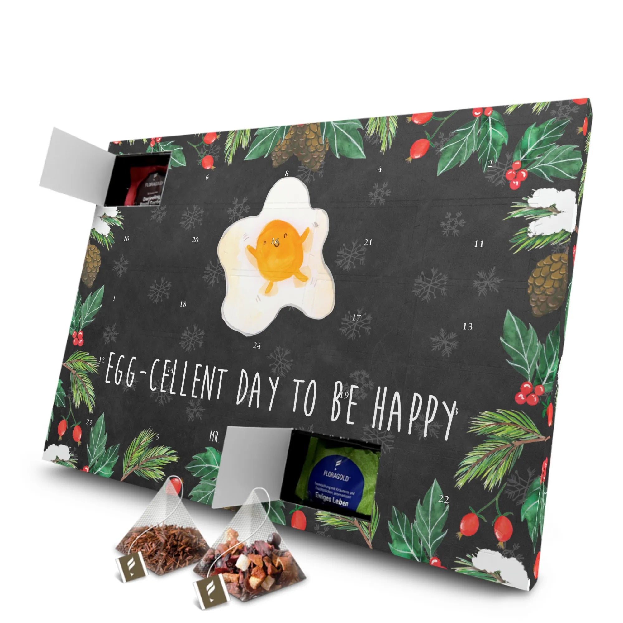 Entdecke den liebevoll gestalteten Tee Adventskalender mit dem fröhlichen Spiegelei-Motiv aus der beliebten Small World Kollektion von Mr. & Mrs. Panda! Dieser Adventskalender ist nicht nur ein süßer Blickfang, sondern auch eine wunderbare Möglichkeit, die Vorweihnachtszeit zu zelebrieren. Mit seinem witzigen Spruch "Egg-cellent day to be happy" sorgt er für ein Lächeln auf deinem Gesicht und bringt gute Laune in jeden Tag.