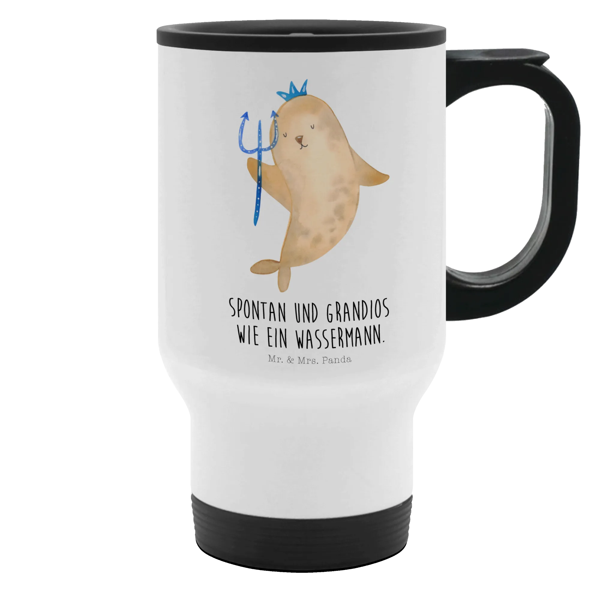 Der wunderschöne Thermobecher Sternzeichen Wassermann von Mr. & Mrs. Panda ist der perfekte Begleiter für alle Wassermann-Geborenen. Mit einem liebevoll handgezeichneten Motiv einer Krone tragenden Robbe und dem Motto "Spontan und grandios wie ein Wassermann" bringt dieser Isolierbecher nicht nur Farbe in den Alltag, sondern auch ein Lächeln auf die Gesichter der Beschenkten.