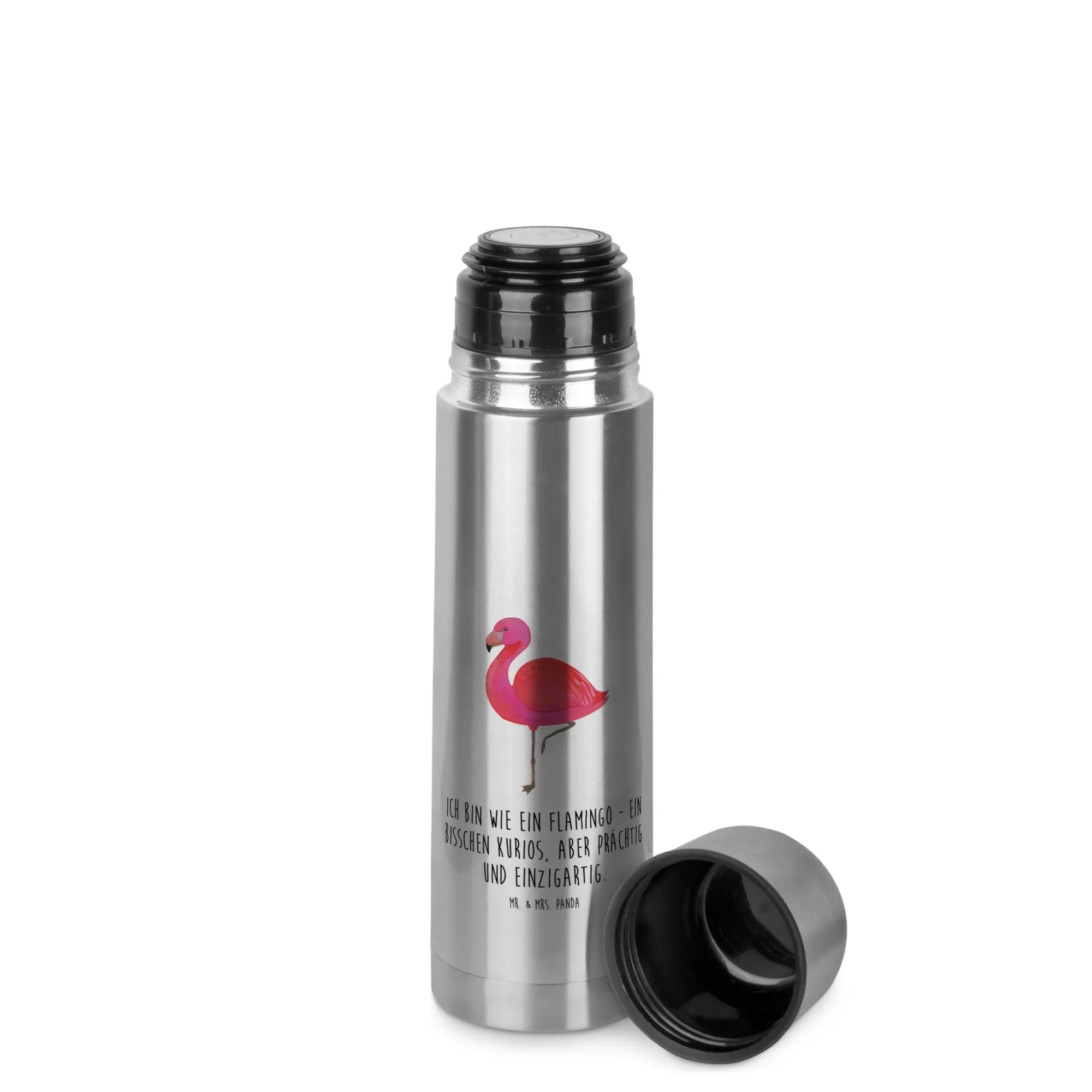 Entdecke die wunderschöne Thermoskanne mit dem charmanten Flamingo-Motiv aus der exklusiven Flamingo-Kollektion von Mr. & Mrs. Panda! Diese Thermoskanne ist nicht nur ein praktischer Begleiter für unterwegs, sondern auch ein eyecatcher mit ihrem einzigartigen Design und dem Spruch: "Ich bin wie ein Flamingo - ein bisschen kurios, aber prächtig und einzigartig".