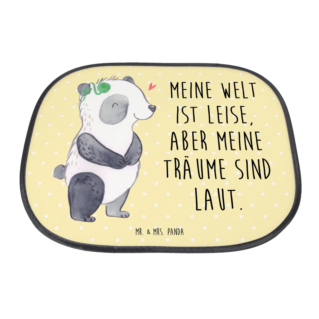 Unser Sonnenschutz Auto von Mr. & Mrs. Panda zeigt Poldi Panda mit Cochlea-Implantat auf einem warmen gelben Pastellhintergrund. Der Slogan „Meine Welt ist leise, aber meine Träume sind laut.“ macht den Sonnenschutz zu einem respektvollen Statement für Menschen mit Hörbehinderung und für Inklusion.