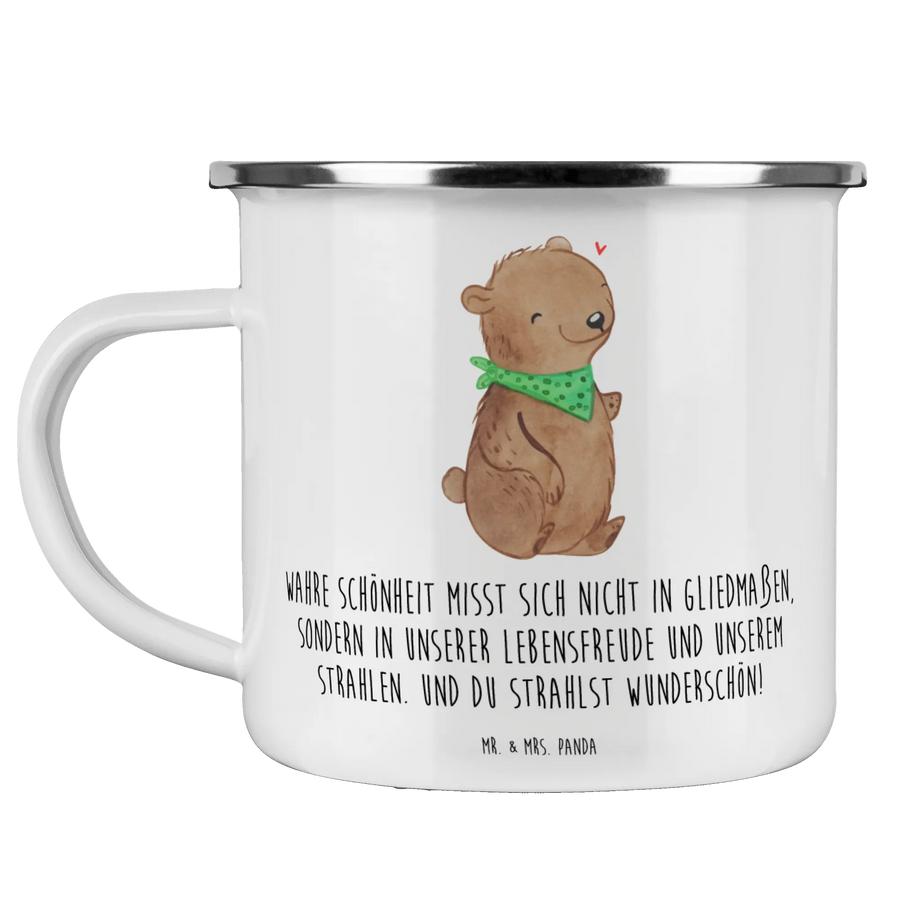 Die Camping Emaille Tasse mit dem bezaubernden Motiv "Bär Dysmelie" von Mr. & Mrs. Panda ist ein ganz besonderes Geschenk für Menschen, die ihren Alltag mit einem Handicap meistern. Diese Tasse ist nicht nur praktisch, sondern trägt auch eine wichtige Botschaft: Wahre Schönheit misst sich nicht in Gliedmaßen, sondern in unserer Lebensfreude und unserem Strahlen. Auf jedem Campingausflug oder bei einer Wanderung wird diese Tasse dein treuer Begleiter sein.