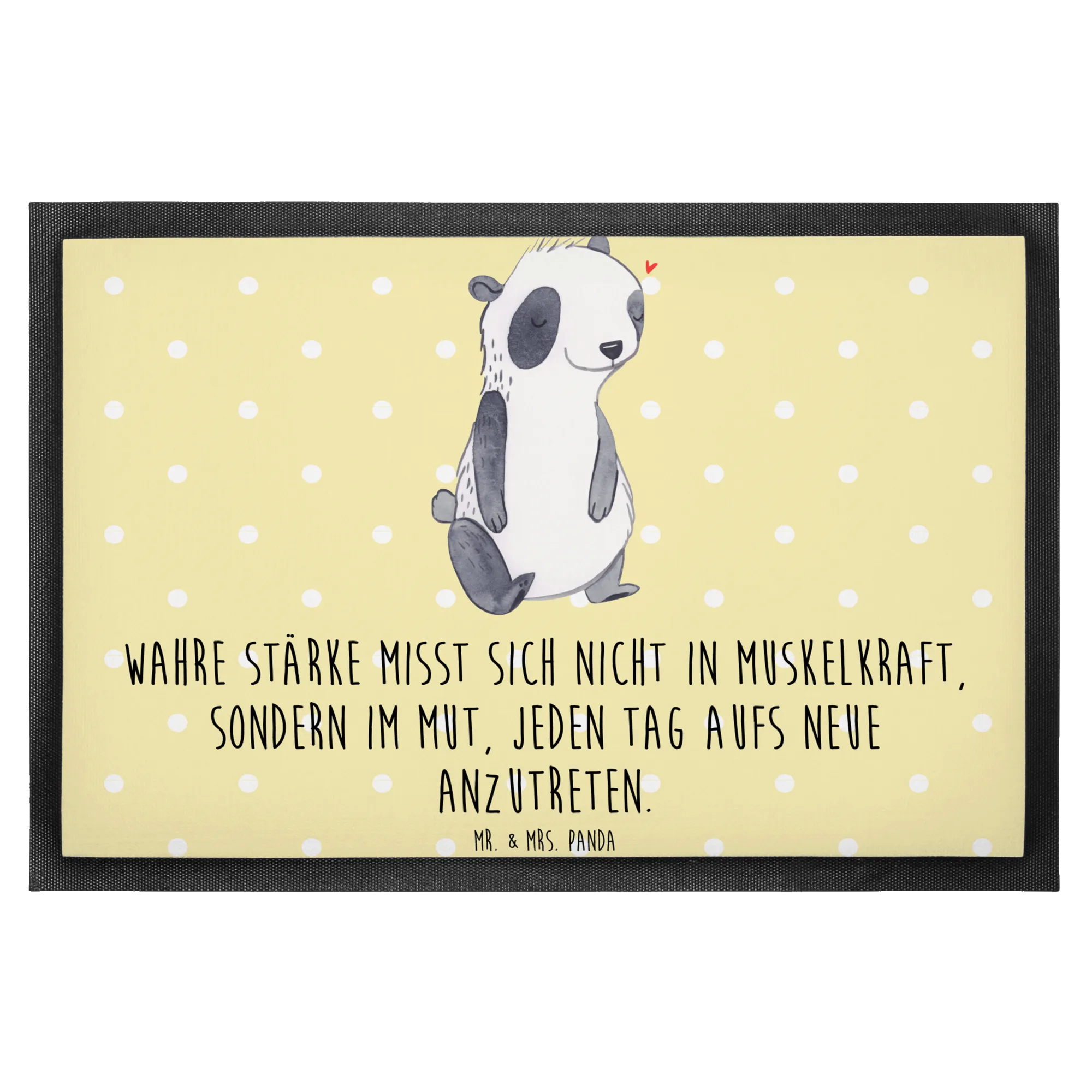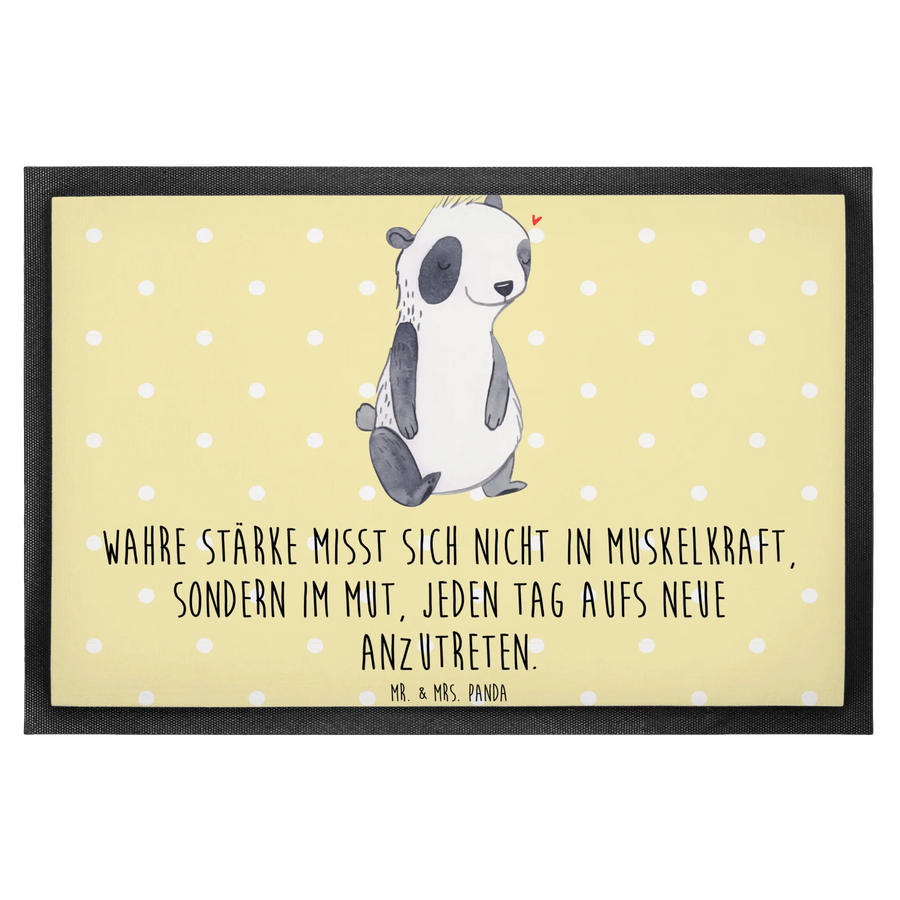 Die Fußmatte »Panda Muskelatrophie« von Mr. & Mrs. Panda ist nicht nur eine einfache Schmutzmatte, sondern ein Teil einer besonderen Botschaft. Mit ihrem einzigartigen Design und dem einprägsamen Slogan „Wahre Stärke misst sich nicht in Muskelkraft, sondern im Mut, jeden Tag aufs Neue anzutreten.“ drückt sie Respekt und Anerkennung für alle Menschen aus, die mit einem Handicap leben. Sie gehört zur Kollektion „Tiere mit Superkräften“, die Menschen mit Behinderungen eine Stimme gibt und sie in ihrer Stärke ermutigt.