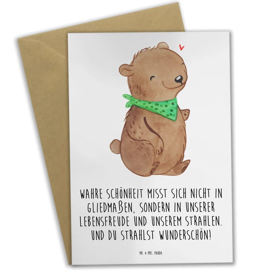 Die Grußkarte Bär Dysmelie aus der bereits faszinierenden Kollektion "Tiere mit Superkräften" von Mr. & Mrs. Panda ist das perfekte Geschenk für diejenigen, die ihre Mitmenschen mit einer ganz besonderen Botschaft erreichen möchten. Diese wunderschöne und einzigartige Klappkarte spricht Menschen an, die ihren Alltag mit einem Handicap meistern. Die Botschaft "Wahre Schönheit misst sich nicht in Gliedmaßen, sondern in unserer Lebensfreude und unserem Strahlen. Und du strahlst wunderschön!" bringt eine positive und respektvolle Anerkennung an Menschen, deren Lebensweg anders verläuft.