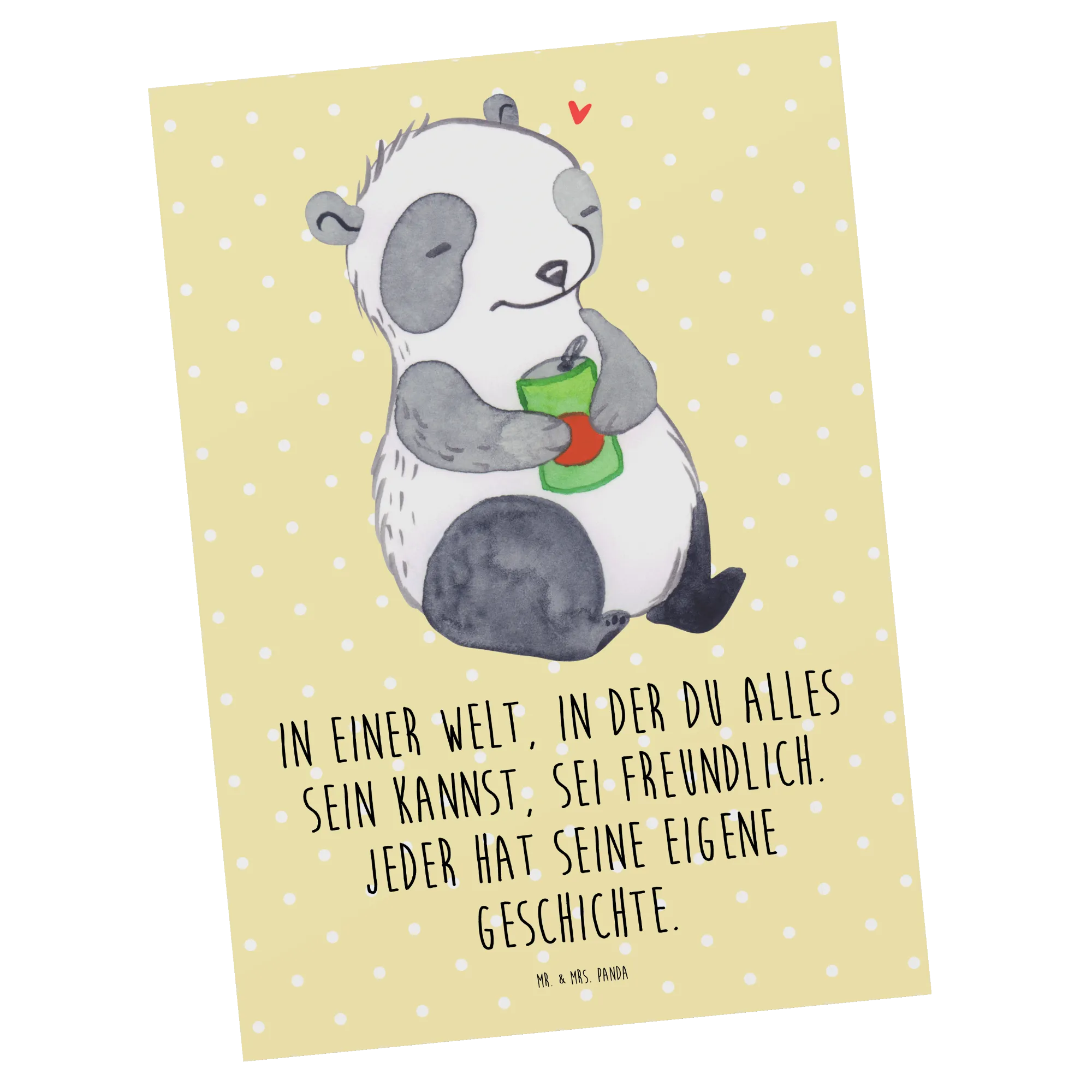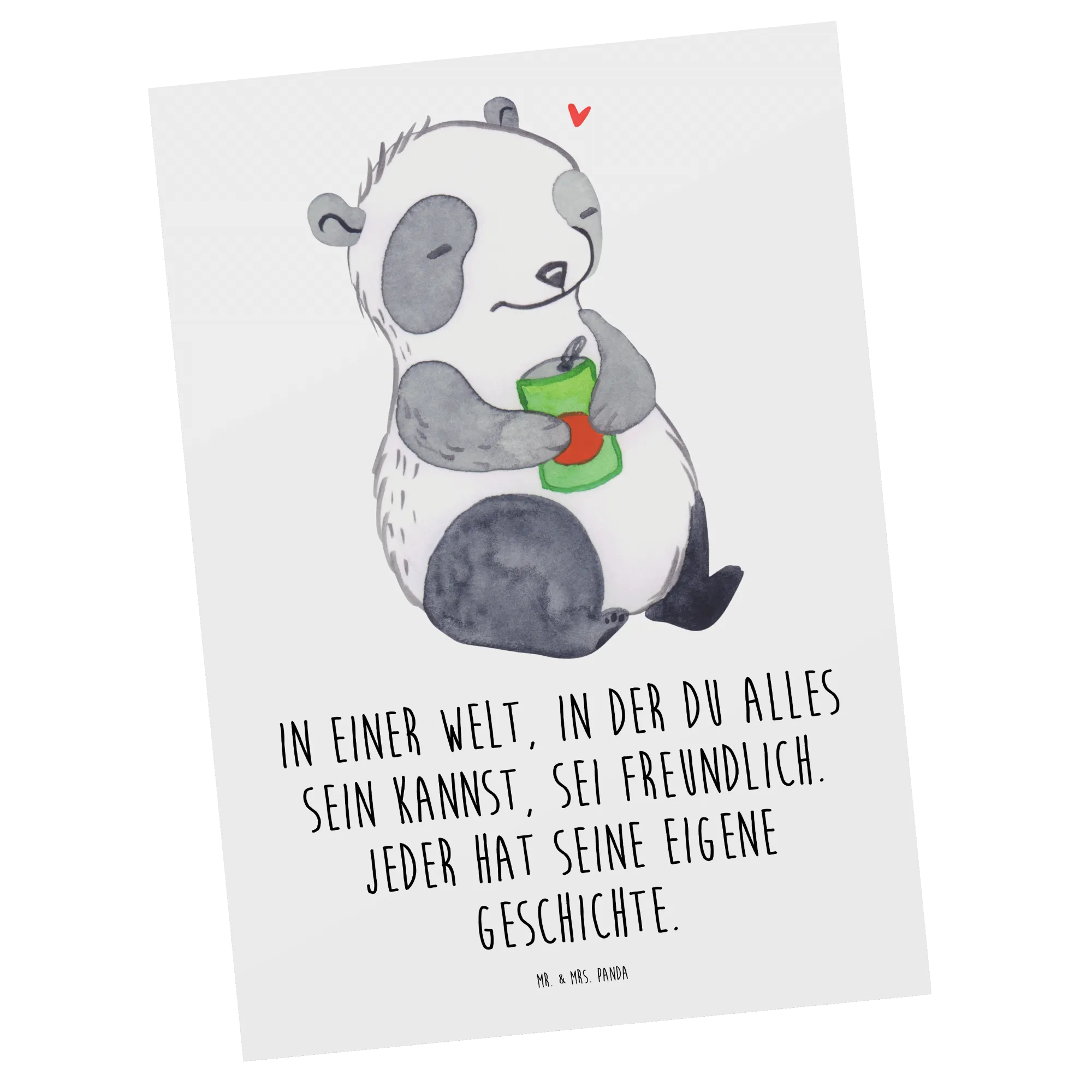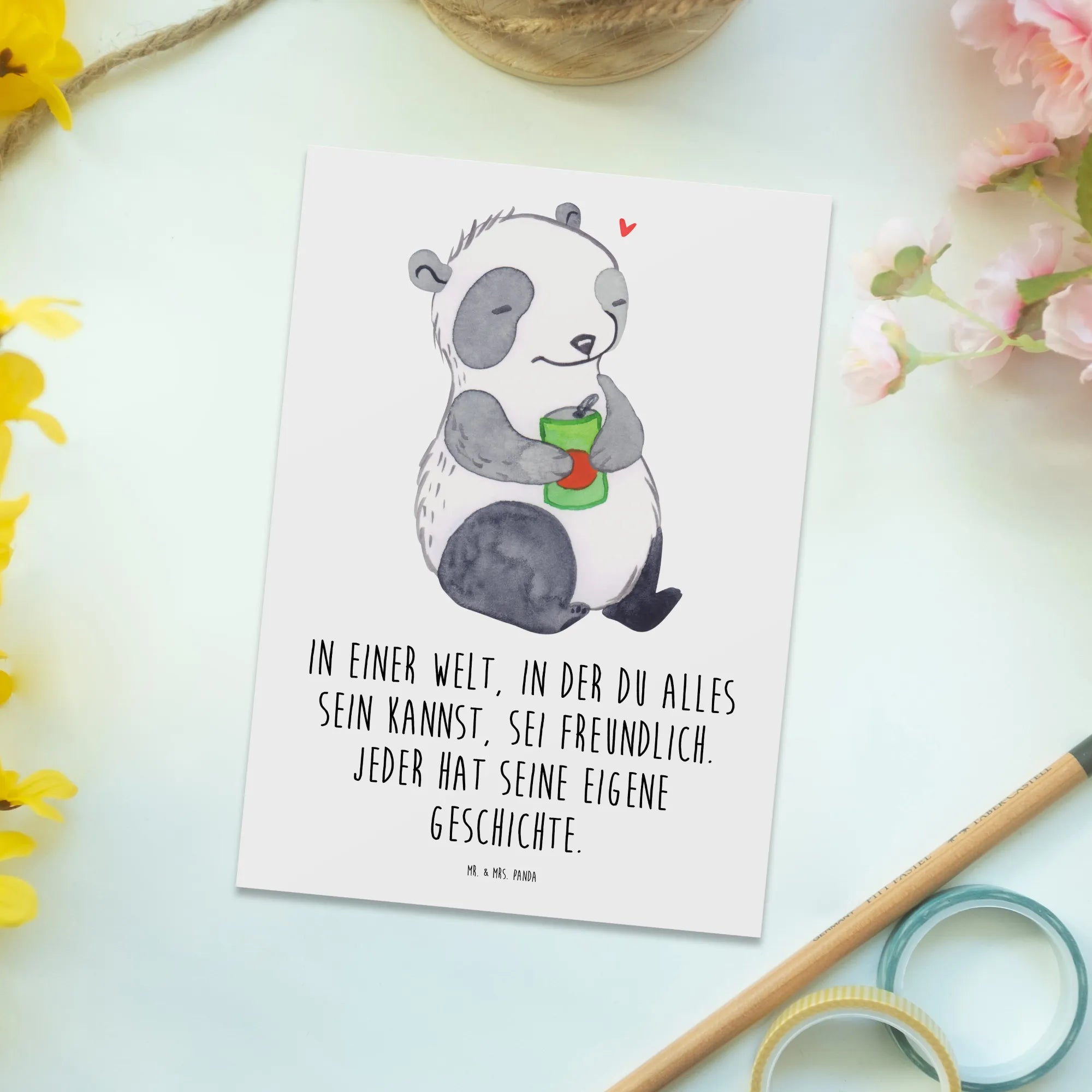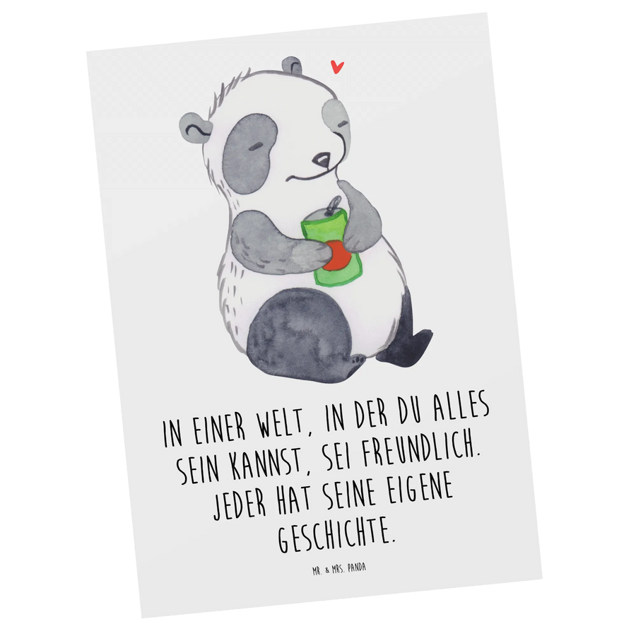 Entdecke die bezaubernde Postkarte "Panda Depression" aus der Kollektion "Tiere mit Superkräften" von Mr. & Mrs. Panda. Diese besondere Grußkarte ist nicht nur ein liebevolles Design, sondern auch ein Zeichen des Verständnisses für die Herzen der Menschen, die mit Depressionen oder affektiven Störungen zu kämpfen haben. Das niedliche Panda-Motiv, das einen nachdenklichen Blick mit einer Getränkedose in der Hand zeigt, spricht große Wahrheiten über das Leben und das Gefühl der Antriebslosigkeit an. Mit dem Slogan "In einer Welt, in der du alles sein kannst, sei freundlich. Jeder hat seine eigene Geschichte." vermittelt diese Karte sowohl Trost als auch Zuversicht.
