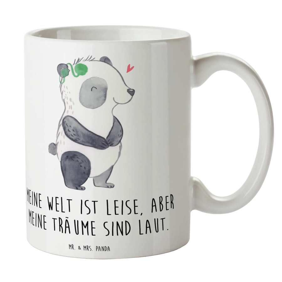 Du suchst nach dem perfekten Geschenk für einen besonderen Menschen in deinem Leben? Dann ist die Tasse mit dem Motiv "Panda Gehörlos" aus der Kollektion "Tiere mit Superkräften" von Mr. & Mrs. Panda genau das Richtige! Diese wunderschöne spülmaschinenfeste Keramiktasse ist nicht nur praktisch, sondern auch ein echter Hingucker mit ihrem inspirierenden Spruch: "Meine Welt ist leise, aber meine Träume sind laut." Dieses Design ist ideal für Menschen, die ihren Alltag mit einem Handicap meistern, egal ob es sich um körperliche oder psychische Beeinträchtigungen handelt.