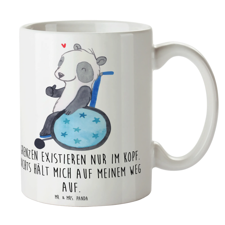 Stell dir vor, ein lieber Panda, der im Rollstuhl sitzt und dennoch optimistisch den Daumen nach oben hält. Dieses Bild steht für Stärke, Mut und die unerschütterliche Überzeugung, dass keine Grenzen uns auf unserem Weg aufhalten können. Der Spruch 'Grenzen existieren nur im Kopf. Nichts hält mich auf meinem Weg auf' bringt eine kraftvolle Botschaft mit, die uns daran erinnert, dass wir trotz aller Herausforderungen unser Leben voll und ganz leben können. Der fröhliche Panda im Rollstuhl symbolisiert, dass Glück und Erfüllung unabhängig von physischen oder psychischen Beeinträchtigungen möglich sind. Mr. & Mrs. Panda möchten mit diesem entzückenden Motiv zeigen, dass jeder von uns einzigartige Fähigkeiten besitzt und wir gemeinsam eine Welt der Inklusion und des Verständnisses schaffen können. Es ist eine Hommage an die unglaublichen Menschen, die jeden Tag ihre 'Superkräfte' nutzen, um Licht in den Schatten zu bringen.