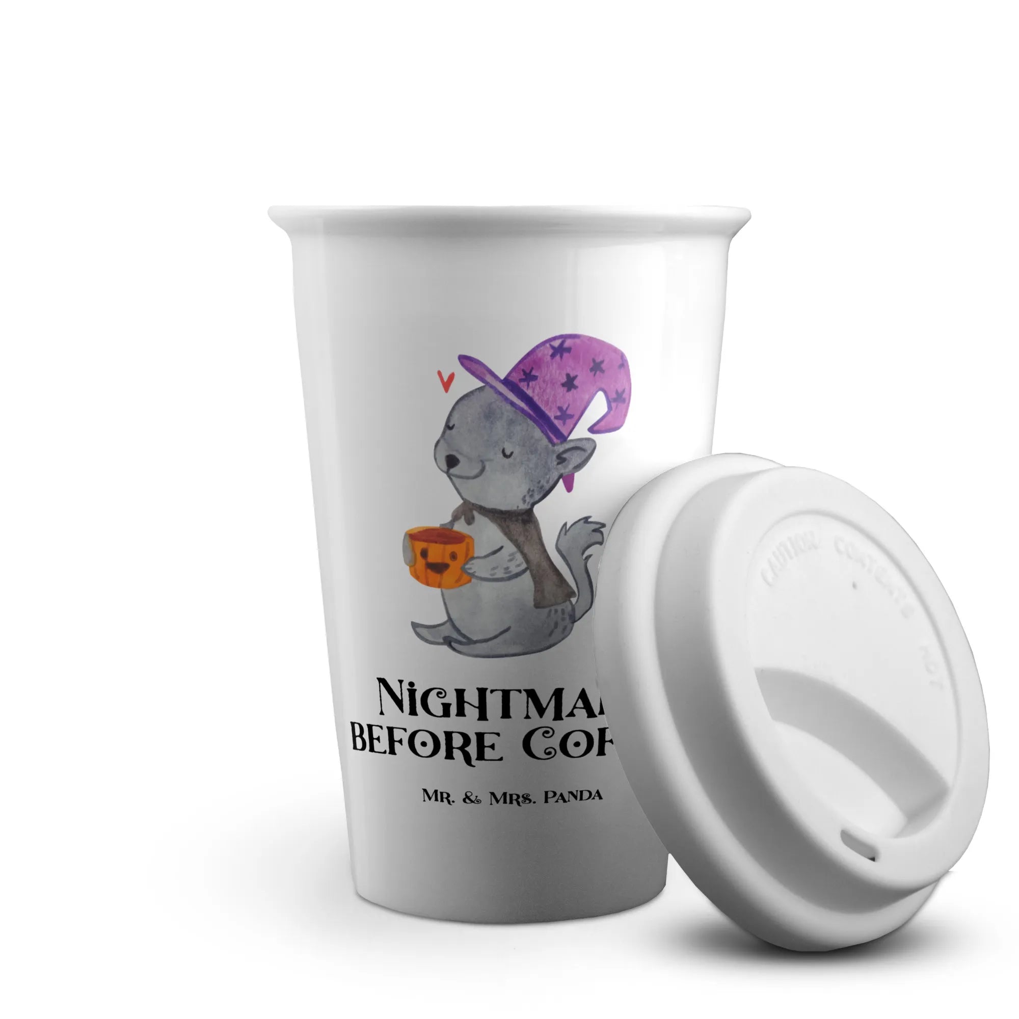 Dieser hochwertige Keramikbecher ist weit mehr als nur ein einfacher Reisebecher; er ist dein persönlicher Schutzgeist für den Weg zur Arbeit, die Uni oder den gemütlichen Herbstspaziergang. Das Motiv zeigt einen liebenswerten Hexenkater, der in seiner Kürbis-Kaffeetasse rührt und einen lila Sternenhut trägt. Mit dem frechen Slogan Nightmare before Coffee spricht er jedem Morgenmuffel aus der Seele. 🐱☕