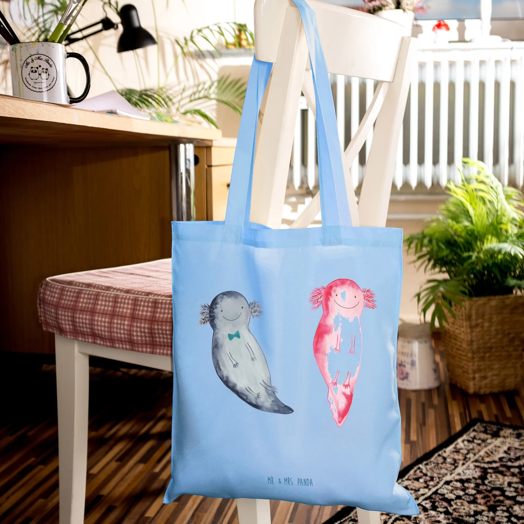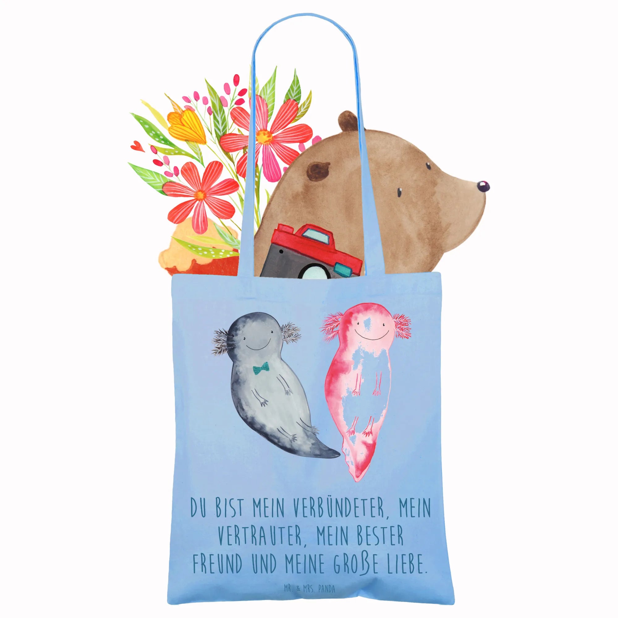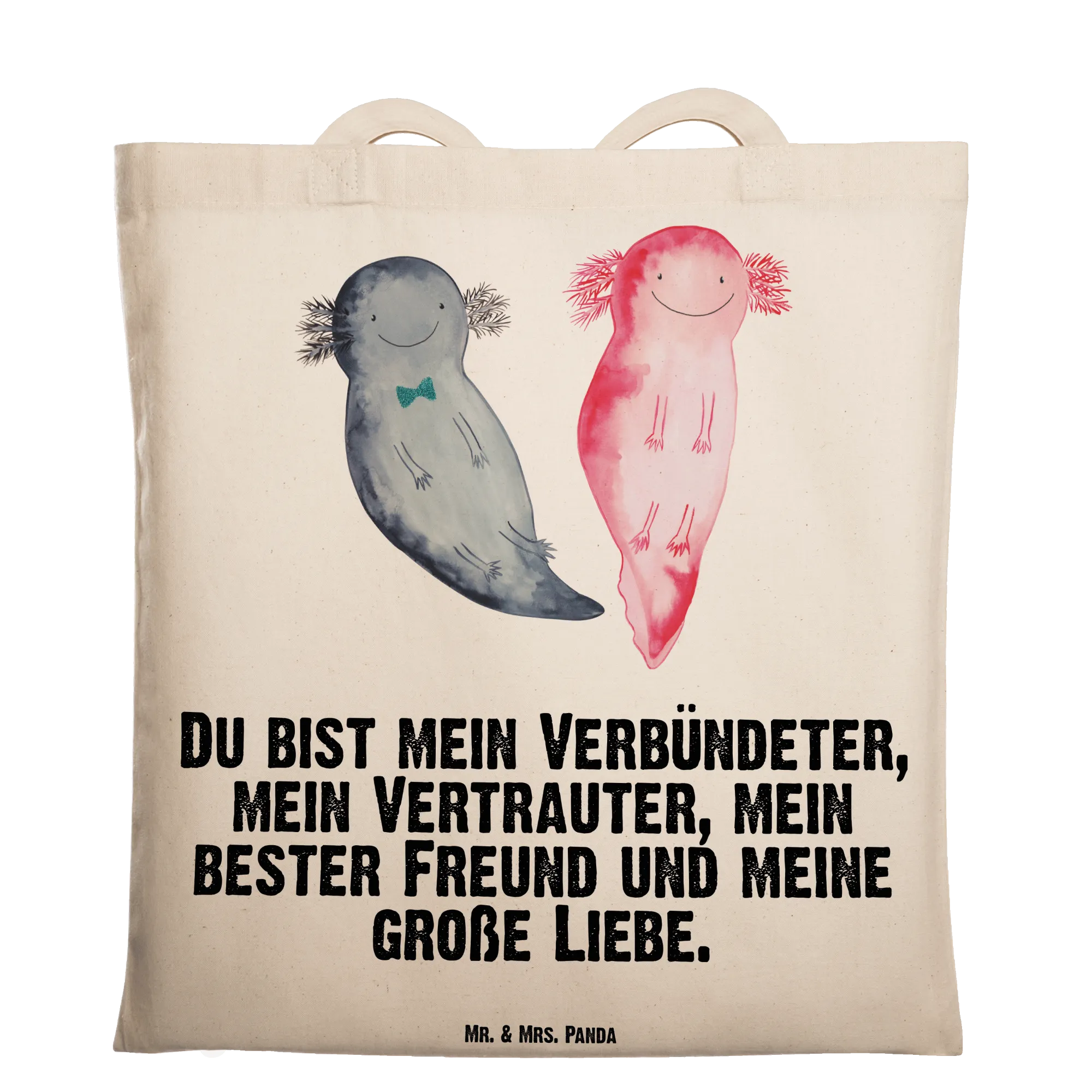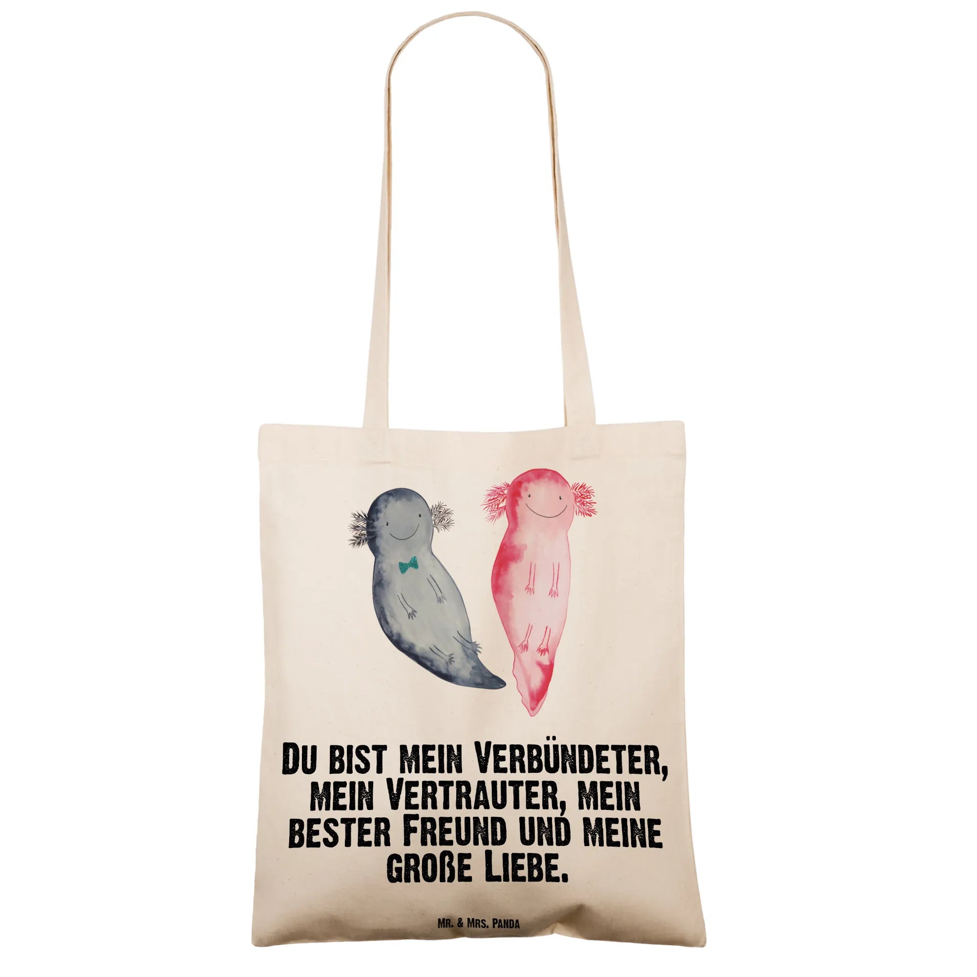 Entdecke die wunderschöne Tragetasche von Mr. & Mrs. Panda, die nicht nur stylisch ist, sondern auch ein ganz besonderes Motiv beherbergt: den süßen Axolotl Axel+Lotte! Diese beiden niedlichen Axolotl schwimmen fröhlich Seite an Seite und bringen Freude in jeden Alltag. Mit dem Slogan „Du bist mein Verbündeter, mein Vertrauter, mein bester Freund und meine große Liebe.“ ist diese Tasche ideal für alle, die ihren besonderen Menschen eine liebevolle Botschaft senden möchten. Egal, ob zum Valentinstag, als Liebesbeweis zum Jahrestag oder einfach nur so für einen Freund oder Verlobten – diese Tragetasche ist das perfekte Geschenk!