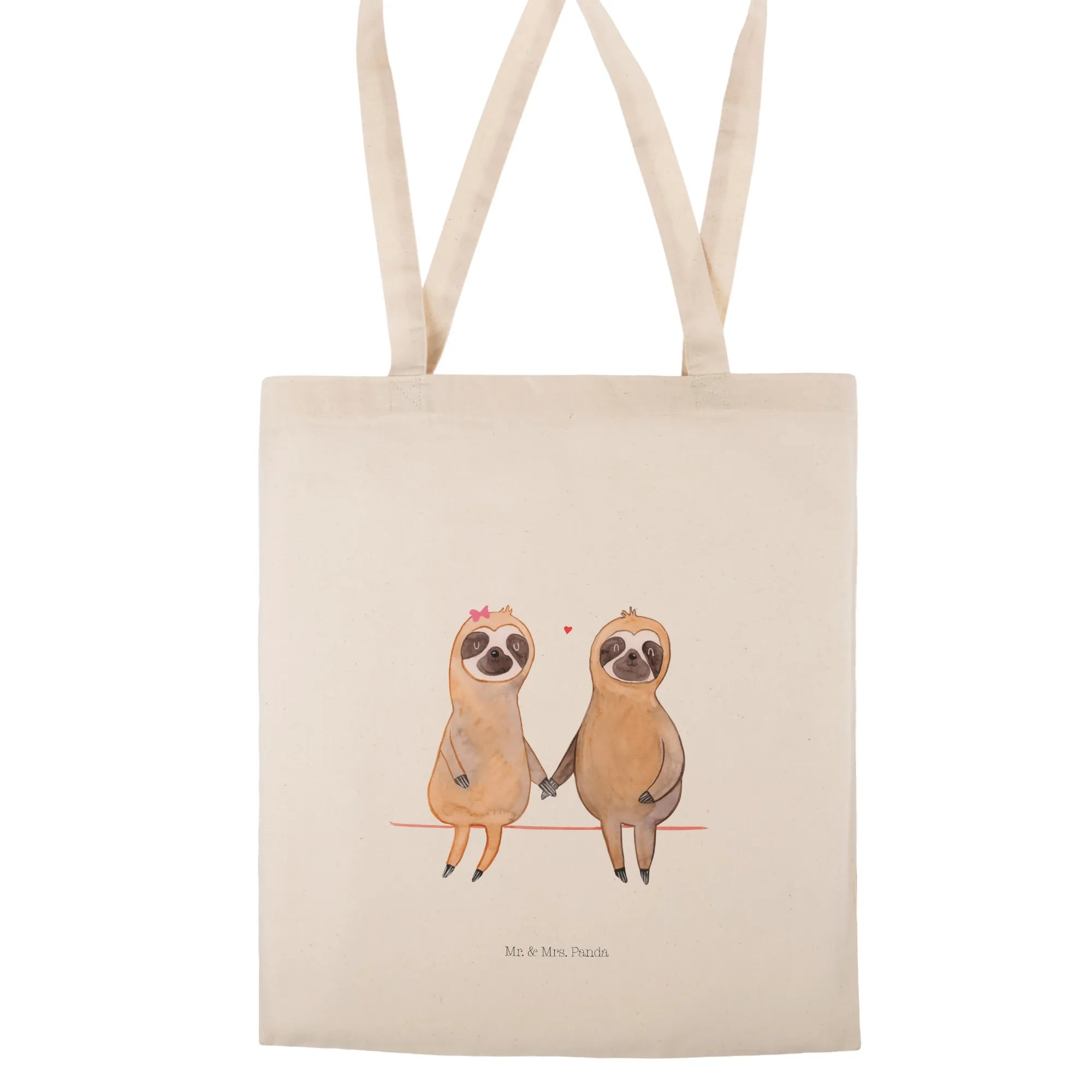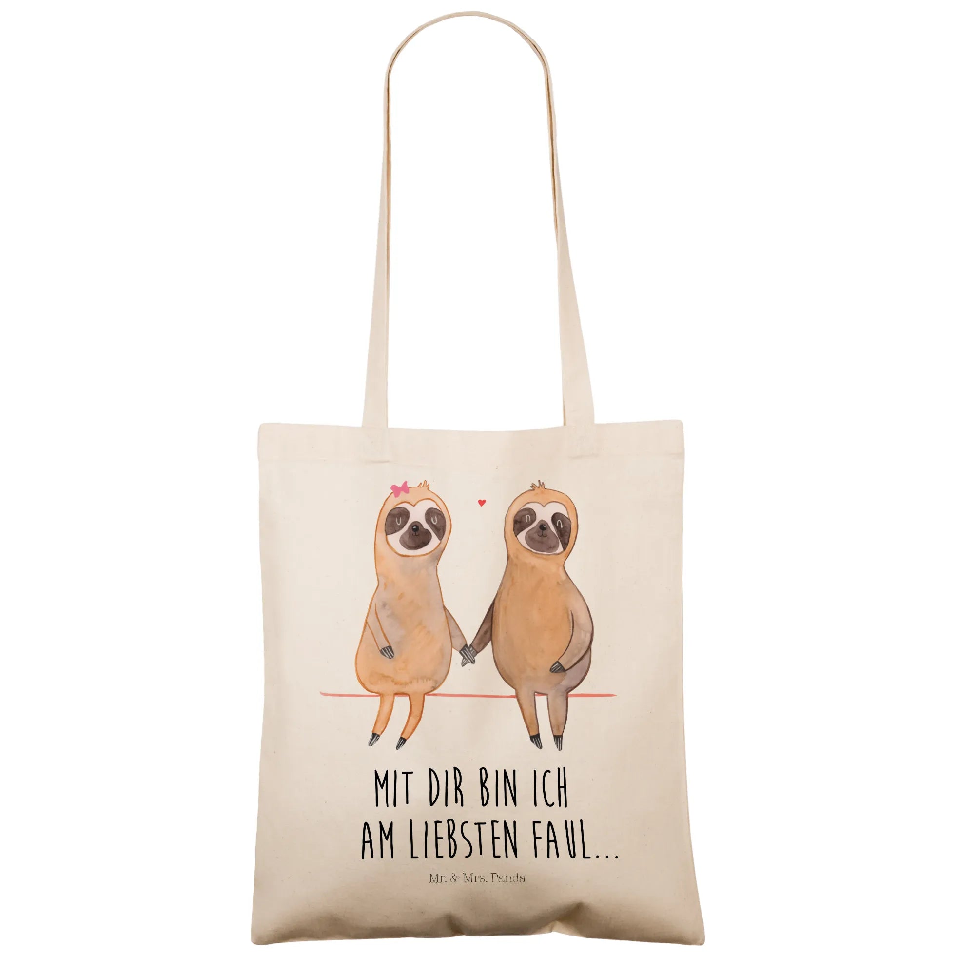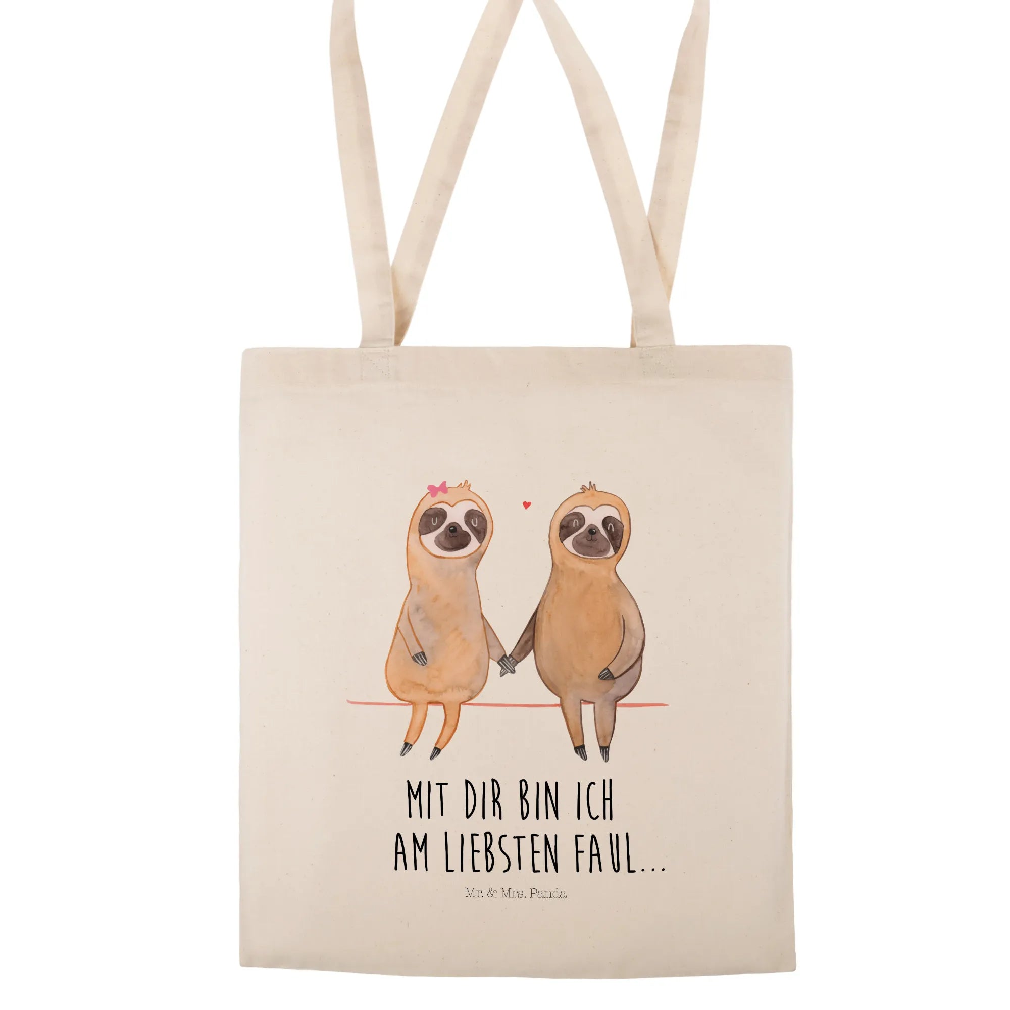 Die wunderschöne Tragetasche von Mr. & Mrs. Panda mit dem entzückenden Faultier Pärchen ist das perfekte Accessoire für alle Faultier-Liebhaber und Paare, die gemeinsam entspannen möchten. Diese hochwertige Stofftasche, die aus 100% Baumwolle gefertigt ist, hält durch ihre umsäumten und eingeschlagenen Innennähte auch bei vollem Inhalt ihre Form.