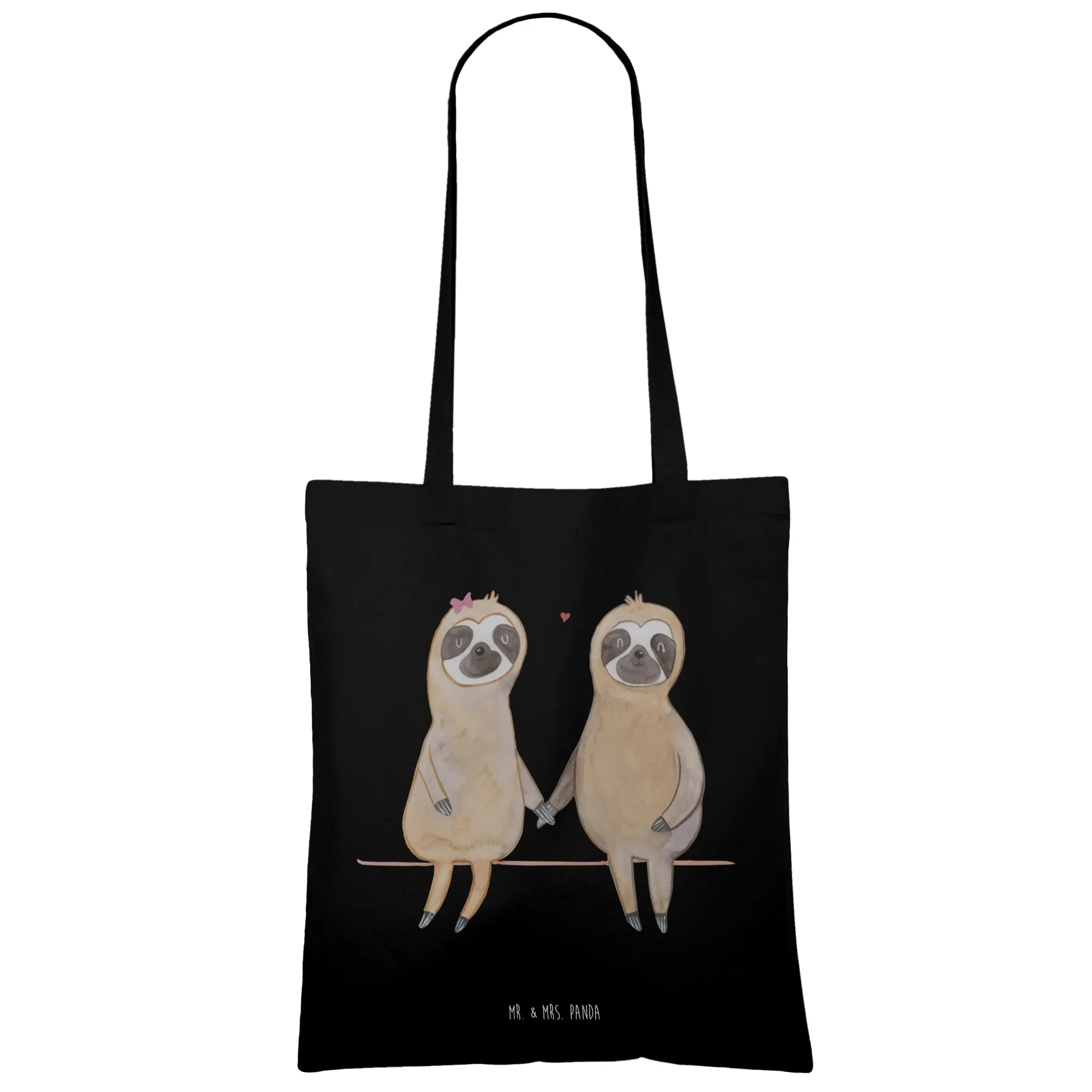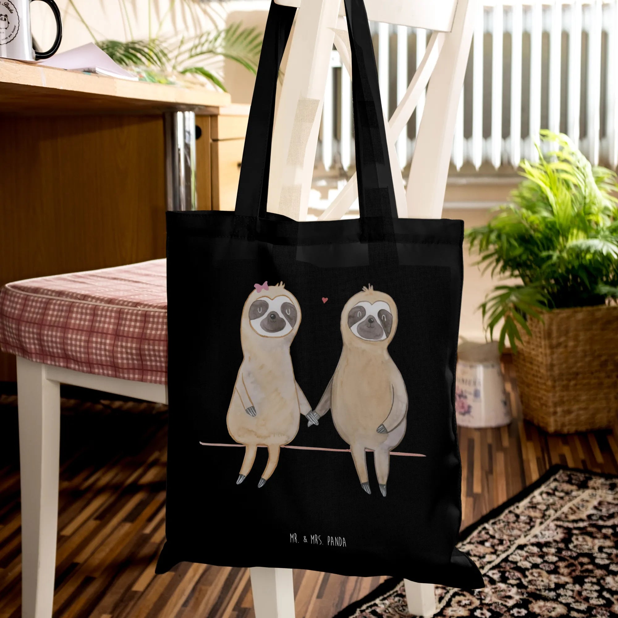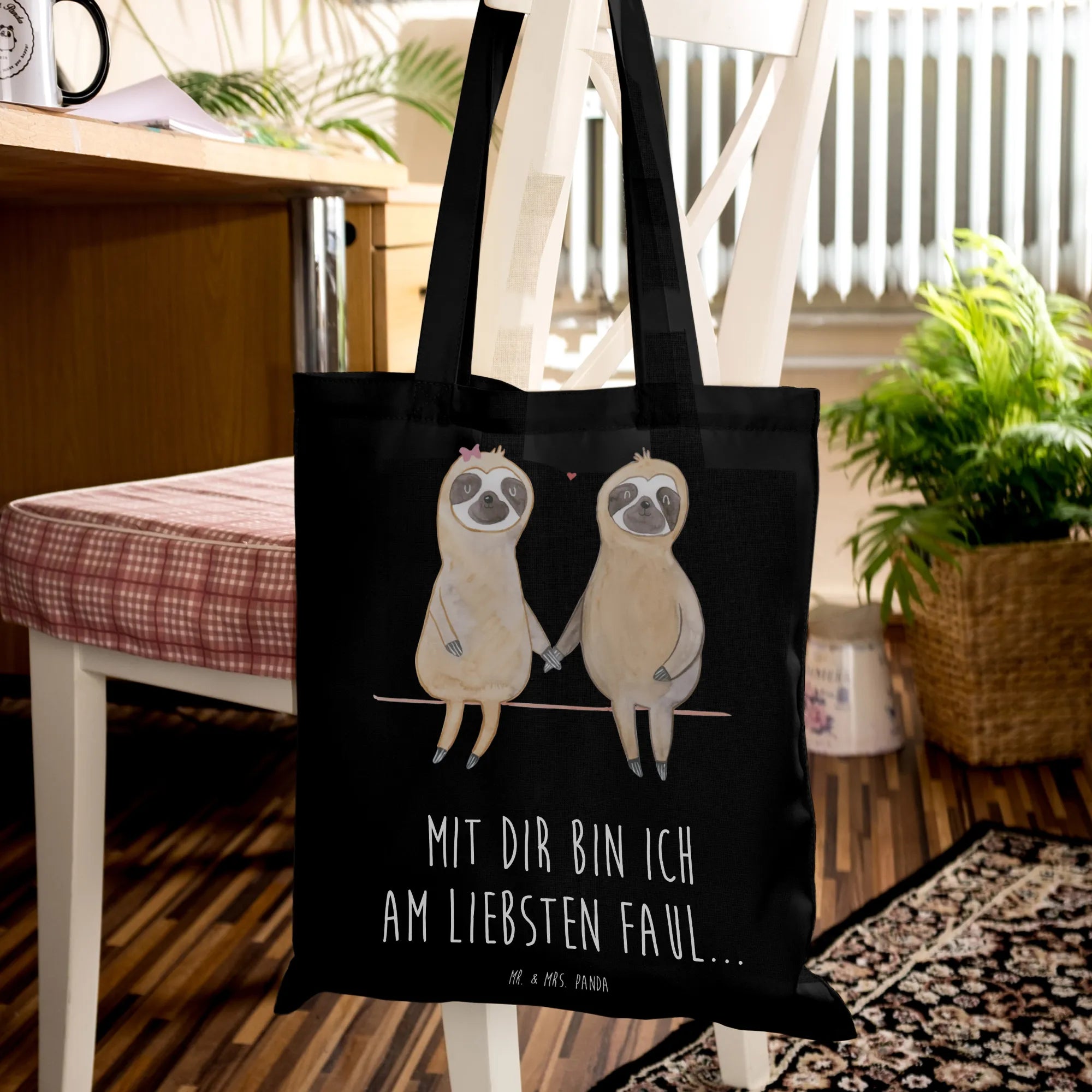 Die wunderschöne Tragetasche von Mr. & Mrs. Panda mit dem entzückenden Faultier Pärchen ist das perfekte Accessoire für alle Faultier-Liebhaber und Paare, die gemeinsam entspannen möchten. Diese hochwertige Stofftasche, die aus 100% Baumwolle gefertigt ist, hält durch ihre umsäumten und eingeschlagenen Innennähte auch bei vollem Inhalt ihre Form.