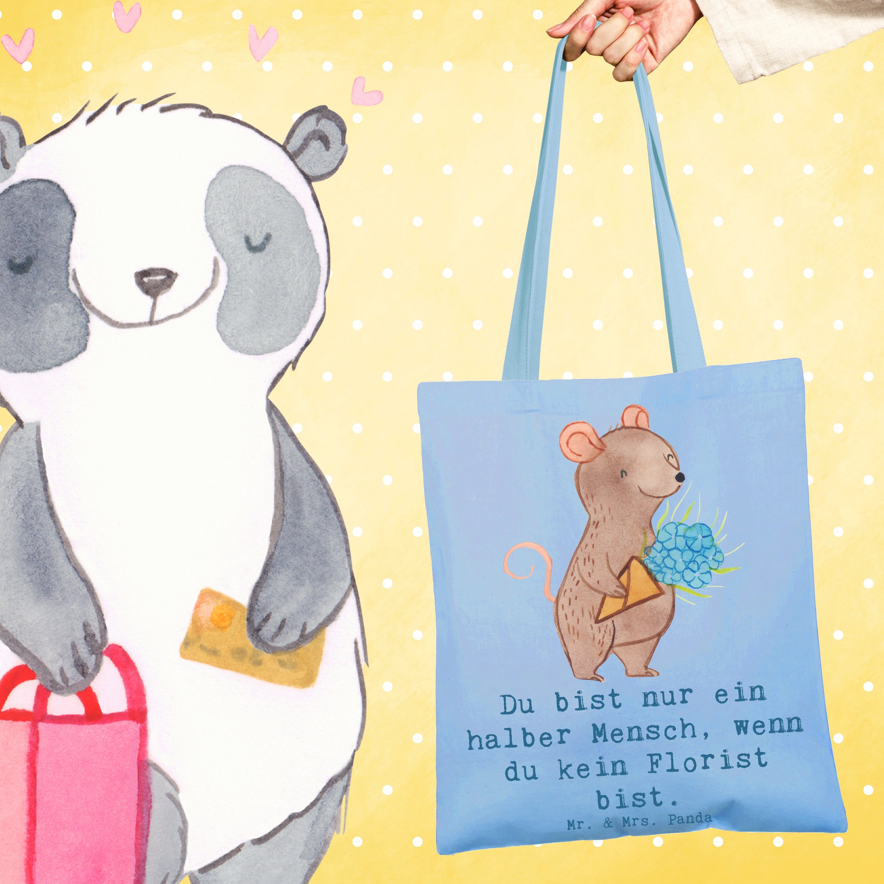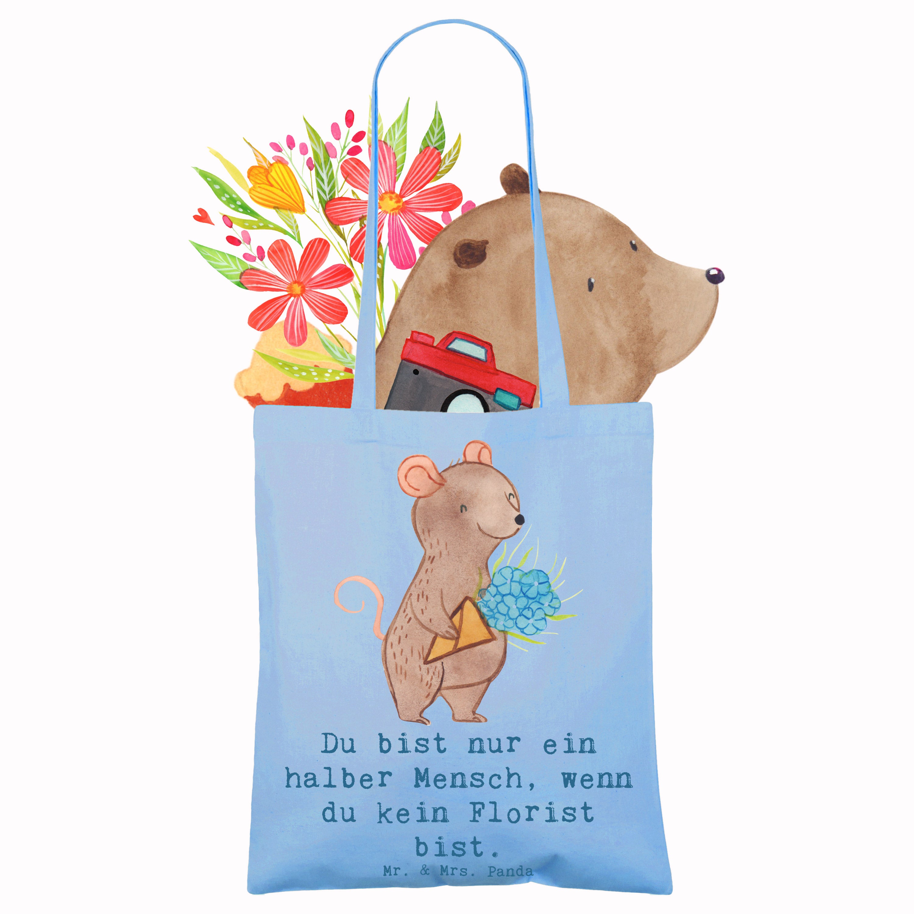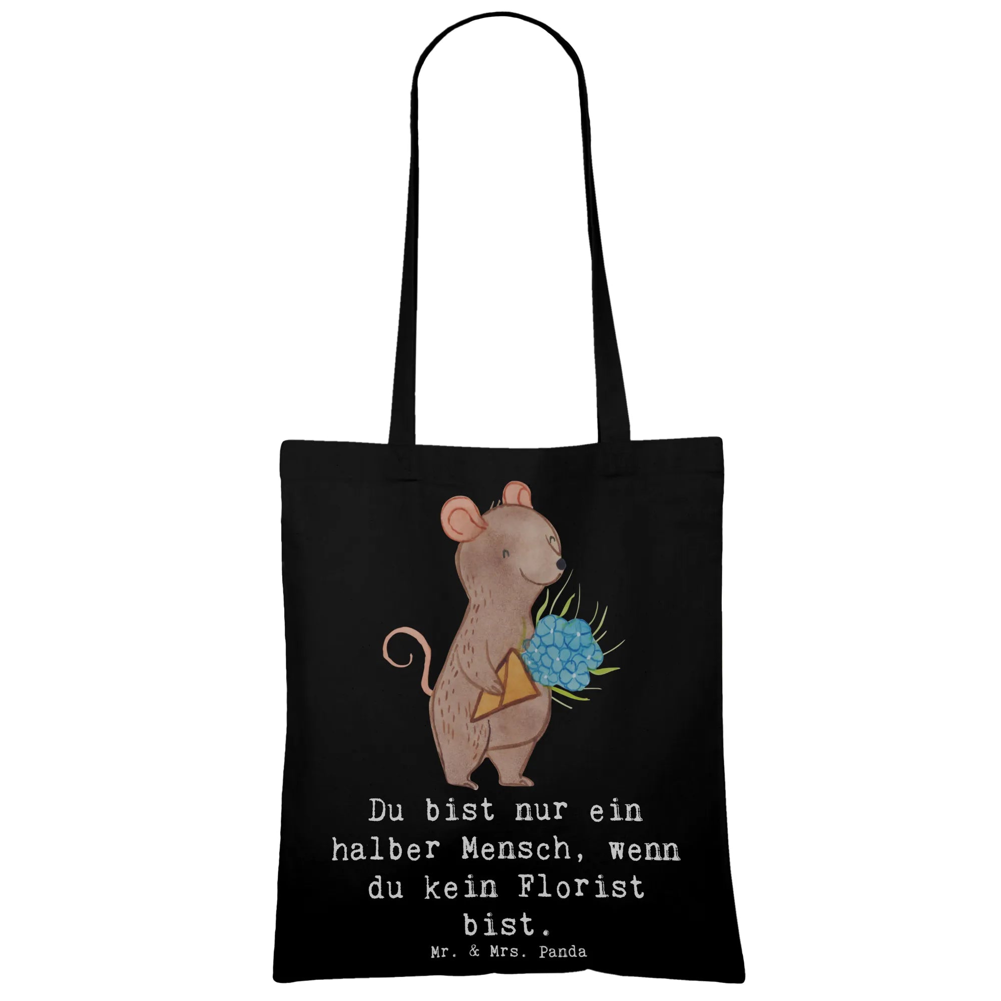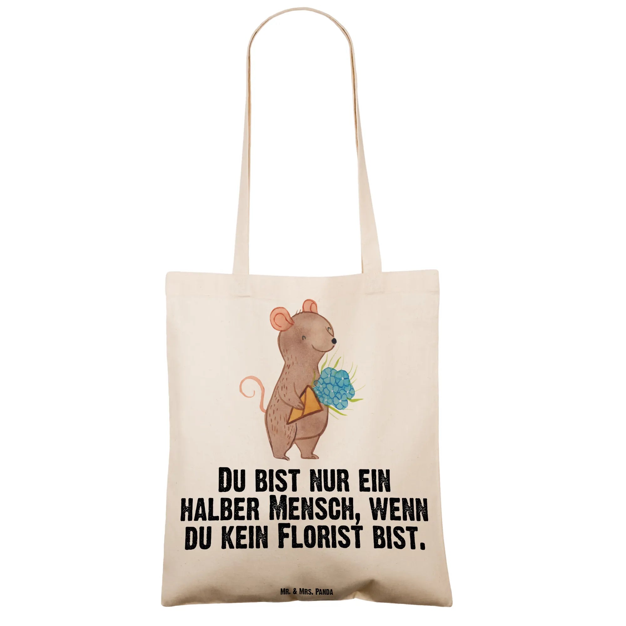 Unsere liebevoll gestaltete Tragetasche von Mr. & Mrs. Panda zeigt eine niedliche Maus mit einem großen Blumenstrauß und den charmanten Spruch: „Du bist nur ein halber Mensch, wenn du kein Florist bist.“ Dieses Motiv aus der Berufe-Kollektion ist ideal, um Floristen, Floristinnen, Auszubildende oder Blumenprofis zu überraschen — sei es zum Ausbildungsabschluss, als Dankeschön, zum Abschied oder zum Berufsjubiläum.