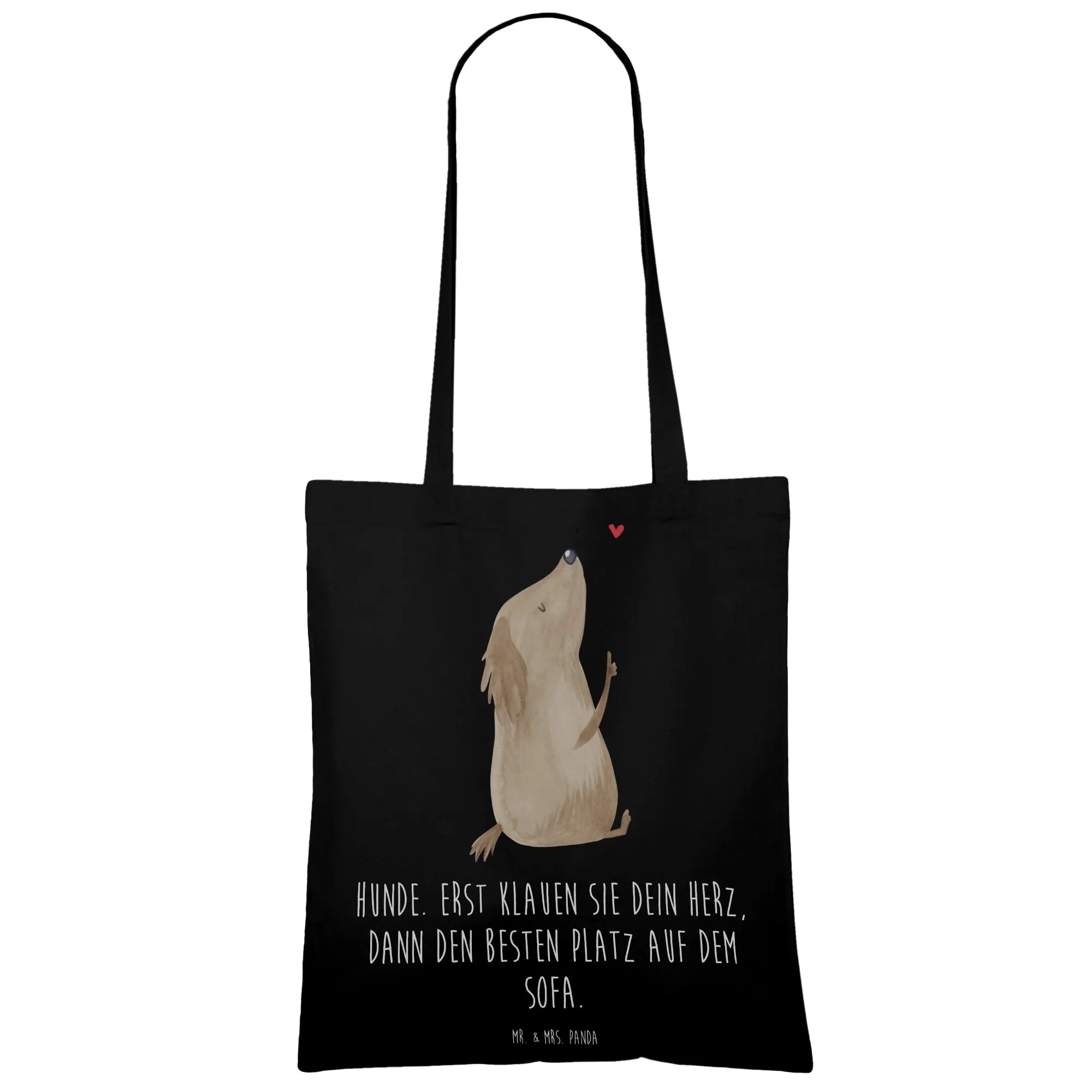 Entdecke die perfekte Tragetasche für Hundeliebhaber! Unsere wunderschöne Tragetasche von Mr. & Mrs. Panda strahlt mit ihrem süßen Hundemotiv und dem liebenswerten Slogan "Hunde. Erst klauen sie dein Herz, dann den besten Platz auf dem Sofa." pure Lebensfreude aus. Egal, ob du beim Einkaufen oder am Strand bist, diese Tasche ist stets dein treuer Begleiter.