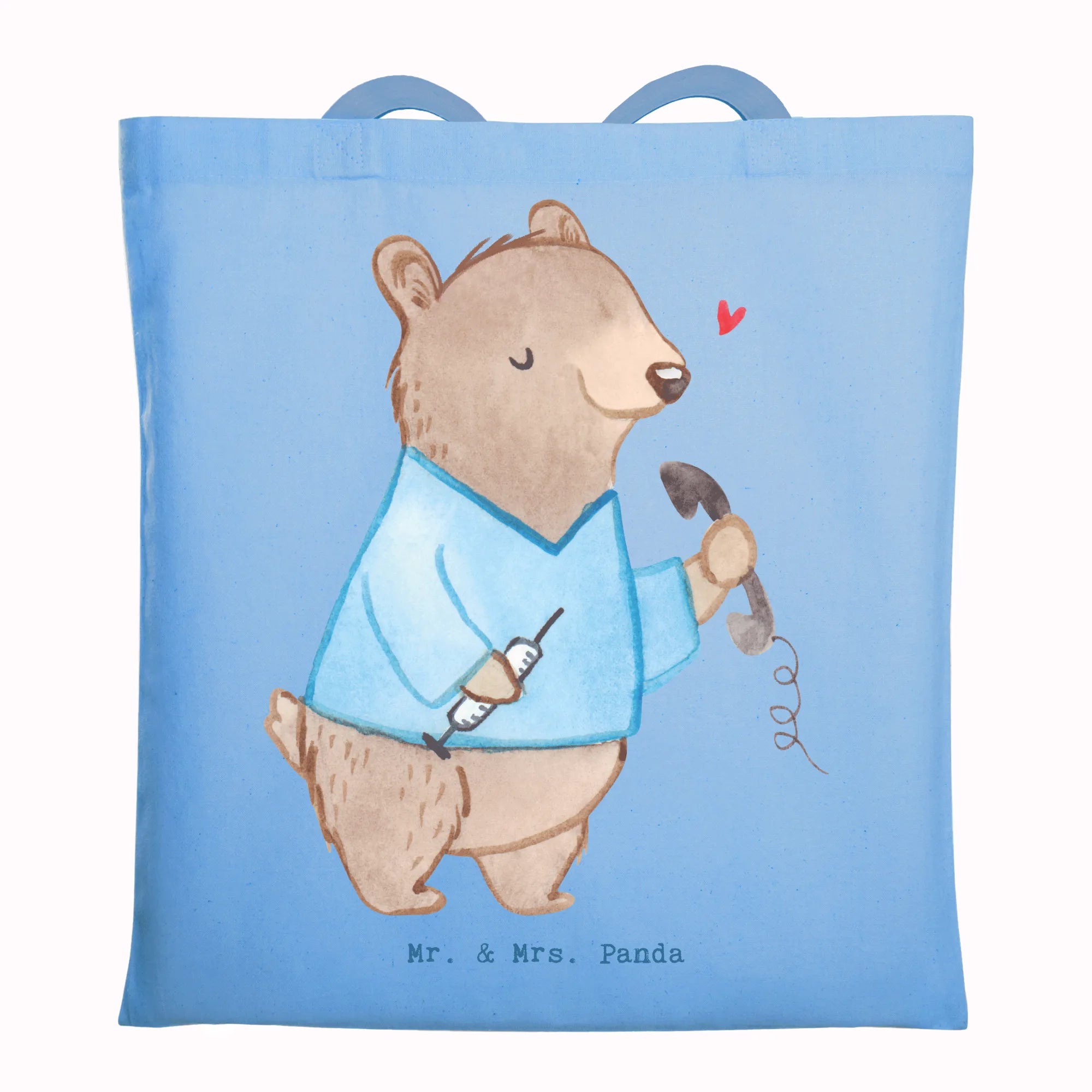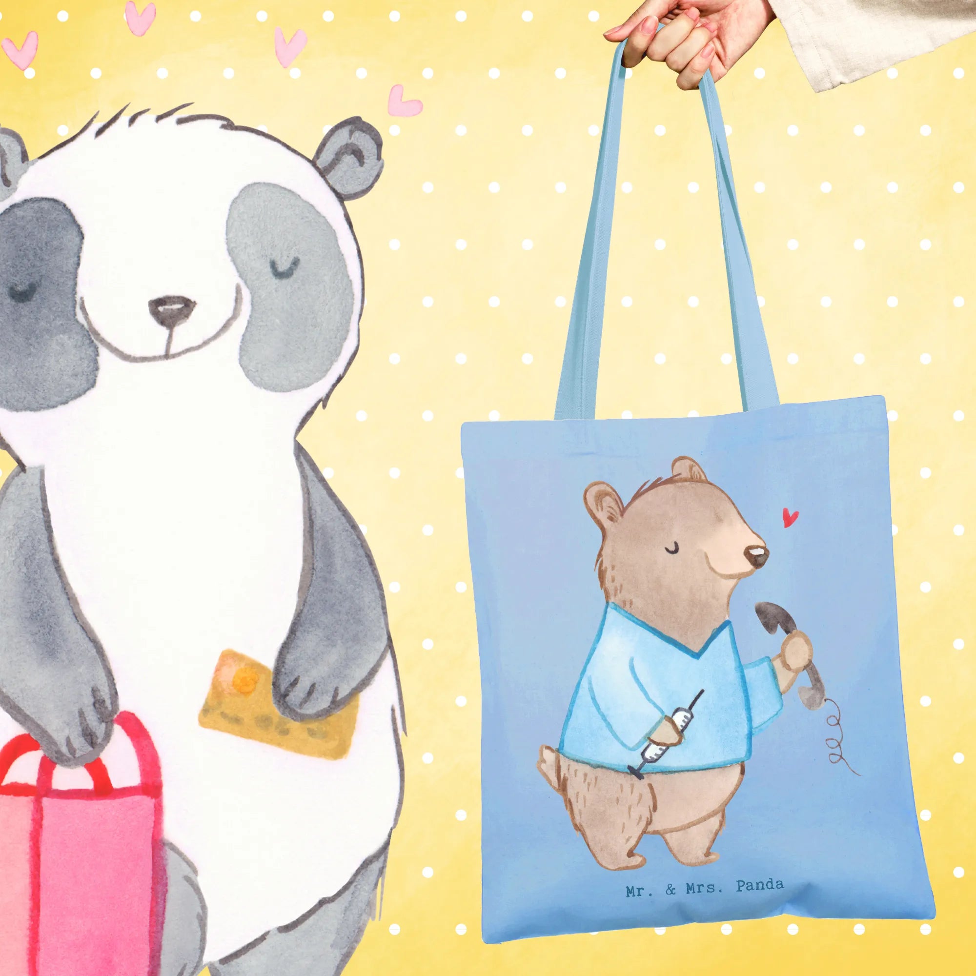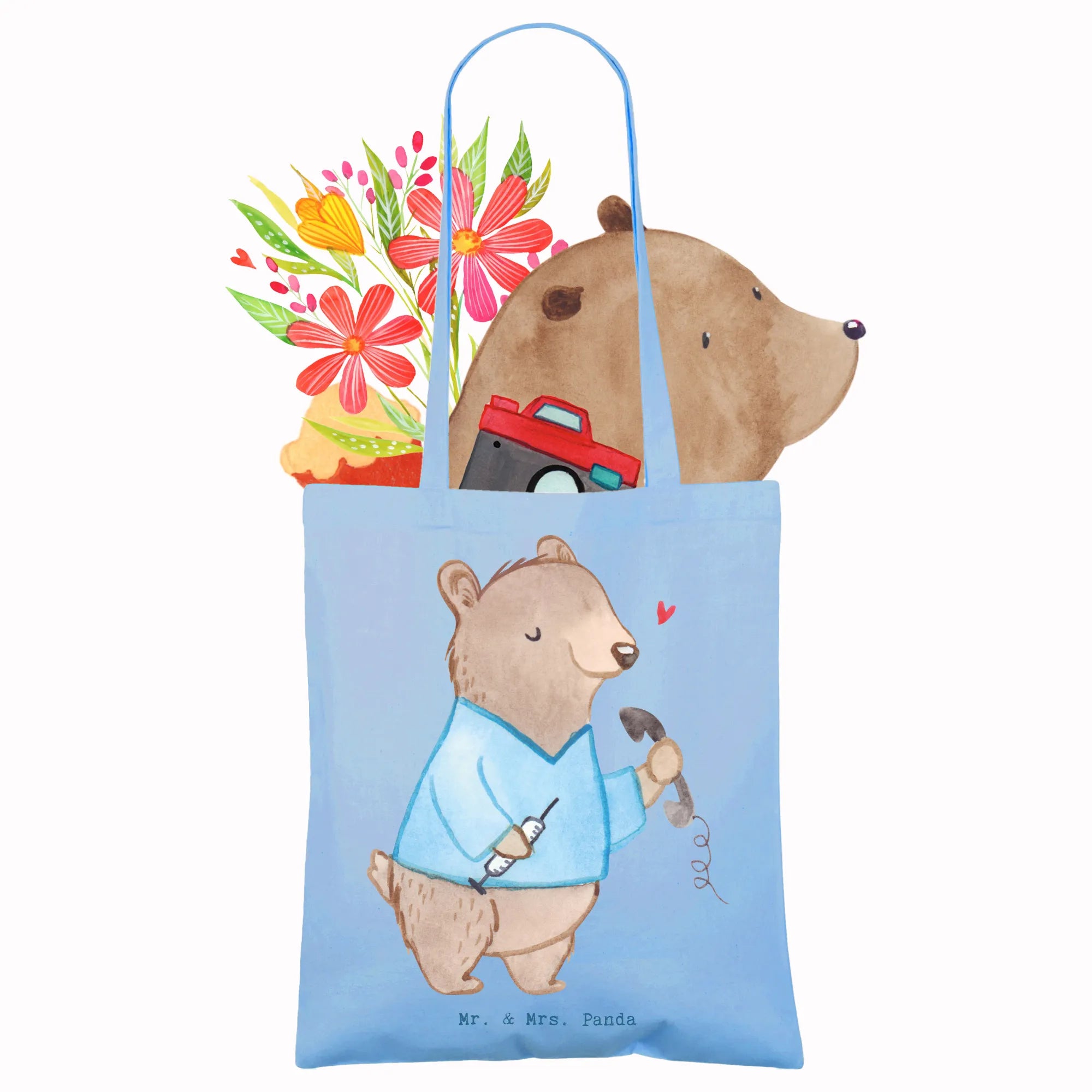 Mit viel Liebe von Mrs. Panda handgezeichnet, besticht der süße Bär in seinem blauen Kittel und mit einer Spritze in der Hand durch seine fröhliche Ausstrahlung. Lass dich von der einzigartigen Farbgebung und den handgemalten Motiven verzaubern und finde das perfekte Geschenk für alle, die im Gesundheitswesen tätig sind. Also, schnapp dir deine 'Krankenpflegehelfer mit Herz' Tragetasche und bring ein bisschen Freude in den Alltag deiner Lieben!