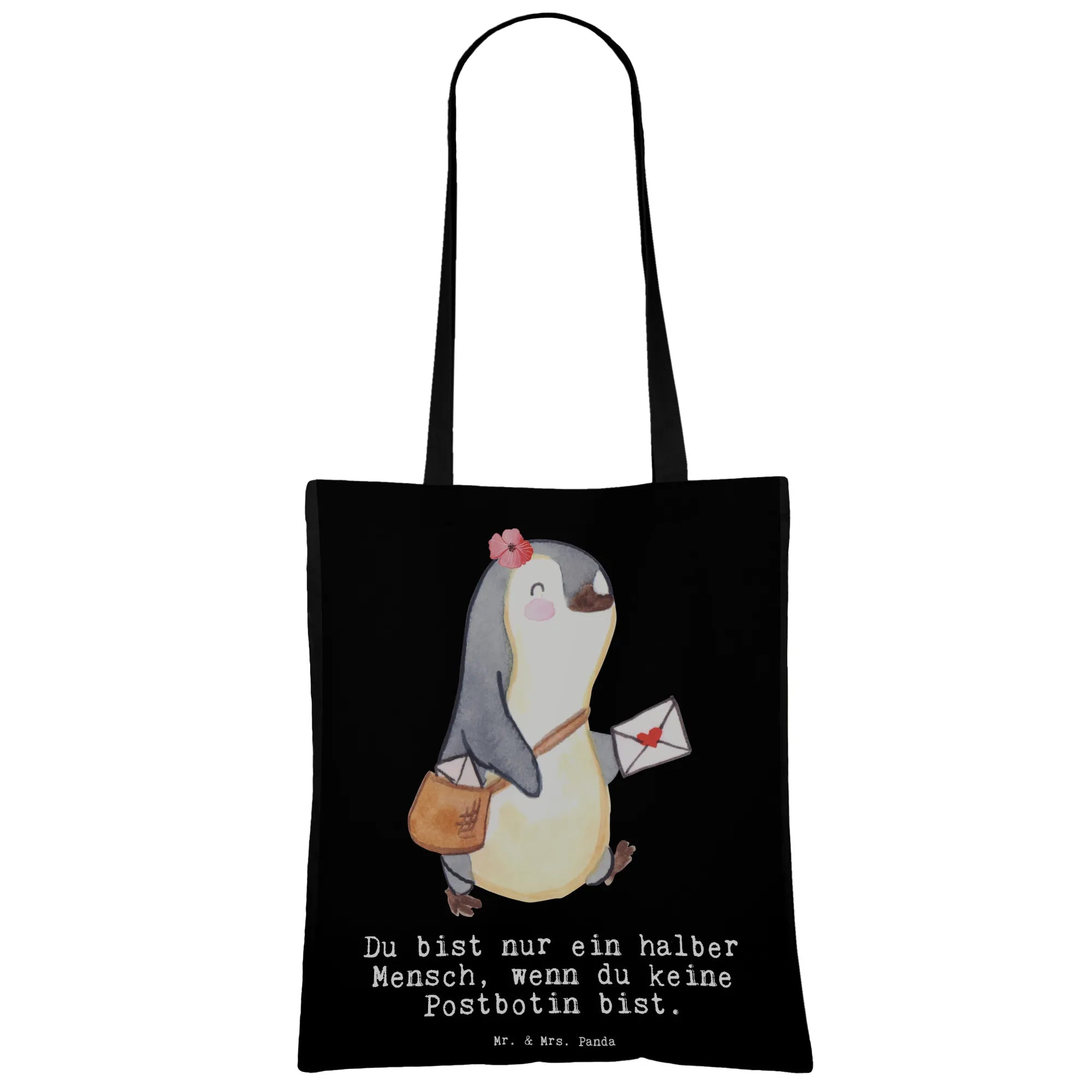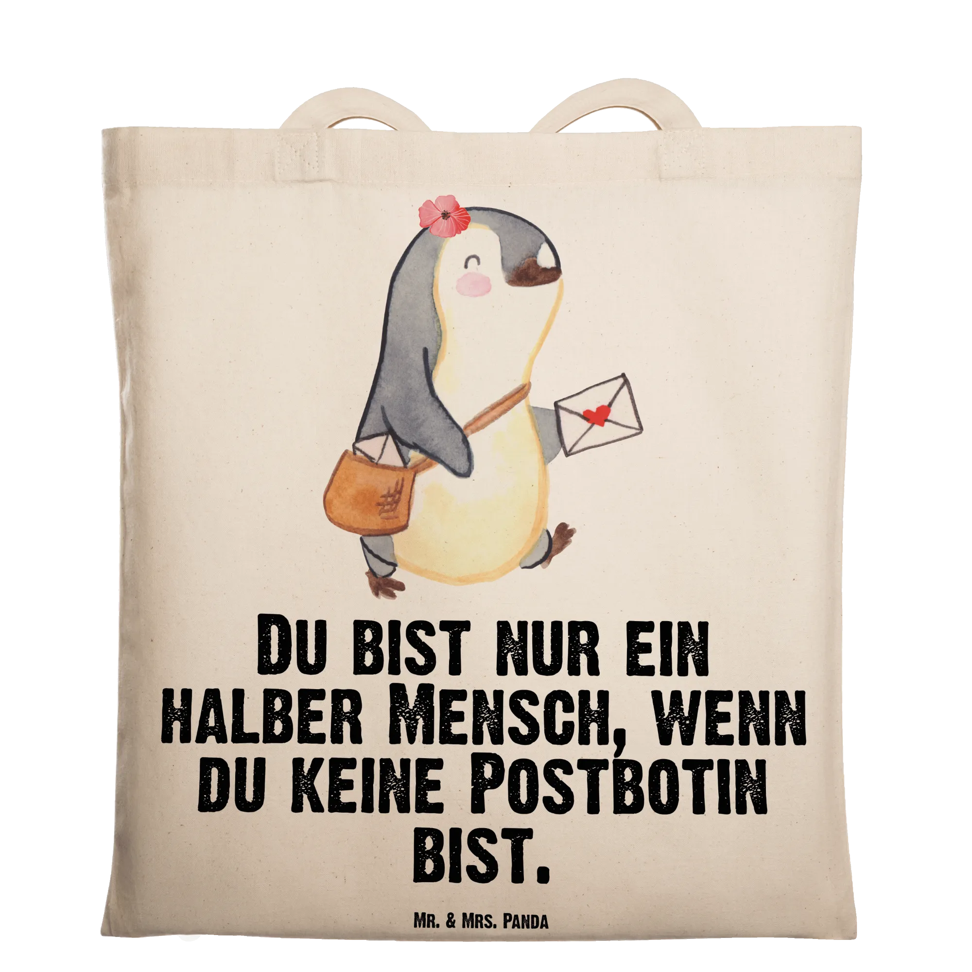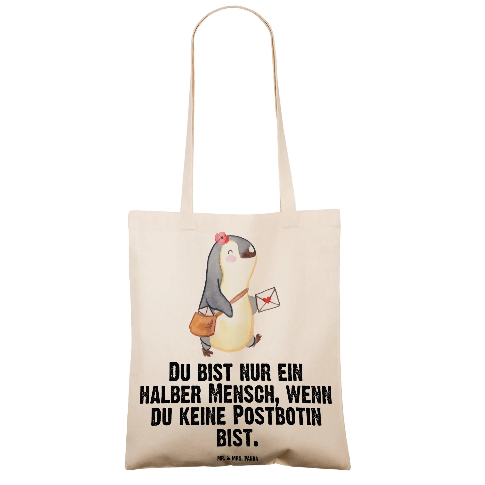 Unsere Tragetasche „Postbotin mit Herz" von Mr. & Mrs. Panda ist mehr als nur eine Tasche – sie ist ein herzliches Dankeschön an alle Postbotinnen. Das liebevoll aquarellierte Motiv einer kleinen Pinguin-Postlerin mit Posttasche und der augenzwinkernde Spruch „Du bist nur ein halber Mensch, wenn du keine Postbotin bist." bringen Freude und Schmunzeln in den Alltag.