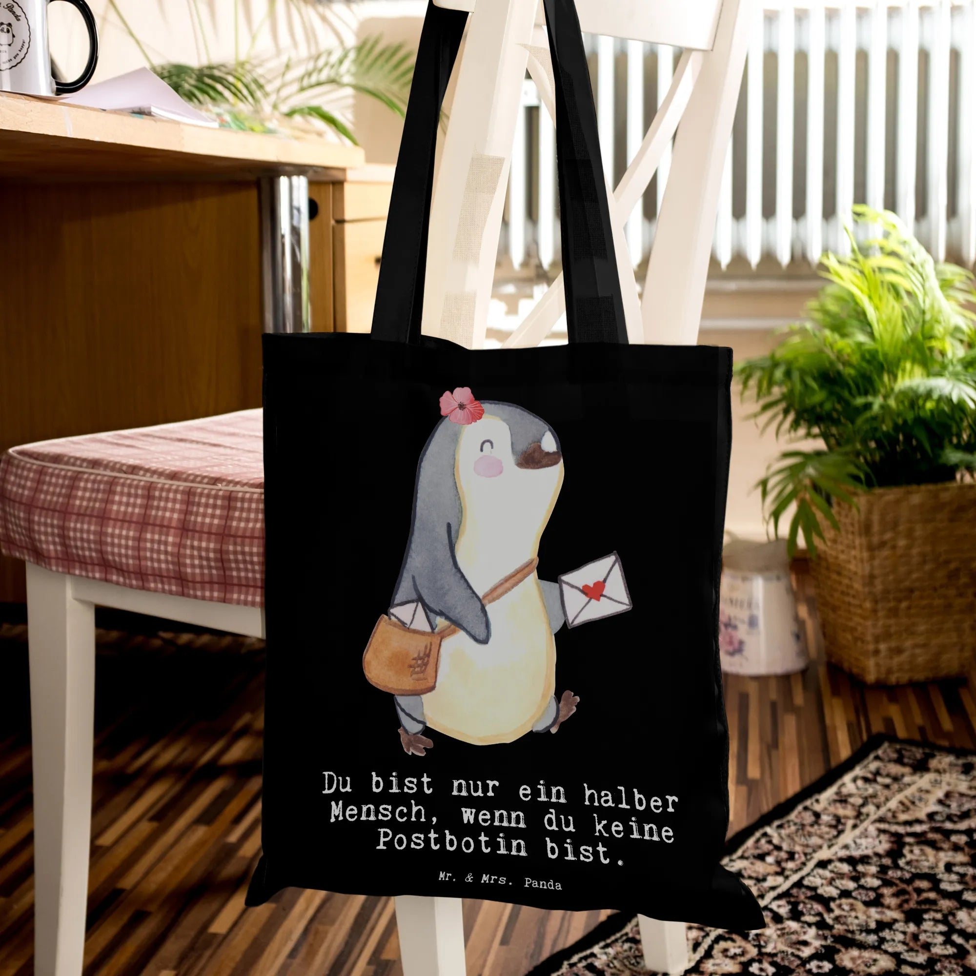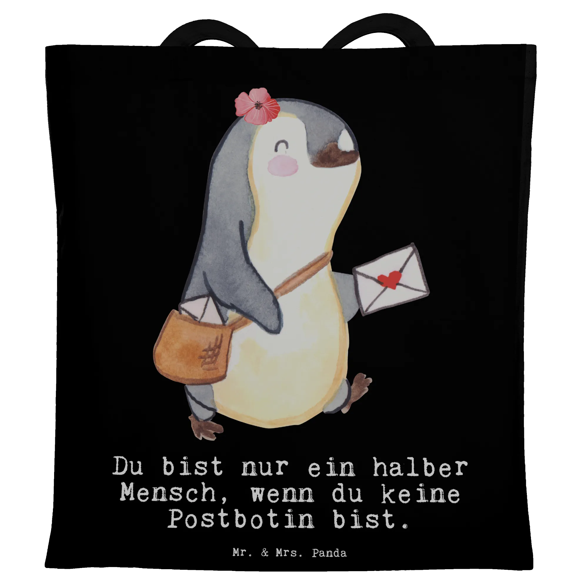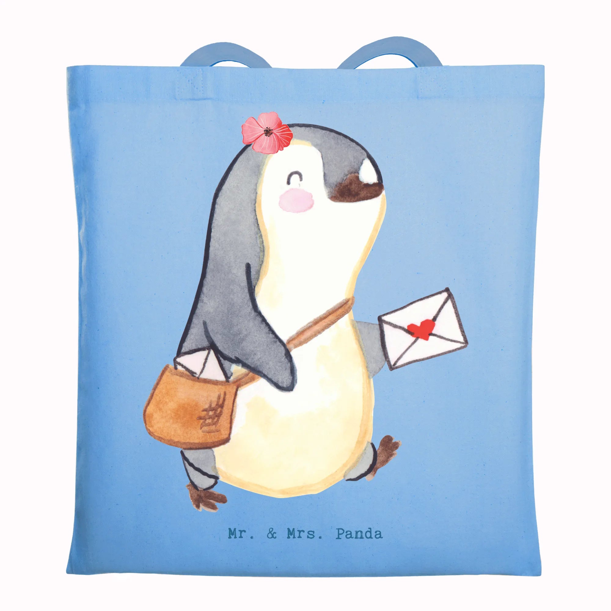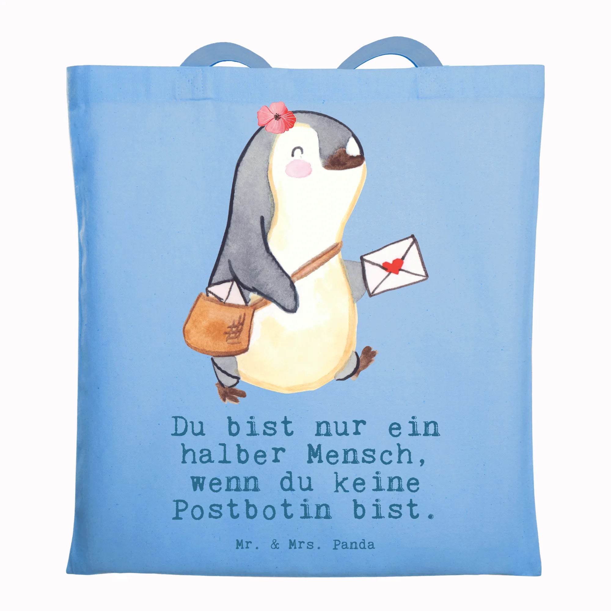 Unsere Tragetasche „Postbotin mit Herz" von Mr. & Mrs. Panda ist mehr als nur eine Tasche – sie ist ein herzliches Dankeschön an alle Postbotinnen. Das liebevoll aquarellierte Motiv einer kleinen Pinguin-Postlerin mit Posttasche und der augenzwinkernde Spruch „Du bist nur ein halber Mensch, wenn du keine Postbotin bist." bringen Freude und Schmunzeln in den Alltag.
