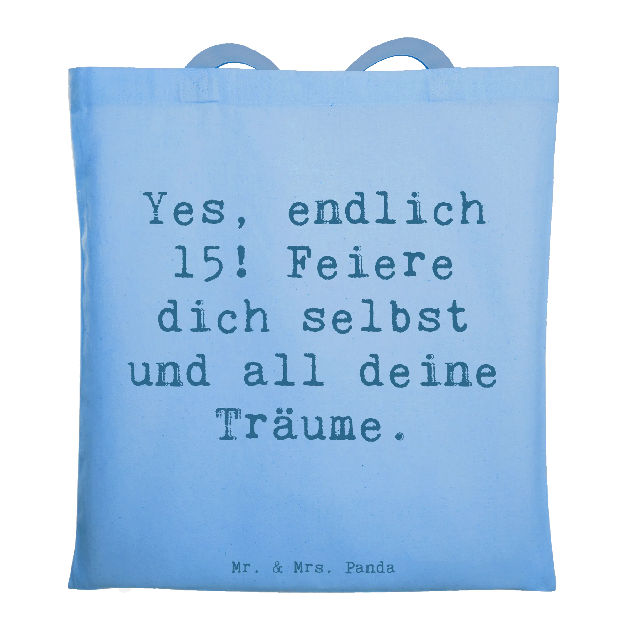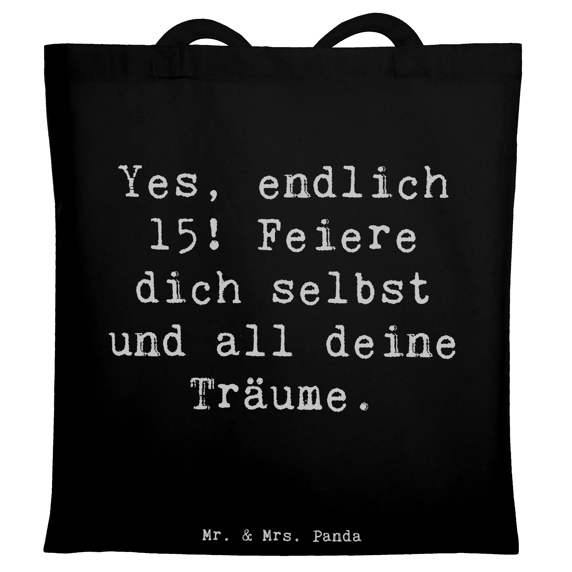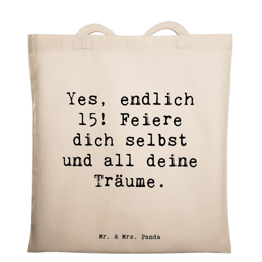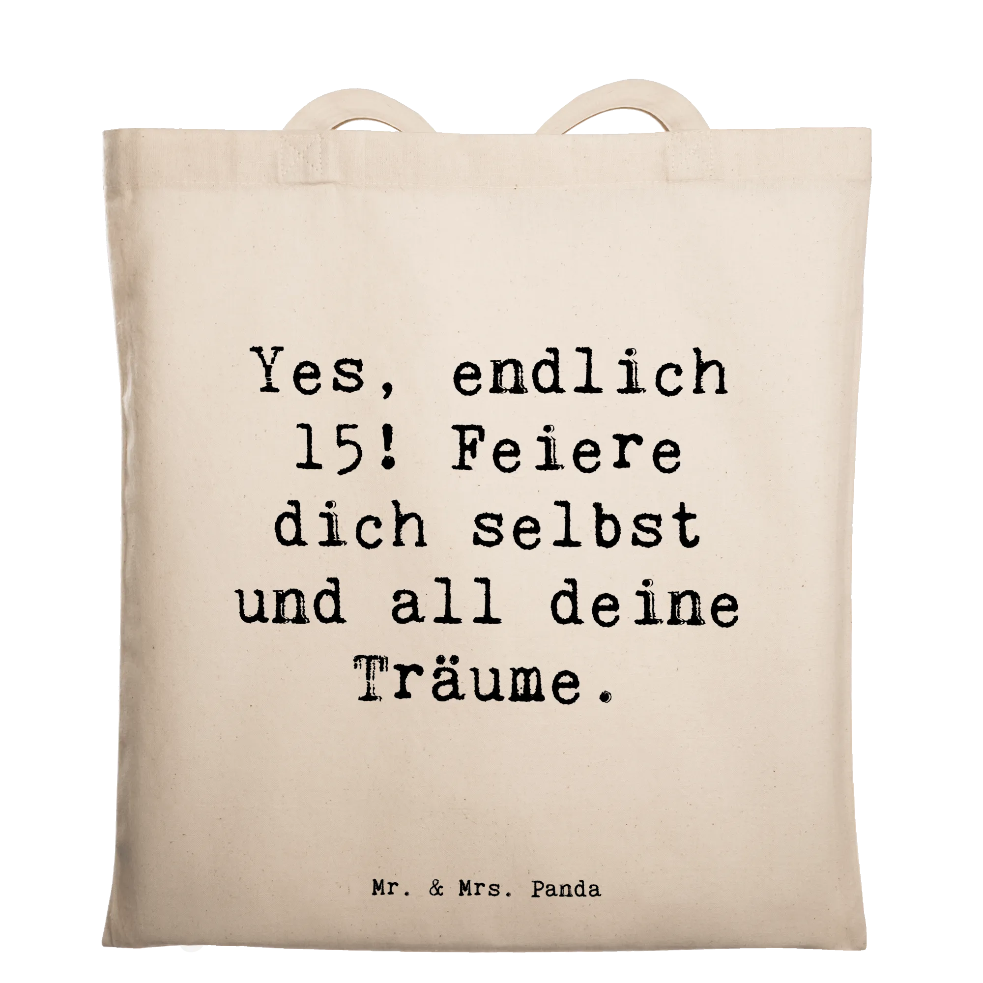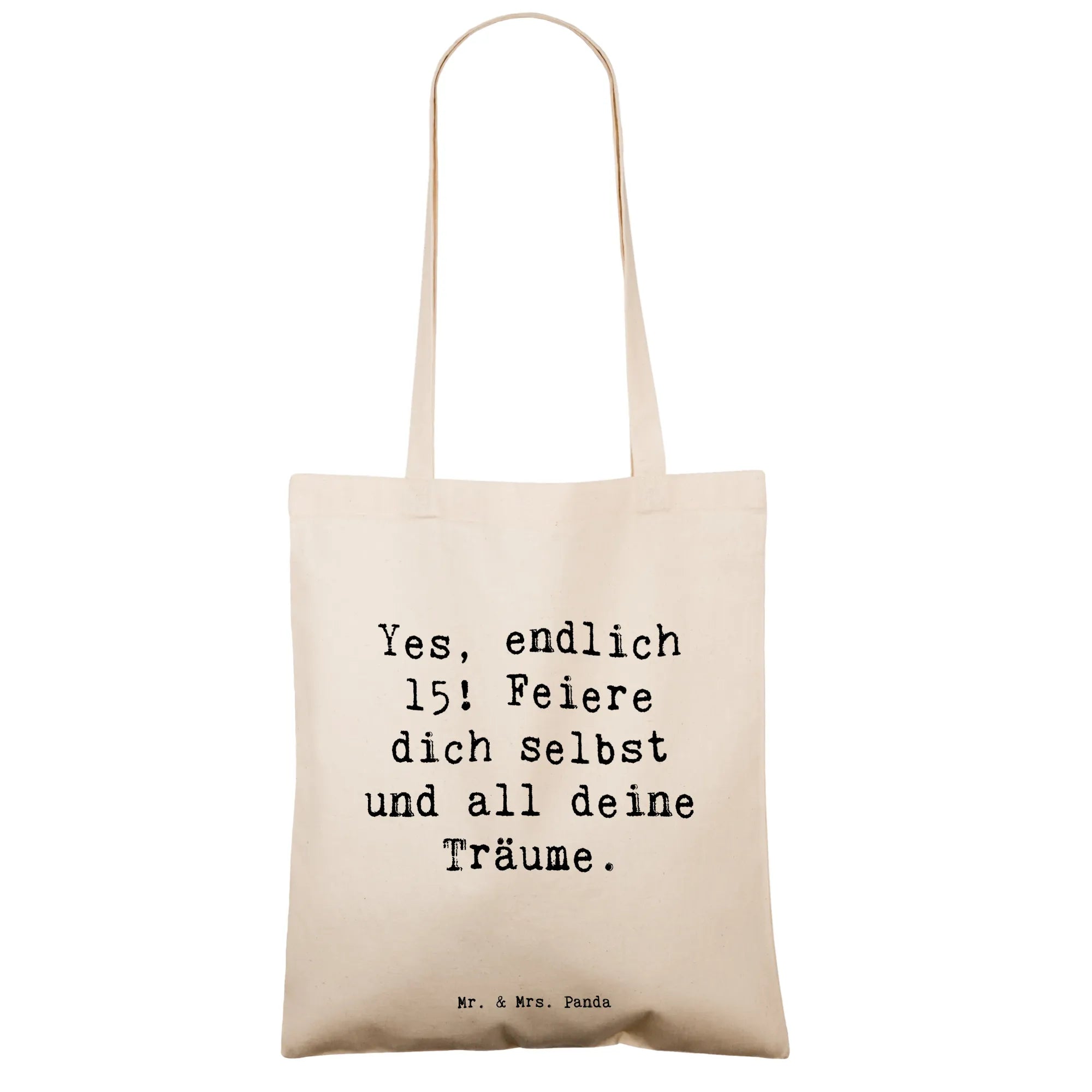 Hey du! Auf der Suche nach dem perfekten Geschenk für einen lebhaften 15. Geburtstag? Dann schau dir diese wunderschöne Tragetasche von Mr. & Mrs. Panda an! Mit dem fröhlichen Slogan "Yes, endlich 15! Feiere dich selbst und all deine Träume." wird sie zum absoluten Hingucker bei jeder Feier. Diese Tragetasche ist nicht nur praktisch, sondern auch super stilvoll und eignet sich perfekt, um all die tollen Geschenke und Überraschungen für den besonderen Tag zu transportieren.