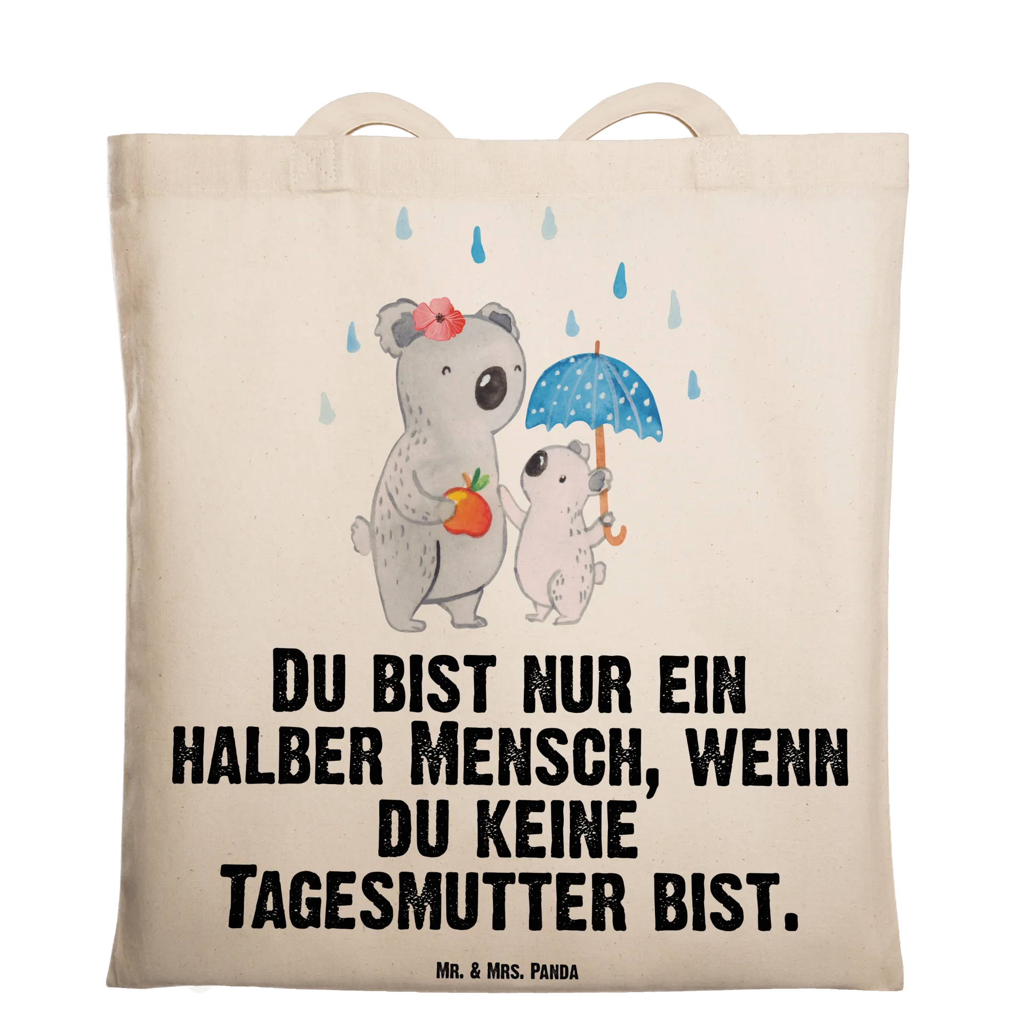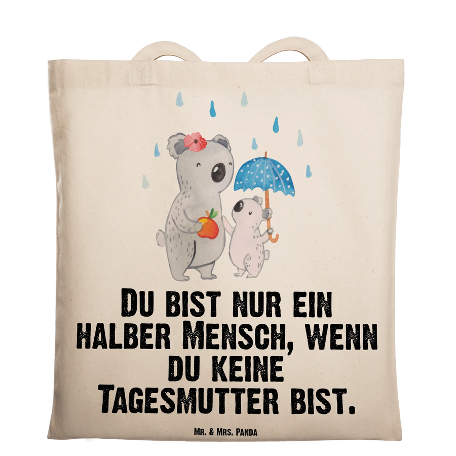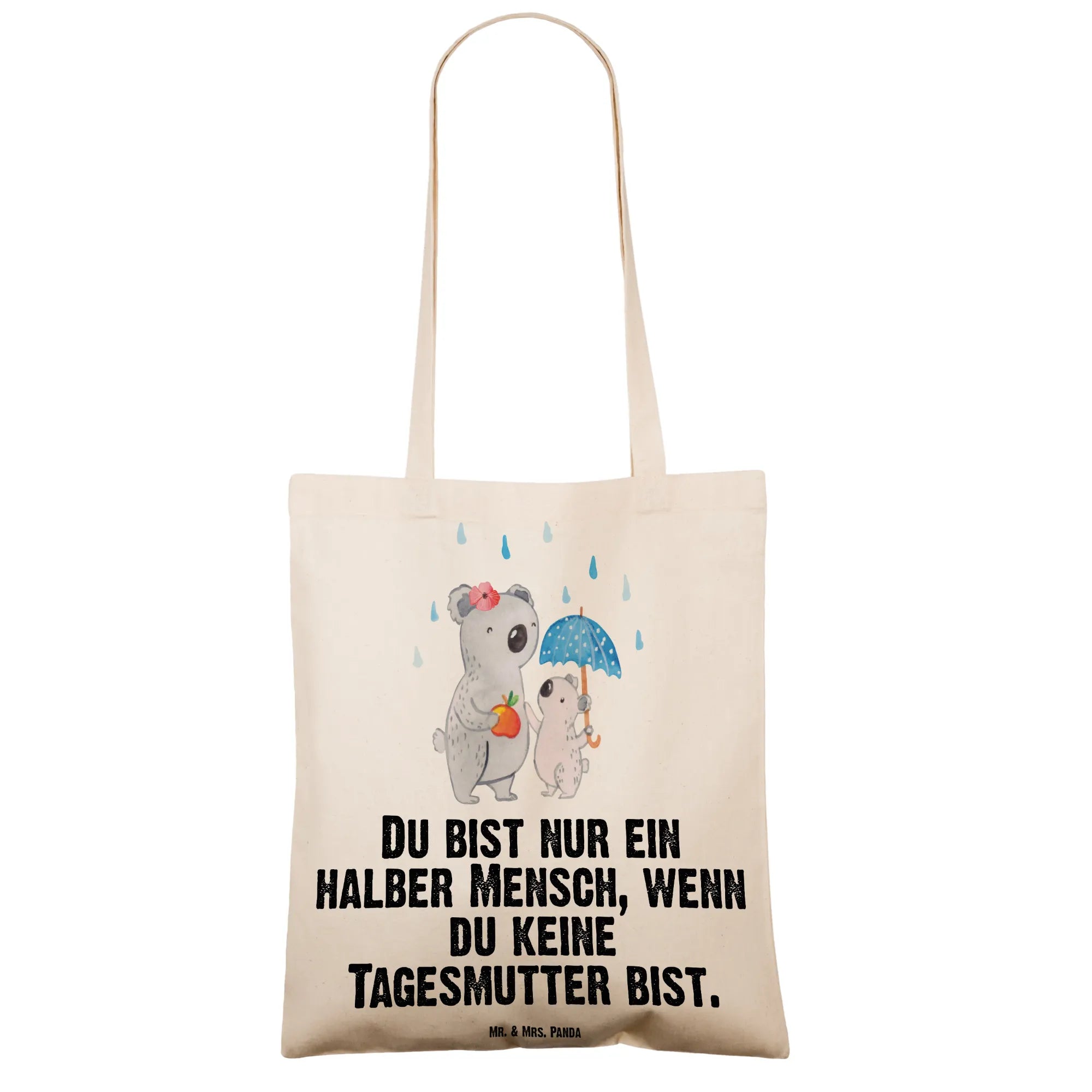 Diese liebevoll gestaltete Baumwolltasche verbindet niedliches Design mit echtem Alltagsnutzen. Das Motiv zeigt eine fürsorgliche Koala-Tagesmutter mit ihrem kleinen Koala unter einem Regenschirm – inklusive einem kleinen Apfel als süße Geste. Der humorvolle Spruch „Du bist nur ein halber Mensch, wenn du keine Tagesmutter bist.“ macht die Tasche zu einem herzlichen Geschenk.