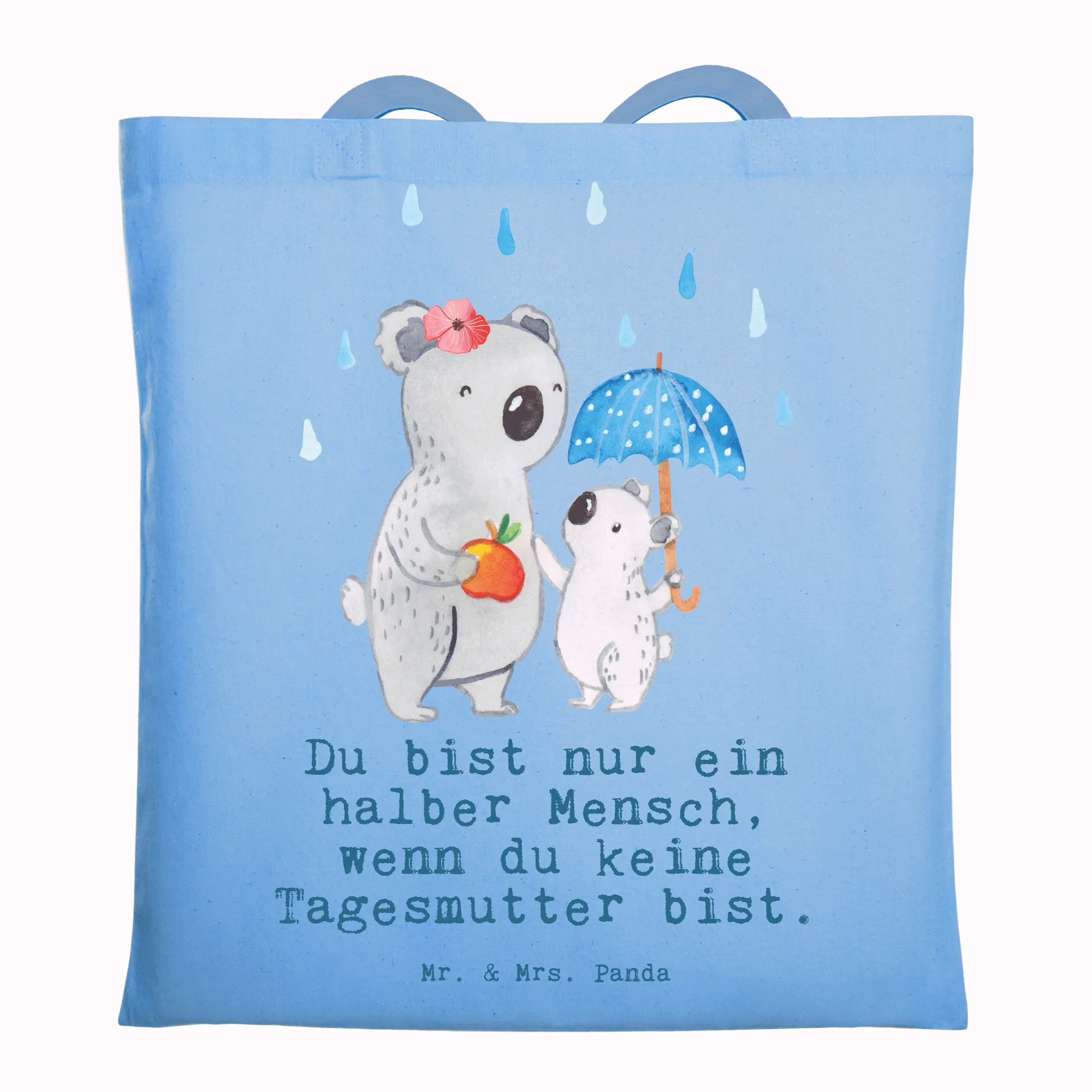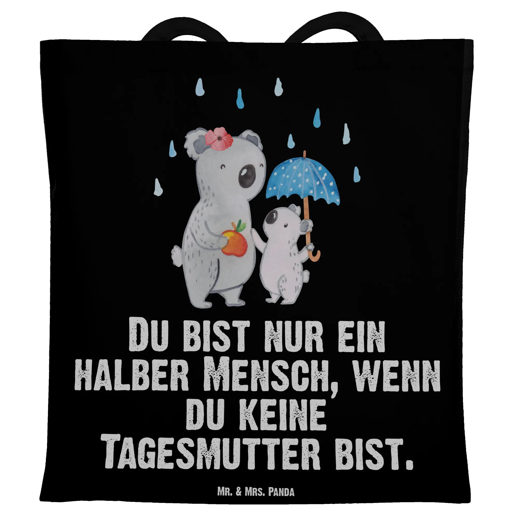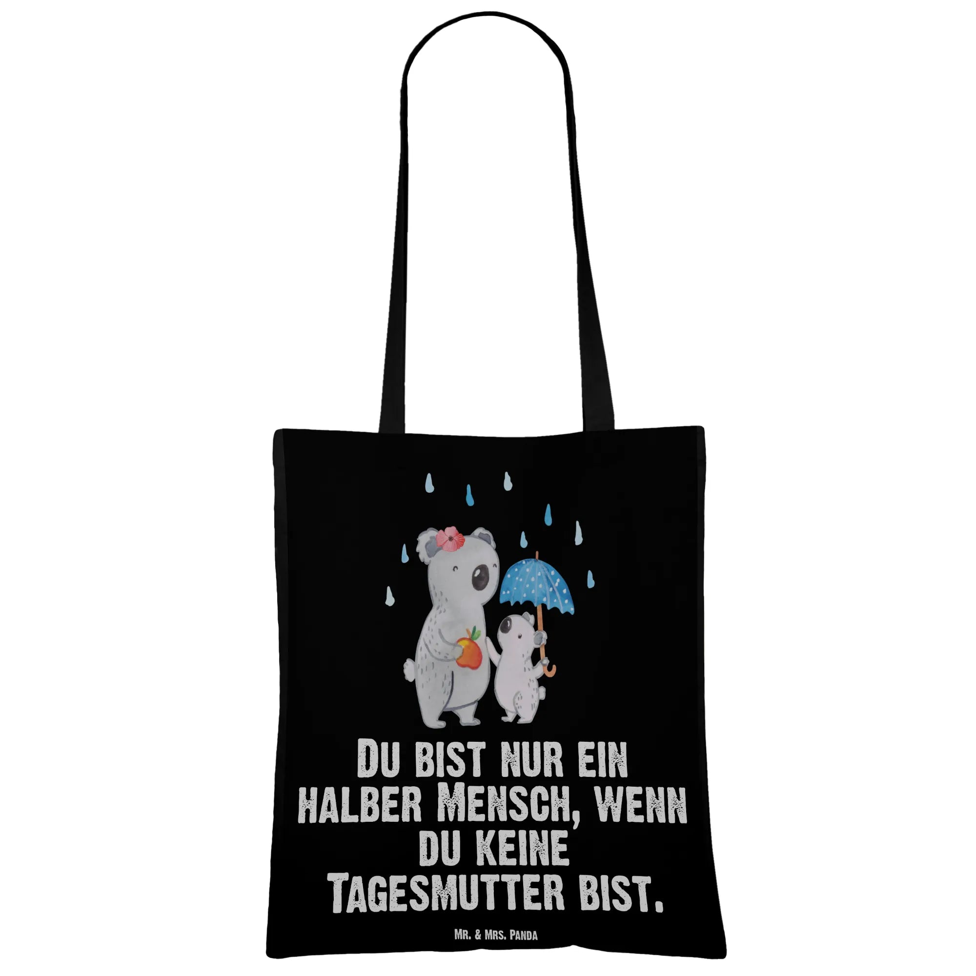 Diese liebevoll gestaltete Baumwolltasche verbindet niedliches Design mit echtem Alltagsnutzen. Das Motiv zeigt eine fürsorgliche Koala-Tagesmutter mit ihrem kleinen Koala unter einem Regenschirm – inklusive einem kleinen Apfel als süße Geste. Der humorvolle Spruch „Du bist nur ein halber Mensch, wenn du keine Tagesmutter bist.“ macht die Tasche zu einem herzlichen Geschenk.