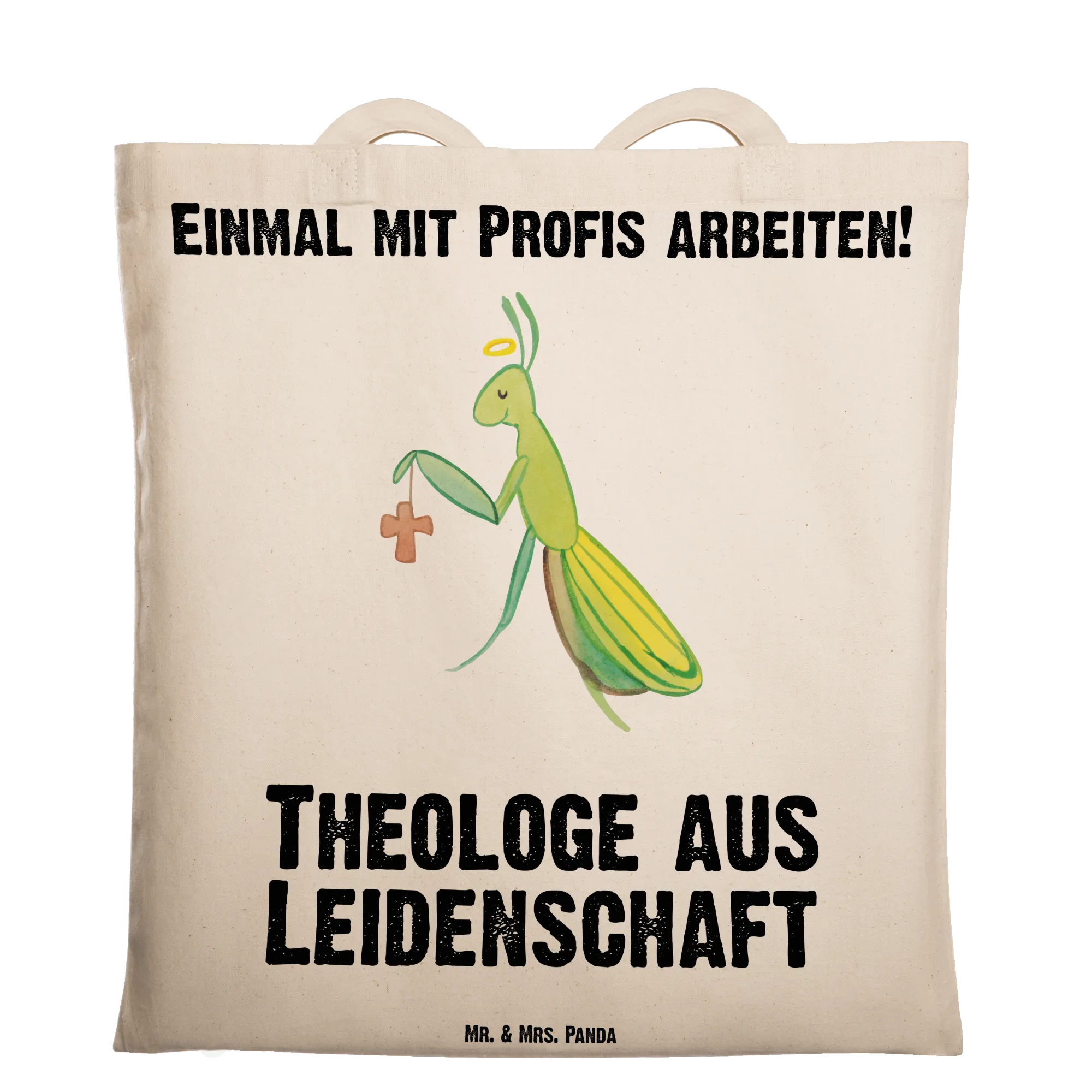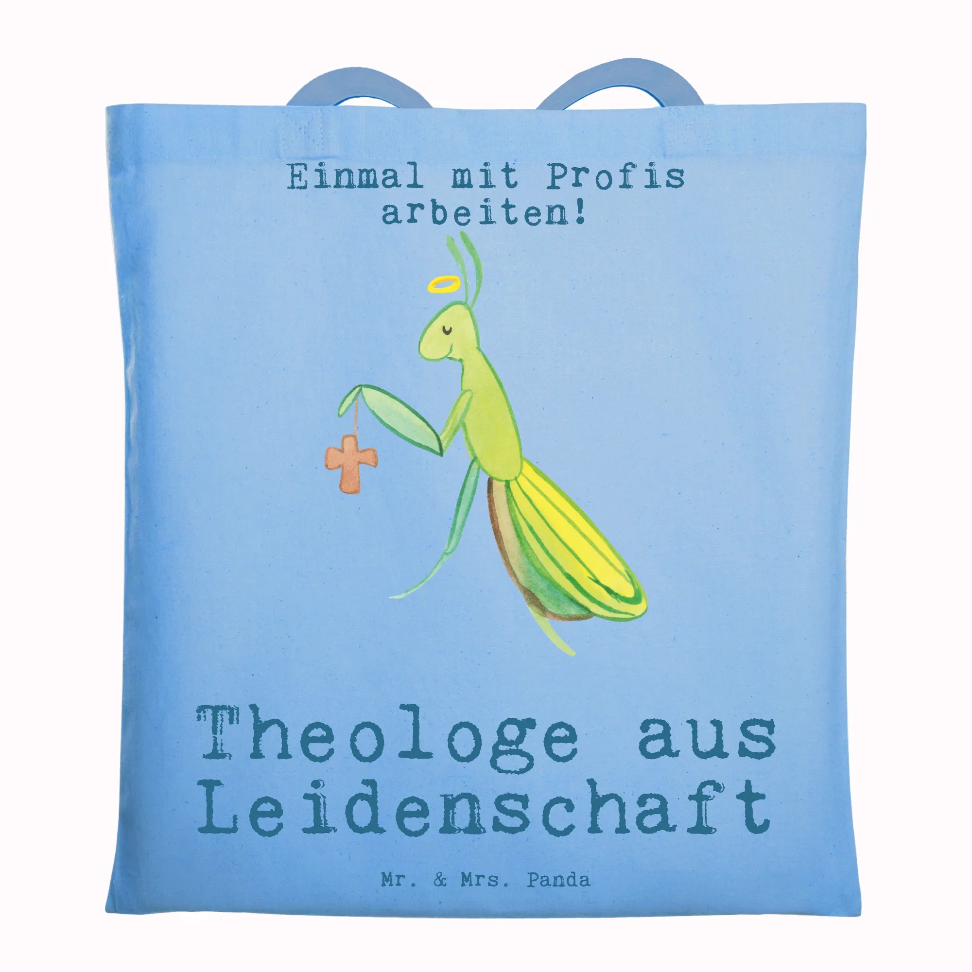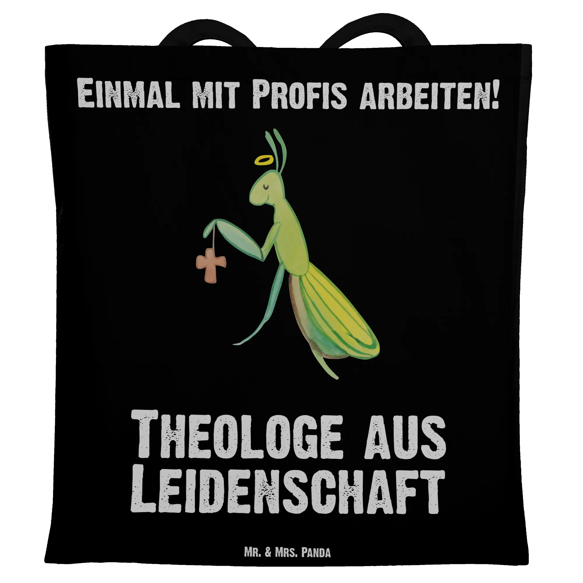 Theologe aus Leidenschaft - süße Gottesanbeterin mit Heiligenschein und Kreuz