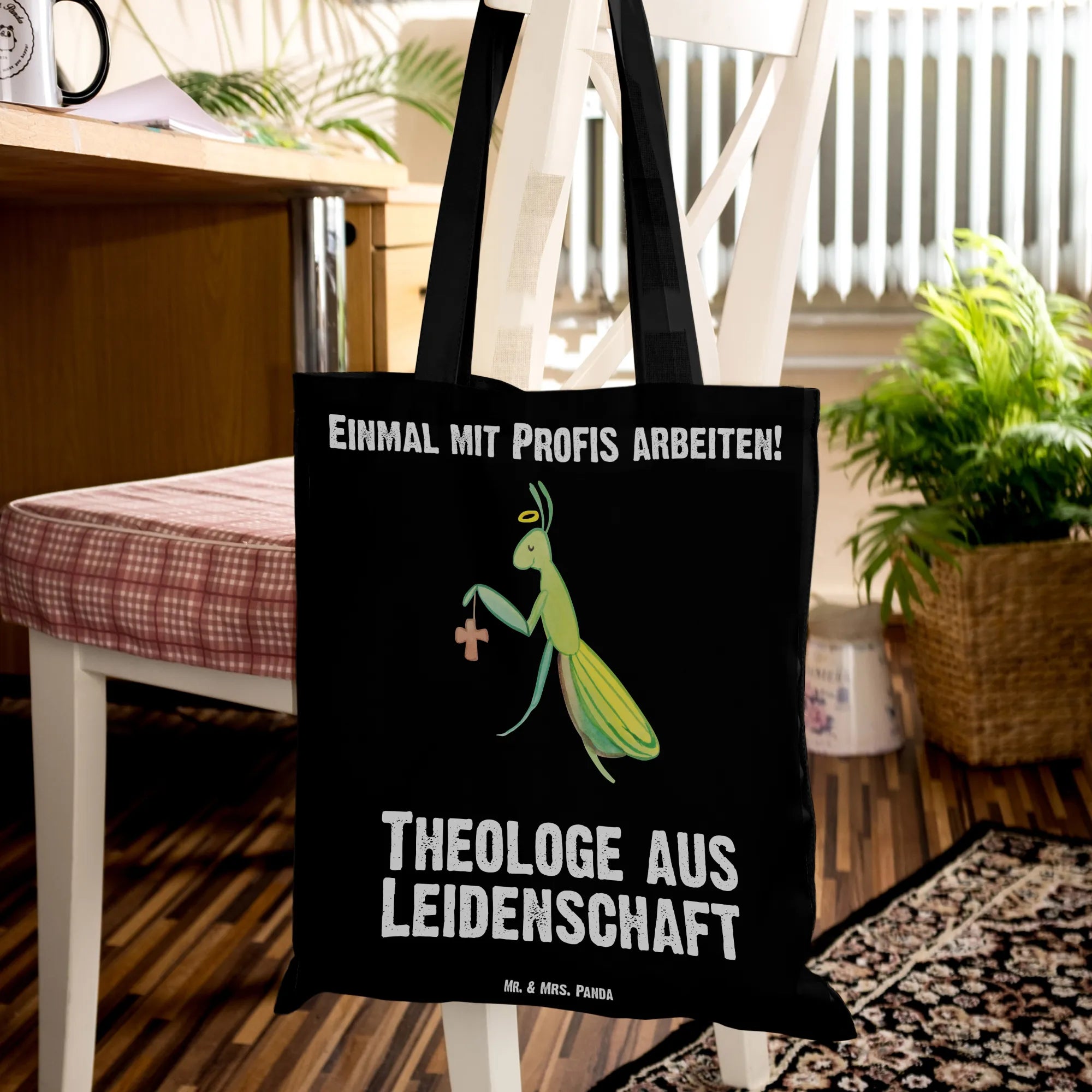 Theologe aus Leidenschaft - dekorative Gottesanbeterin mit symbolischen Elementen