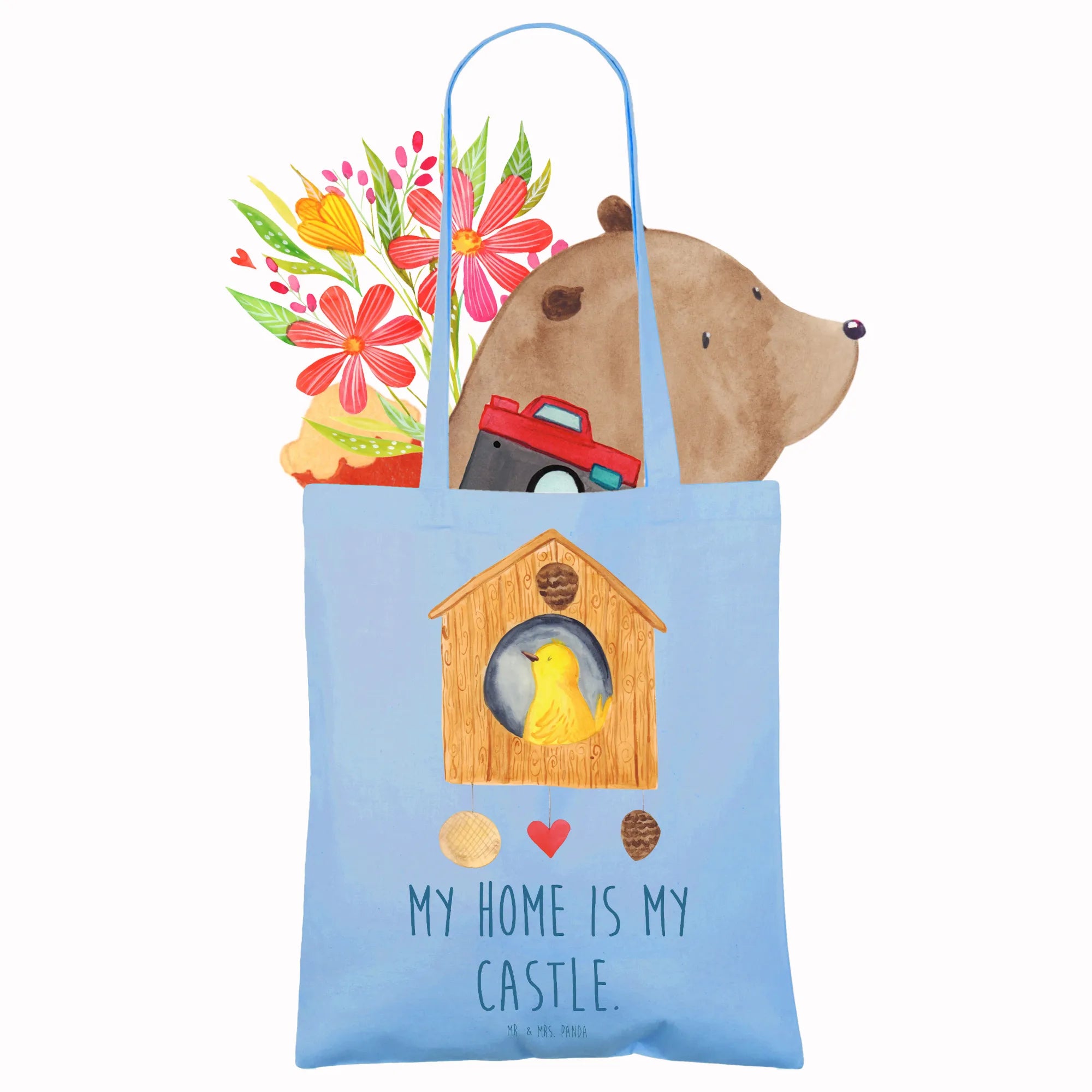 Die Tragetasche Vogelhaus aus der Small World Kollektion von Mr. & Mrs. Panda ist ein liebevoll gestalteter Alltagsbegleiter. Auf einem sanften Himmelblau thront ein gelber Vogel in seinem Vogelhaus — ein Motiv, das von Mrs. Panda in Aquarell gezeichnet und detailreich gedruckt wurde. Die Tasche bringt Wärme und Ruhe in Deinen Alltag, egal ob beim Einkaufen, auf dem Weg zur Uni oder beim nächsten Festival.