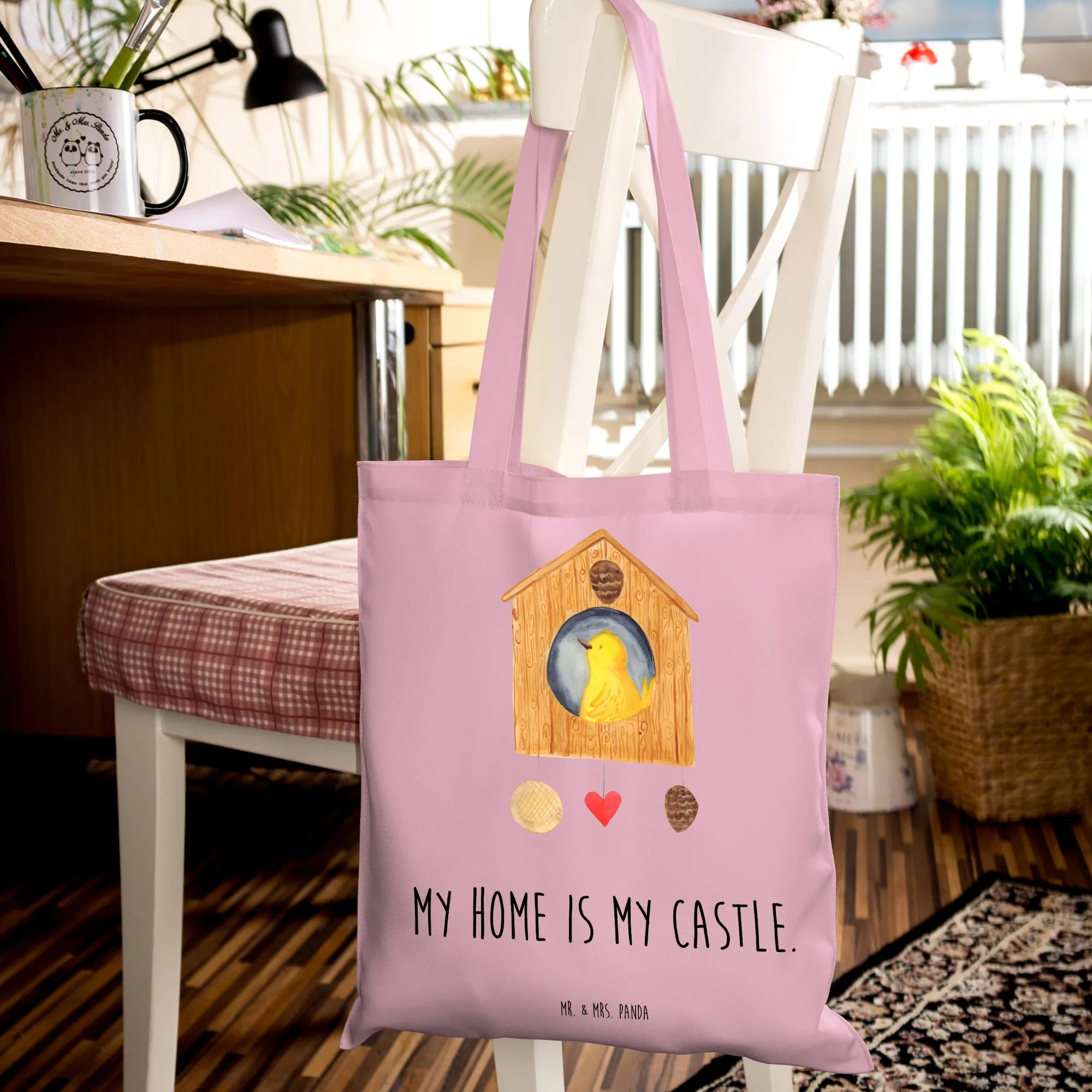 Stell dir einen goldgelben Vogel vor, der mit einem glückseligen Lächeln in seinem niedlichen Vogelhäuschen sitzt. Das Motiv 'My home is my castle' bringt zum Ausdruck, was dieses kleine Paradies für den Vogel bedeutet – ein Ort der Geborgenheit, Liebe und Wärme. Das Vogelhaus, umgeben von grünen Blättern, strahlt eine einladende Atmosphäre aus, als würde es sagen: 'Hier ist jeder willkommen, der nach Ruhe und Frieden sucht'. Der zufriedene Gesichtsausdruck des Vogels spricht Bände über sein Gefühl von Heimat und Zugehörigkeit. Mit diesem entzückenden Design erinnert uns Mr. & Mrs. Panda daran, dass es nicht darauf ankommt, wie groß unser Haus ist, sondern wie viel Liebe in ihm steckt. Ein Lieblingsort, ein Schloss, unser kleines, aber feines Eigenheim - das ist, was wahre Zufriedenheit ausmacht.