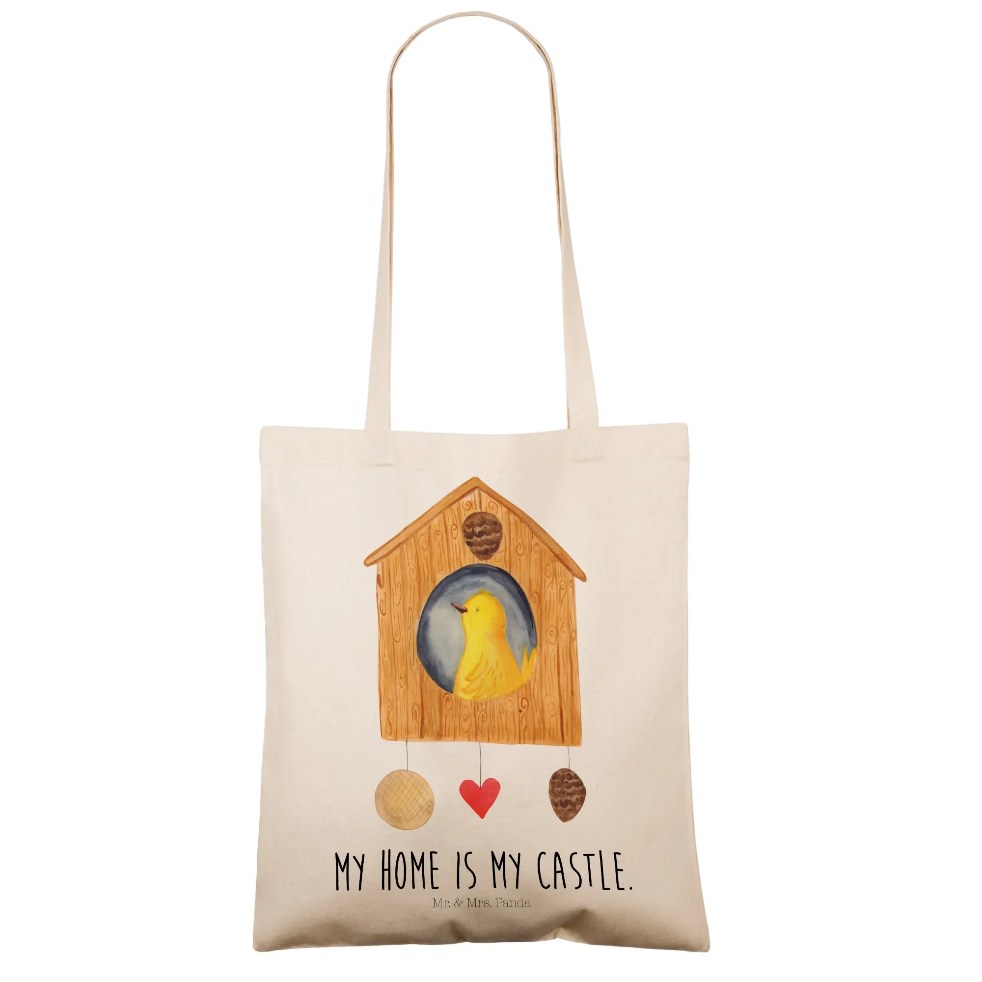 Diese bezaubernde Tragetasche aus der Small World Kollektion zeigt ein süßes Vogelhaus mit einem zufriedenen gelben Vogel und dem liebevollen Spruch „My home is my castle.“ Das liebevoll in Aquarell gestaltete Motiv bringt Wärme und gute Laune in deinen Alltag.