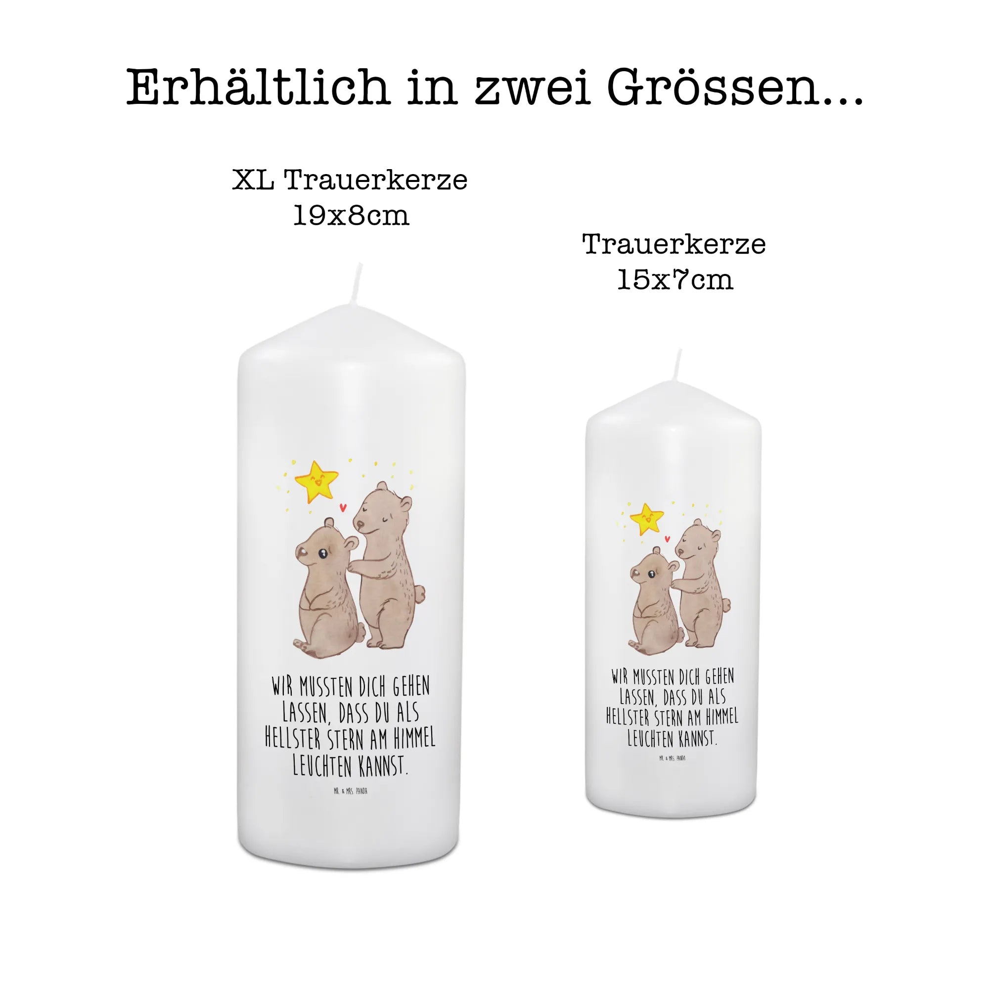 Sie ist aus hochwertigem Paraffinwachs gefertigt und hat eine ultralange Brenndauer, die es dir ermöglicht, auch über einen längeren Zeitraum hinweg in stiller Ehrfurcht zu gedenken. Die Kerze wurde mit einem einfühlsamen Motiv gestaltet: eine traurige Mama Bär, die zu den Sternen schaut, während Papa Bär sie tröstet. Beide symbolisieren das Gefühl der Trauer und die Hoffnung, dass das verlorene Leben nun als hellster Stern am Himmel leuchtet.