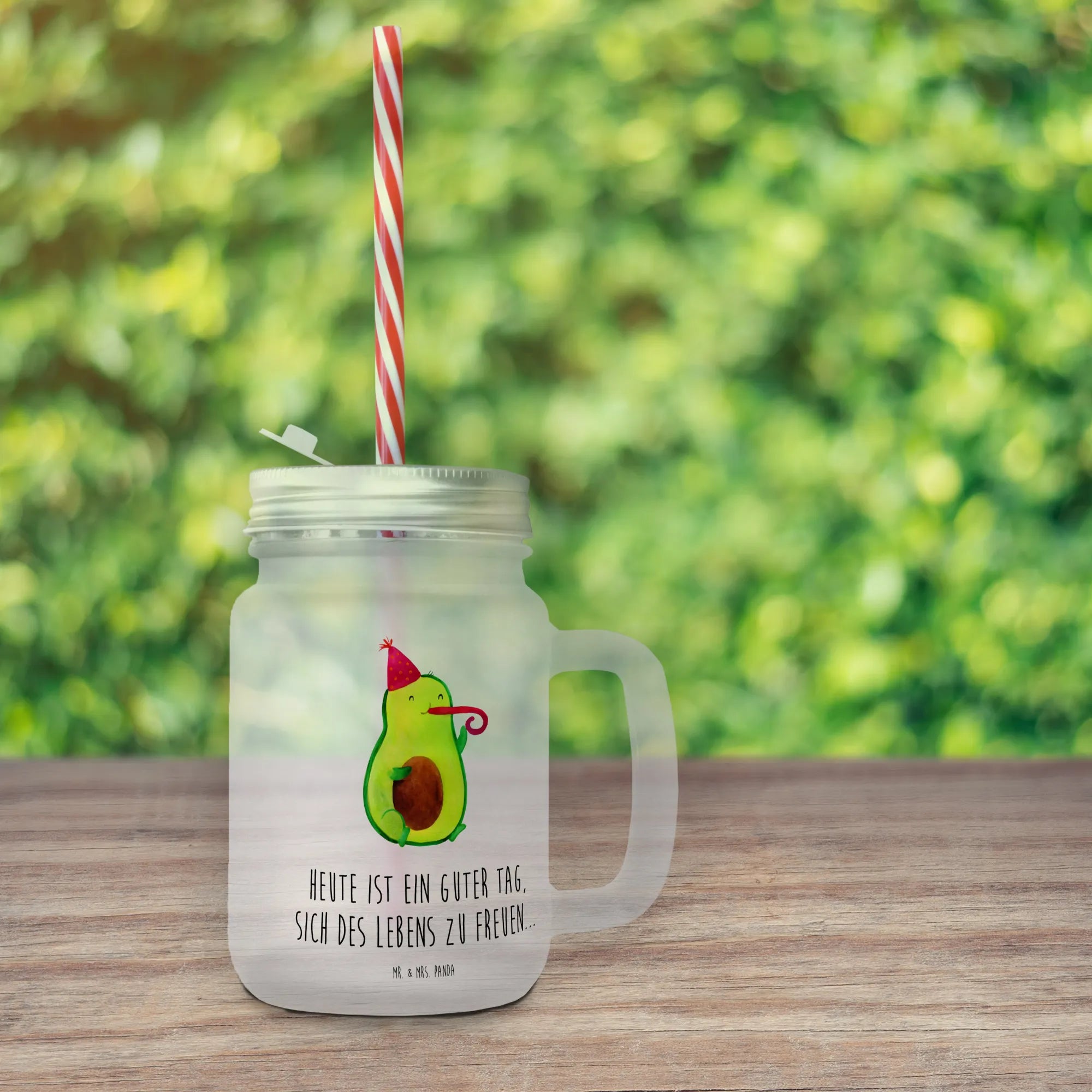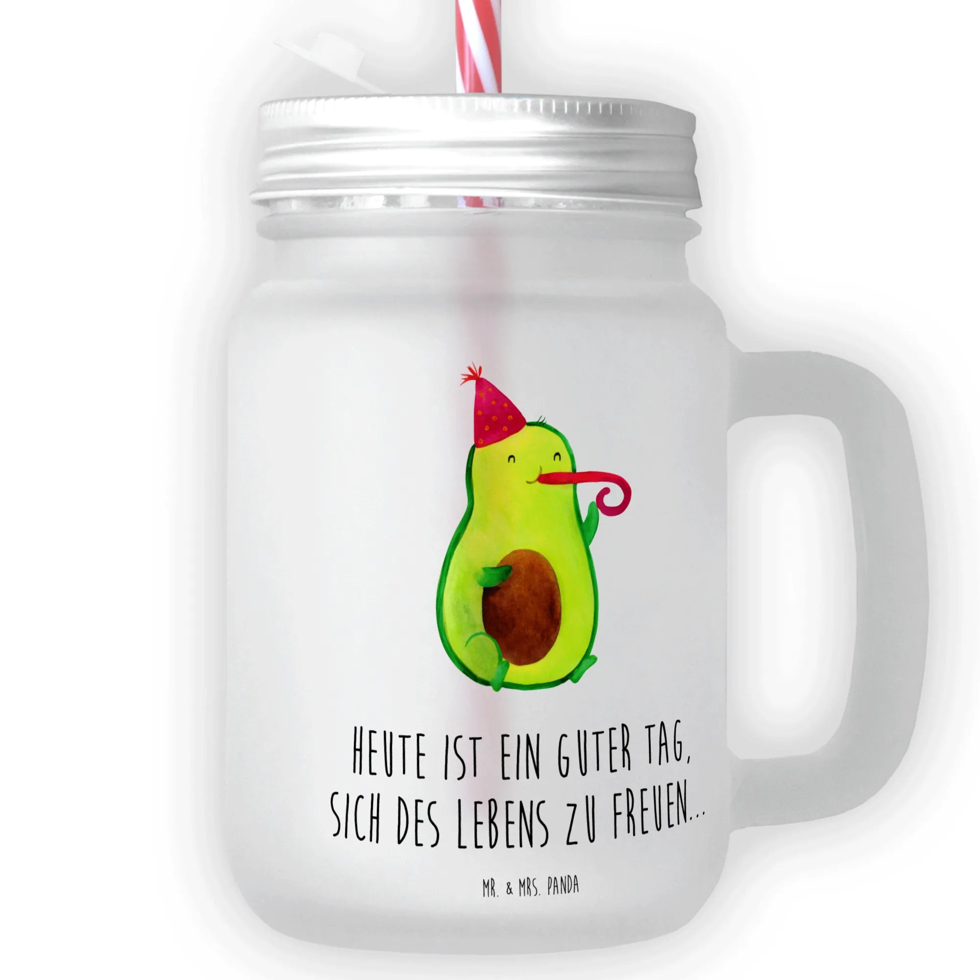 Das wunderschöne Trinkglas Mason Jar mit dem fröhlichen Motiv Avocado Partyhupe ist das perfekte Geschenk für alle, die das Leben mit einem Lächeln genießen möchten. Dieses erlesene und sommerliche Trinkglas von Mr. & Mrs. Panda ist nicht nur praktisch, sondern auch ein echter Blickfang bei jeder Feierlichkeit!