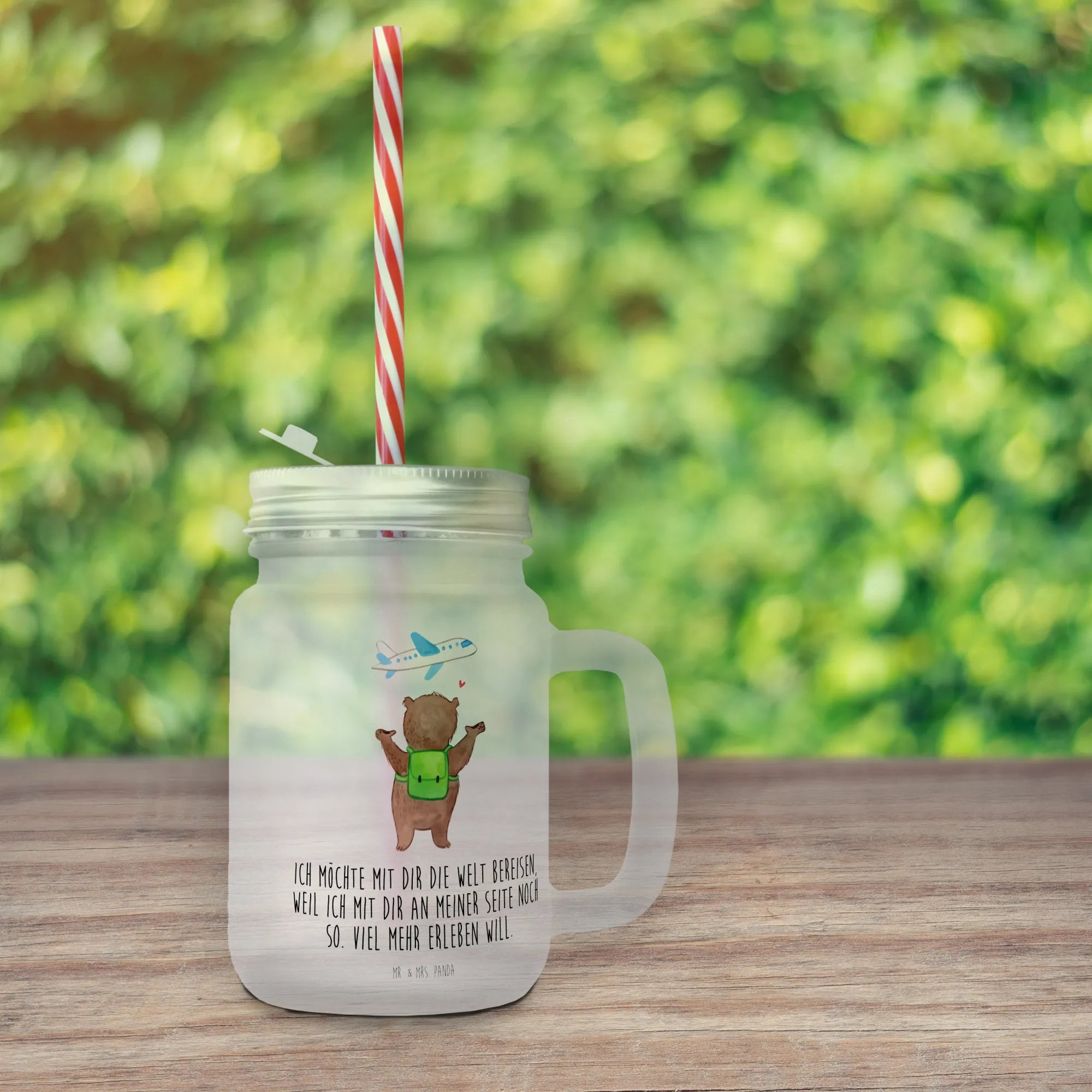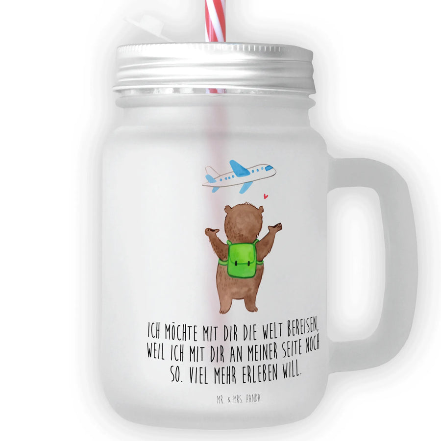 Dieses wunderschöne Trinkglas Mason Jar mit dem liebevollen Motiv "Bär Flugzeug" aus der Kollektion Liebe von Mr. & Mrs. Panda ist das perfekte Geschenk für all deine Liebsten. Stelle dir vor, wie du an einem sonnigen Sommernachmittag mit Freunden oder deiner besseren Hälfte im Garten sitzt, erfrischende Cocktails, selbstgemachte Limonade oder eisgekühlten Eistee genießt. Das satiniertes Premiumglas mit einem kratzfesten, matten Finish und einem praktischen Schraubdeckel schützt nicht nur den Inhalt vor Insekten und Schmutz, sondern sorgt auch dafür, dass du immer gut ausgerüstet bist für alle Sommerpartys. Mit einer Größe von 130 mm x 80 mm liegt dieses Trinkglas ordentlich in der Hand. Der inkludierte Mehrweg-Trinkhalm aus Kunststoff ist umweltfreundlich und macht das Trinken noch einfacher!