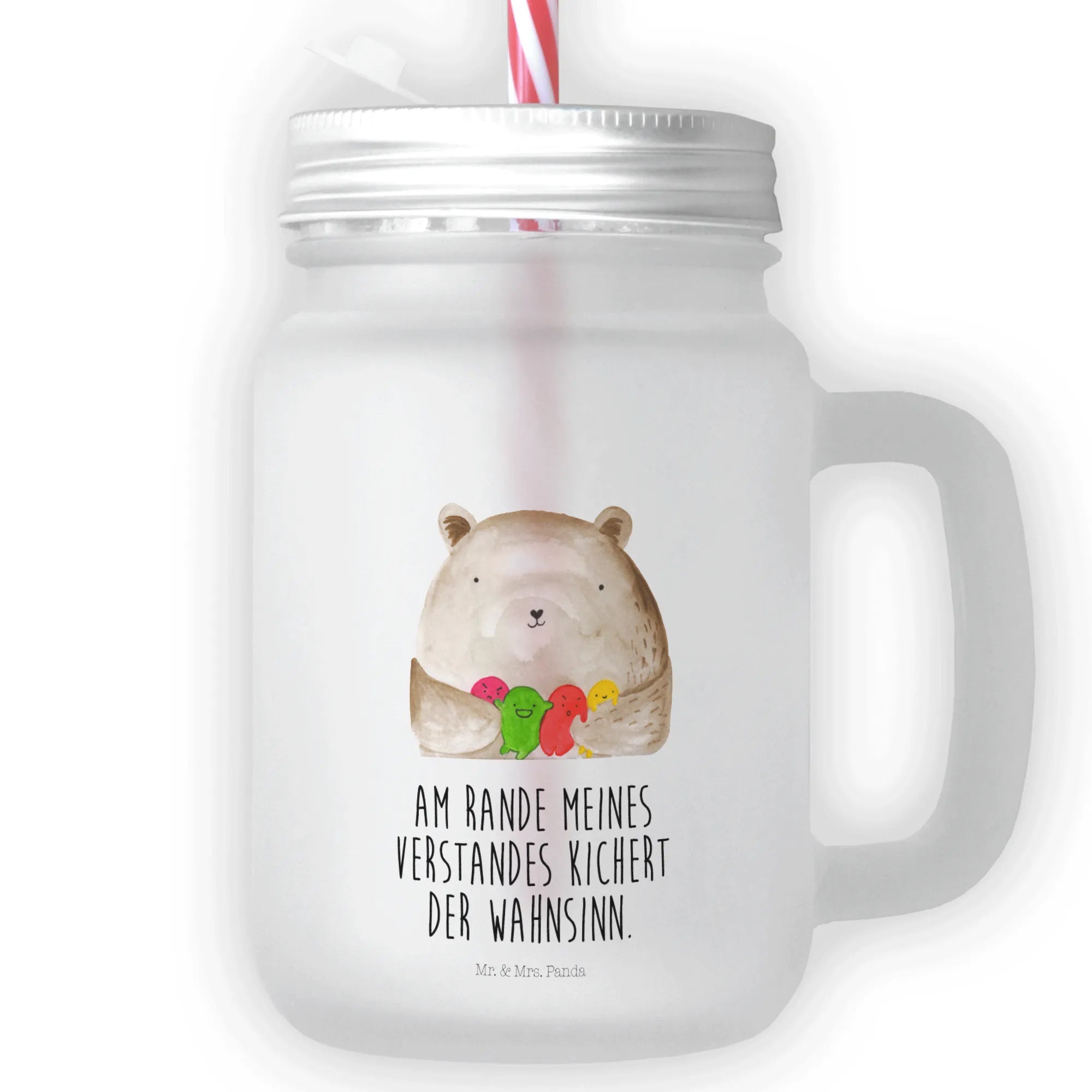 Entdecke das zauberhafte Trinkglas Mason Jar mit dem Gefühl-Motiv "Bär" von Mr. & Mrs. Panda! Dieses edle und sommerliche Trinkglas ist nicht nur ein praktischer Begleiter für kühle Getränke, sondern auch ein echter Blickfang auf jeder Sommerparty.