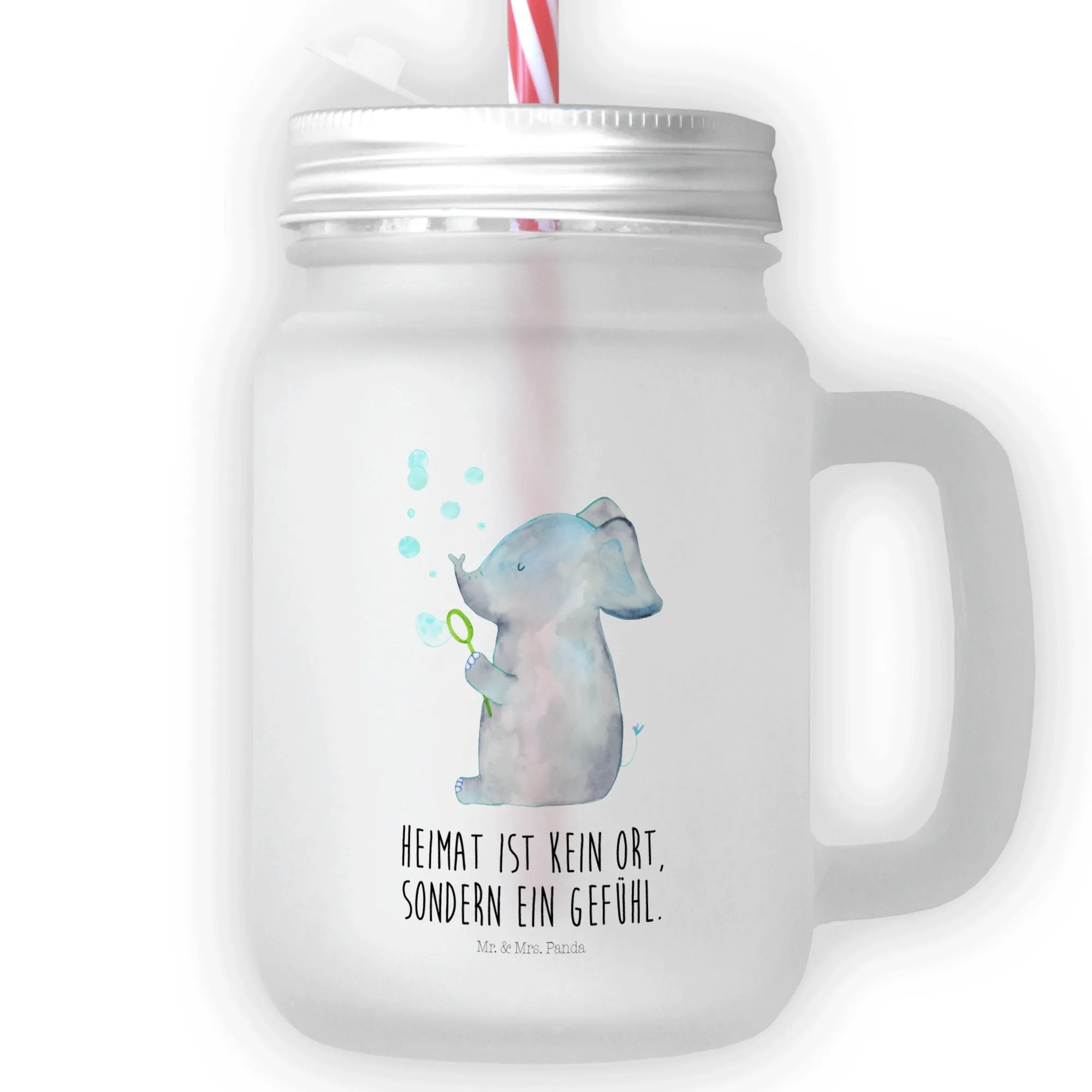 Dieses zauberhafte Mason Jar von Mr. & Mrs. Panda zeigt einen niedlichen Elefanten, der fröhlich Seifenblasen pustet und dabei den liebevollen Schriftzug „Heimat ist kein Ort, sondern ein Gefühl.“ trägt. Das handgezeichnete Aquarellmotiv verbreitet sofort gute Laune und lädt dazu ein, kleine Alltagsmomente bewusst zu genießen.