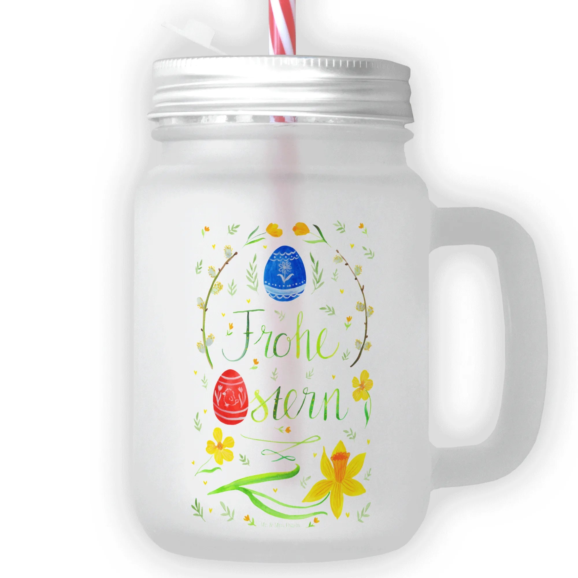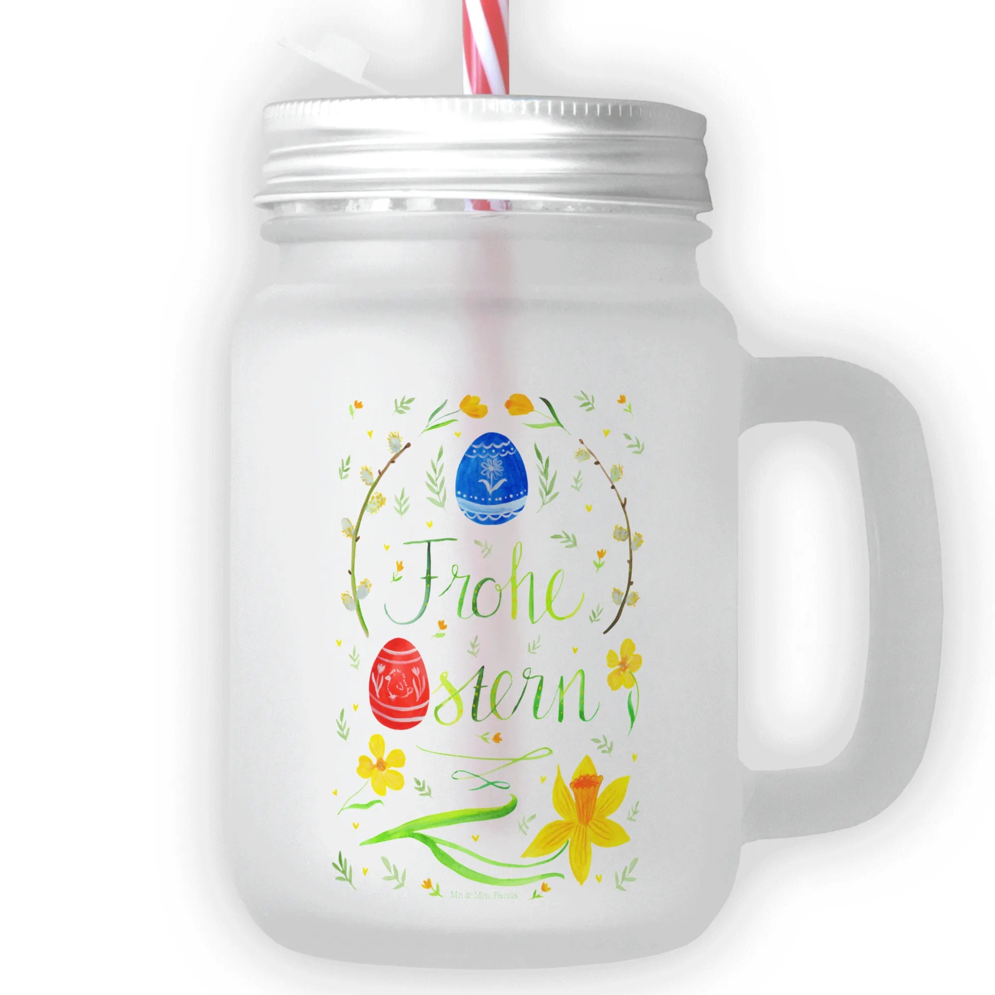 Das Trinkglas Mason Jar mit dem zauberhaften Motiv 'Frohe Ostern' von Mr. & Mrs. Panda ist der perfekte Begleiter für dein Osterfest! Dieses besondere Trinkglas, das aus hochwertigem satiniertem Glas gefertigt ist, verbindet stilvolles Design mit Funktionalität. Mit einem praktischen Schraubdeckel und einem robusten Mehrweg-Trinkhalm ausgestattet, ist es ideal für all deine Lieblingsgetränke – sei es selbstgemachte Limonade, erfrischendes Eistee oder köstliche Cocktails.