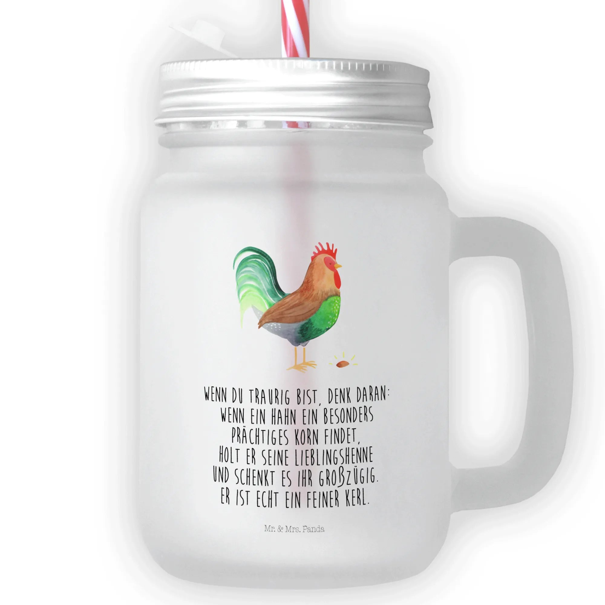 Unser Trinkglas Mason Jar mit dem wundervollen Motiv "Hahn mit Korn" aus der Bauernhof-Kollektion ist der perfekte Begleiter für all deine sommerlichen Getränke. Dieses edle und sommerliche Trinkglas von Mr. & Mrs. Panda hat nicht nur einen rustikalen Charme, sondern ist auch äußerst funktional. Aus hochwertigem, satiniertem dickwandigem Premiumglas gefertigt, bietet es eine matte Oberfläche, die angenehm in der Hand liegt. Mit einem stabilen Schraubdeckel schützt es deine Köstlichkeiten vor Insekten und Schmutz und macht es somit ideal für den Einsatz im Freien, sei es bei einer Gartenparty, einem Picknick oder beim gemütlichen Grillen auf der Terrasse.