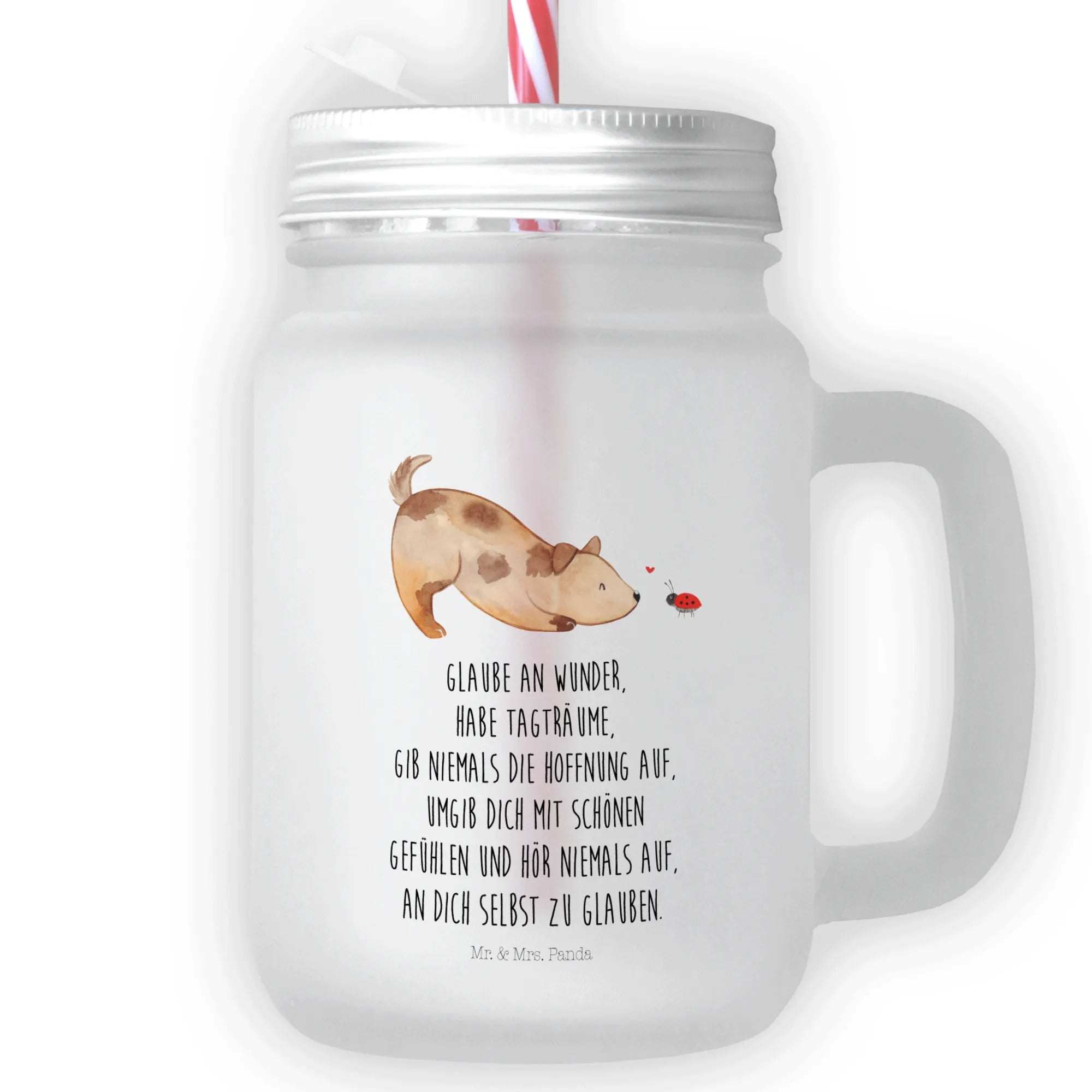 Entdecke das zauberhafte Trinkglas Mason Jar mit dem niedlichen Motiv Hund Marienkäfer aus der Hunde Kollektion von Mr. & Mrs. Panda! Dieses edle, satiniertes Glas ist nicht nur ein echter Hingucker, sondern auch praktisches Accessoire für jeden Tag. Perfekt geeignet für erfrischende Kaltgetränke, Cocktails, selbstgemachte Limonaden oder Eistees.