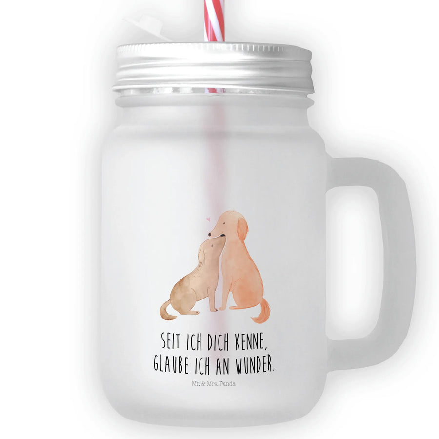 Entdecke das liebevoll gestaltete Trinkglas Mason Jar "Hunde Liebe" aus der exklusiven Hunde Kollektion von Mr. & Mrs. Panda! Dieses edle und sommerliche Trinkglas ist nicht nur funktional, sondern auch ein wahrer Hingucker für jeden Hundeliebhaber. Mit dem süßen Motiv von zwei kuschelnden Hunden und dem spritzigen Spruch "Seit ich dich kenne, glaube ich an Wunder" zaubert es jedem ein Lächeln ins Gesicht.
