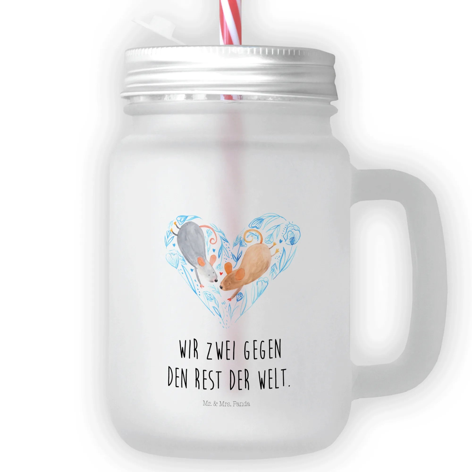 Das Trinkglas Mason Jar mit dem niedlichen Mäuse Herz-Motiv von Mr. & Mrs. Panda ist das perfekte Geschenk für alle Verliebten! ❤️ Ob zum Jahrestag, zur Verlobung oder zur Hochzeit, dieses edle und sommerliche Trinkglas bringt Liebe in jeden Schluck.