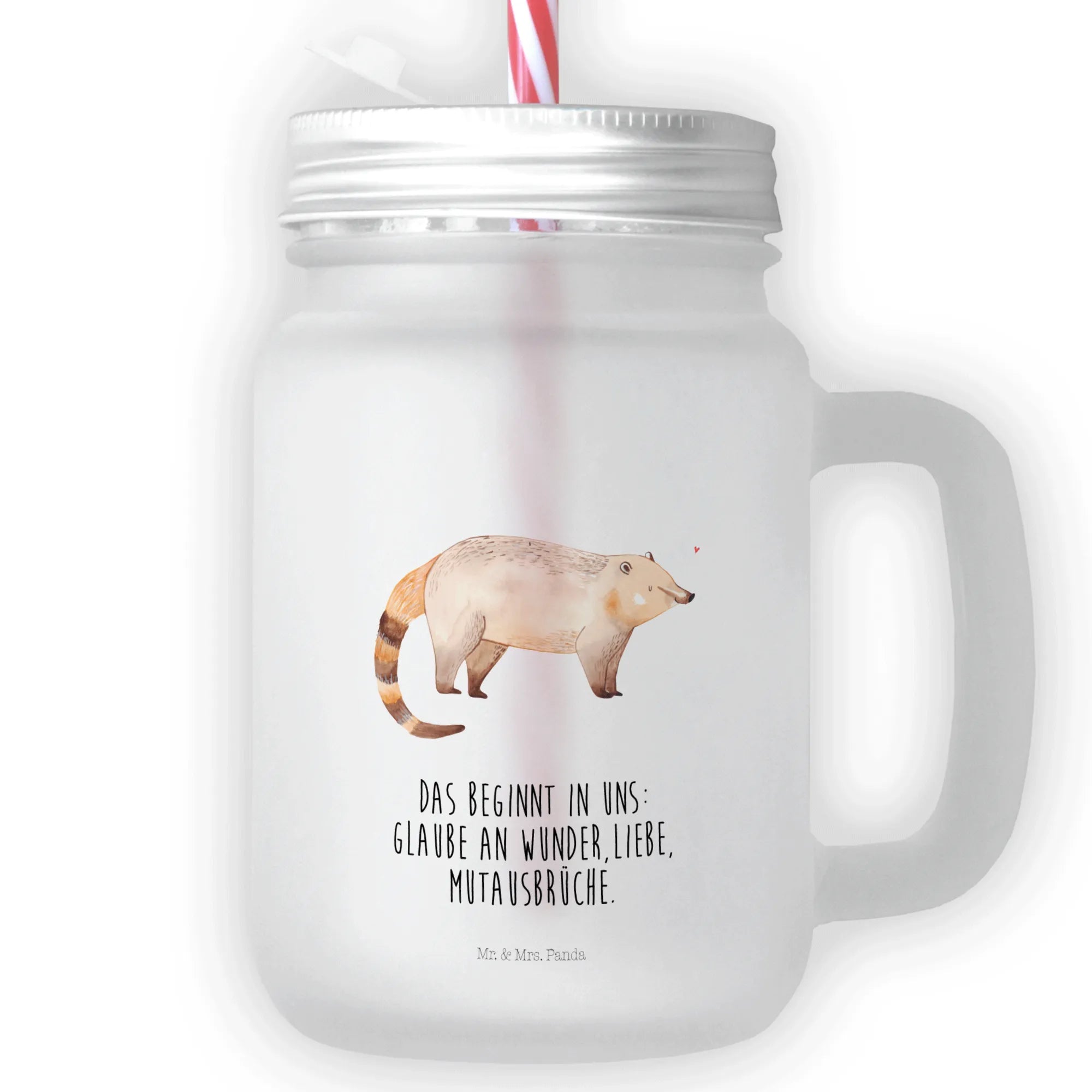 Das edle Trinkglas Mason Jar mit dem süßen Nasenbär-Motiv aus der Small World Kollektion von Mr. & Mrs. Panda ist der perfekte Begleiter für warme Sommertage und festliche Anlässe. Mit seinem liebevoll handgezeichneten Design, das in sanften Brauntönen gehalten ist, bringt es gute Laune in jede Runde.