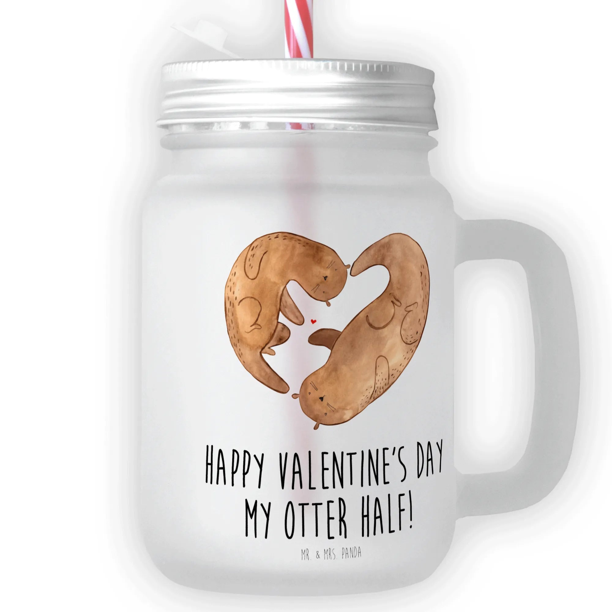 Entdecke das zauberhafte Trinkglas Mason Jar mit dem liebevollen Motiv "Otter Valentine" von Mr. & Mrs. Panda! Dieses edle und sommerliche Trinkglas kombiniert Funktionalität mit einem Hauch von Romantik und ist das perfekte Geschenk für Verliebte.