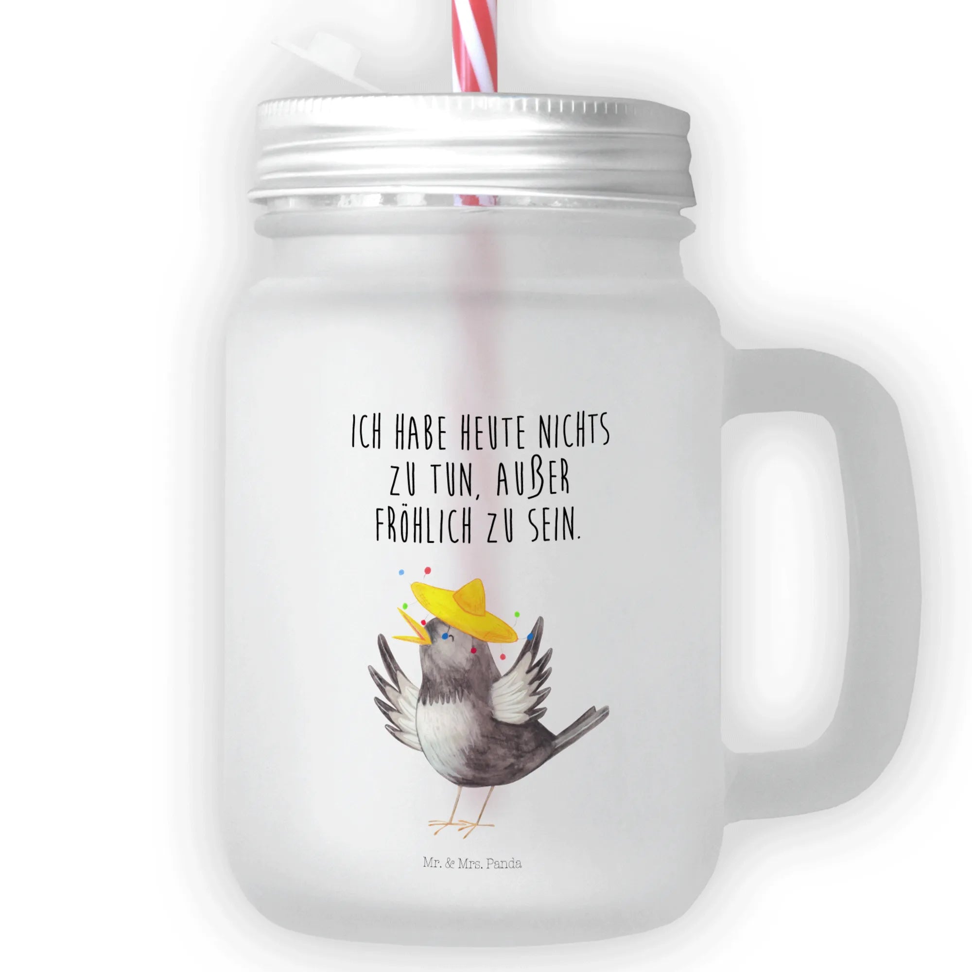 Das edle und sommerliche Trinkglas Mason Jar mit dem fröhlichen Motiv 'Rabe mit Sombrero' von Mr. & Mrs. Panda zaubert dir sofort ein Lächeln ins Gesicht! Mit seinem fröhlichen Spruch 'Ich habe heute nichts zu tun, außer fröhlich zu sein.' bringt dieses bezaubernde Glas nicht nur gute Laune, sondern auch das richtige Ambiente auf jede Sommerparty.
