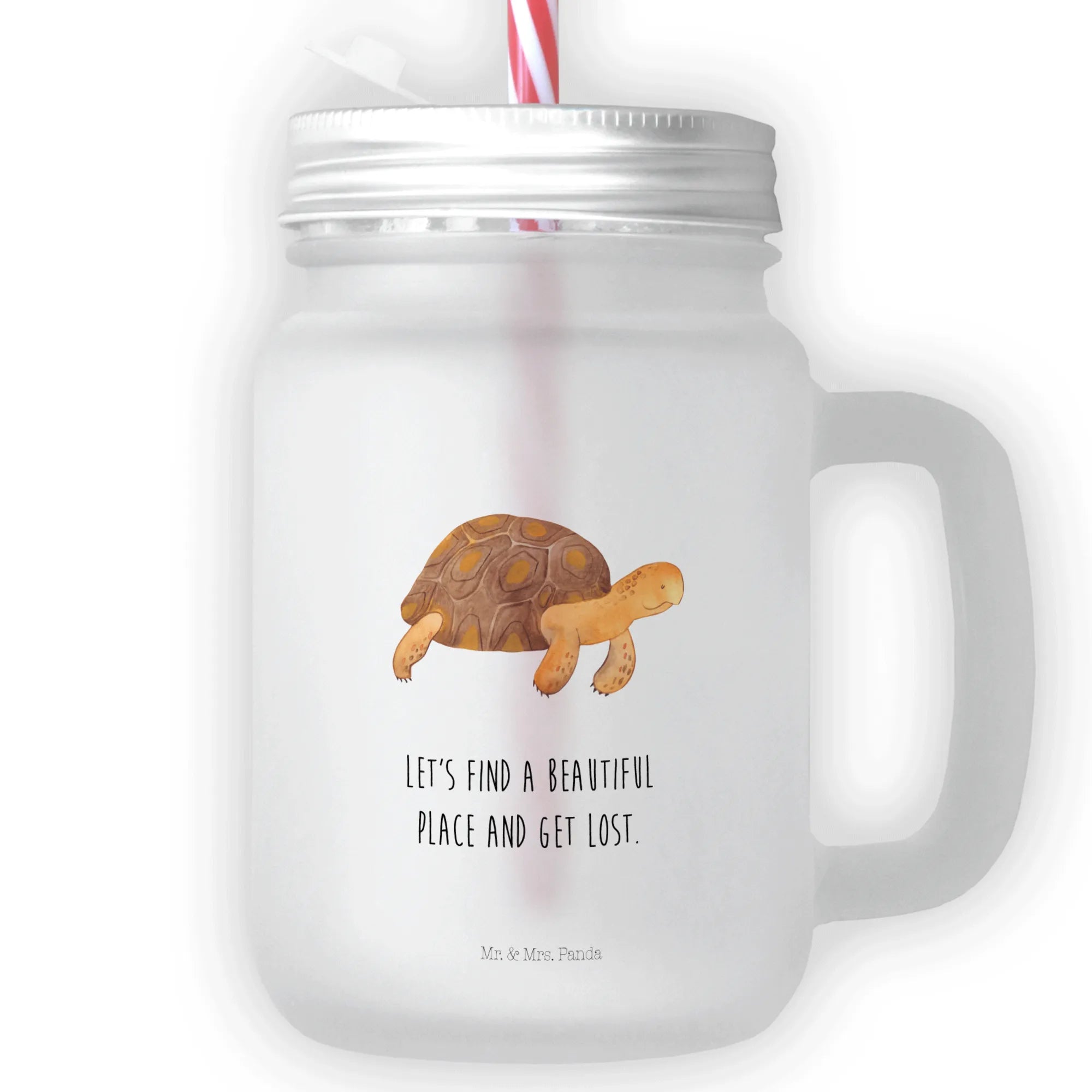 Dieses edle und sommerliche Trinkglas Mason Jar von Mr. & Mrs. Panda ist das perfekte Geschenk für all jene, die Abenteuer in ihrem Herzen tragen. Bedruckt mit dem niedlichen Motiv der Schildkröte, die langsam durch das Leben marschiert, und dem inspirierenden Spruch "Let's find a beautiful place and get lost", spricht dieses Trinkglas nicht nur die Sommerliebe, sondern auch die Sehnsucht nach weit entfernten Orten und neuen Abenteuern an.