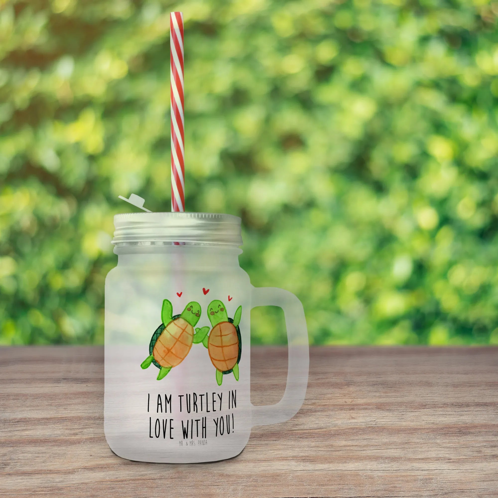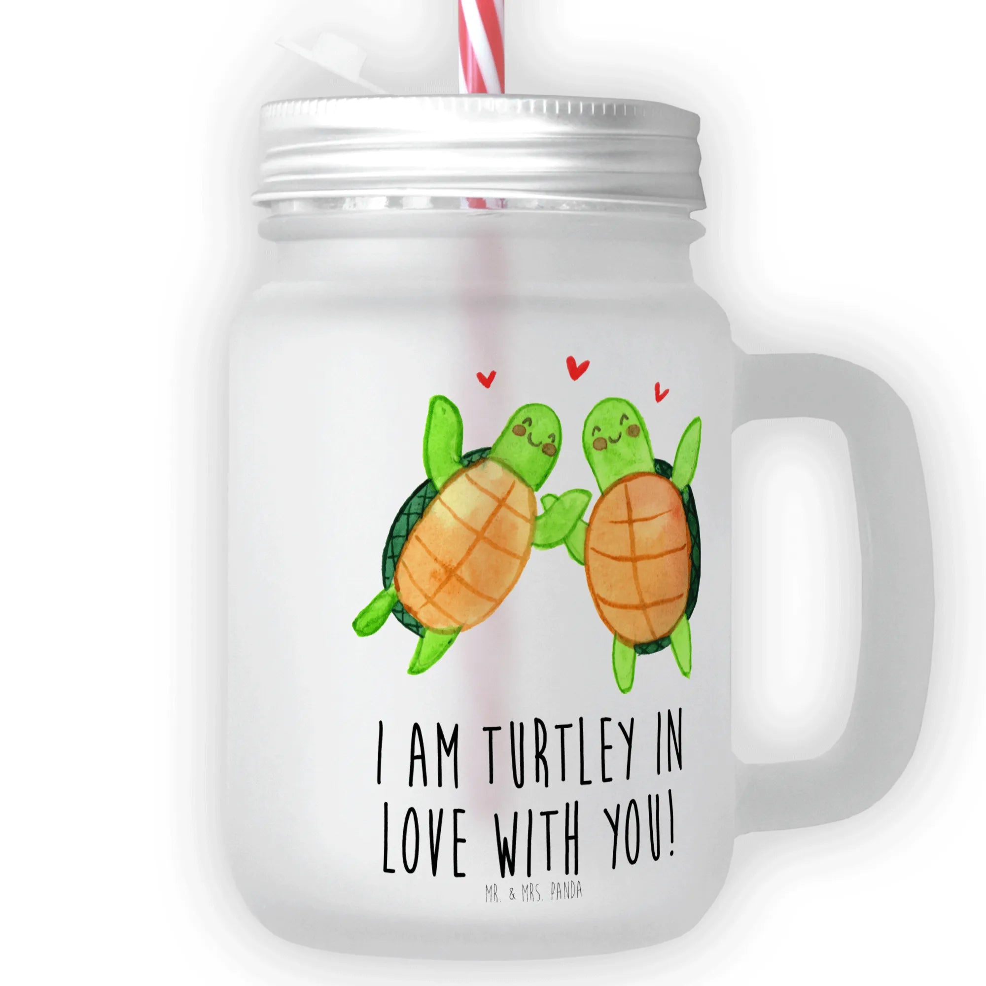 Das Trinkglas Mason Jar mit dem süßen Schildkröten Paar ist der perfekte Begleiter für all deine kalten Getränke im Sommer! Mit einem liebevollen Design und dem Spruch "I am turtley in love with you!" zaubert es ein Lächeln auf jedes Gesicht. Egal ob für Cocktails, selbstgemachte Limonade oder erfrischende Eistees – dieses edle, satiniertes Glas ist nicht nur praktisch, sondern auch ein wunderschönes Accessoire für jede Sommerparty.